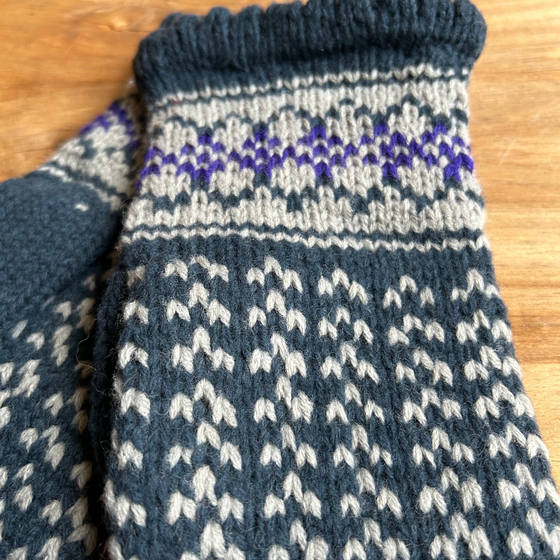 Rokām adīti sieviešu dūraiņi zilganzaļā krāsā ar pelēkiem un ziliem ornamentiem. Garums 26 cm, platums 10 cm.