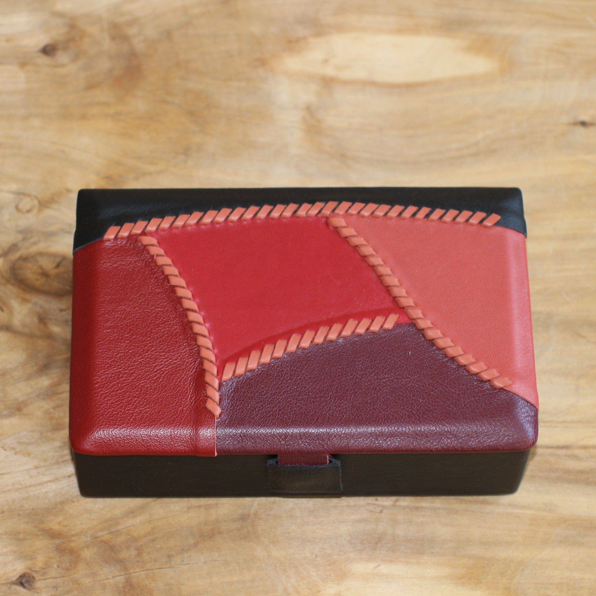 Tumši brūna dabīgās ādas kārba ar trīs toņu sarkanas krāsas ādas laukumiem uz kārbas vāka. Kārba ir tumši brūna ar dabīgo ādu apvilkta taisnstūra formas (~ pamats 21 x 13 cm / augstums 7 cm) dekoratīva kārba ar tumši brūnas zamšādas oderi, magnētisku aizdari un sarkanu toņu ādas gabalu kolāžu vāka virspusē ar dekoratīvu savienojumu nošuvumu.