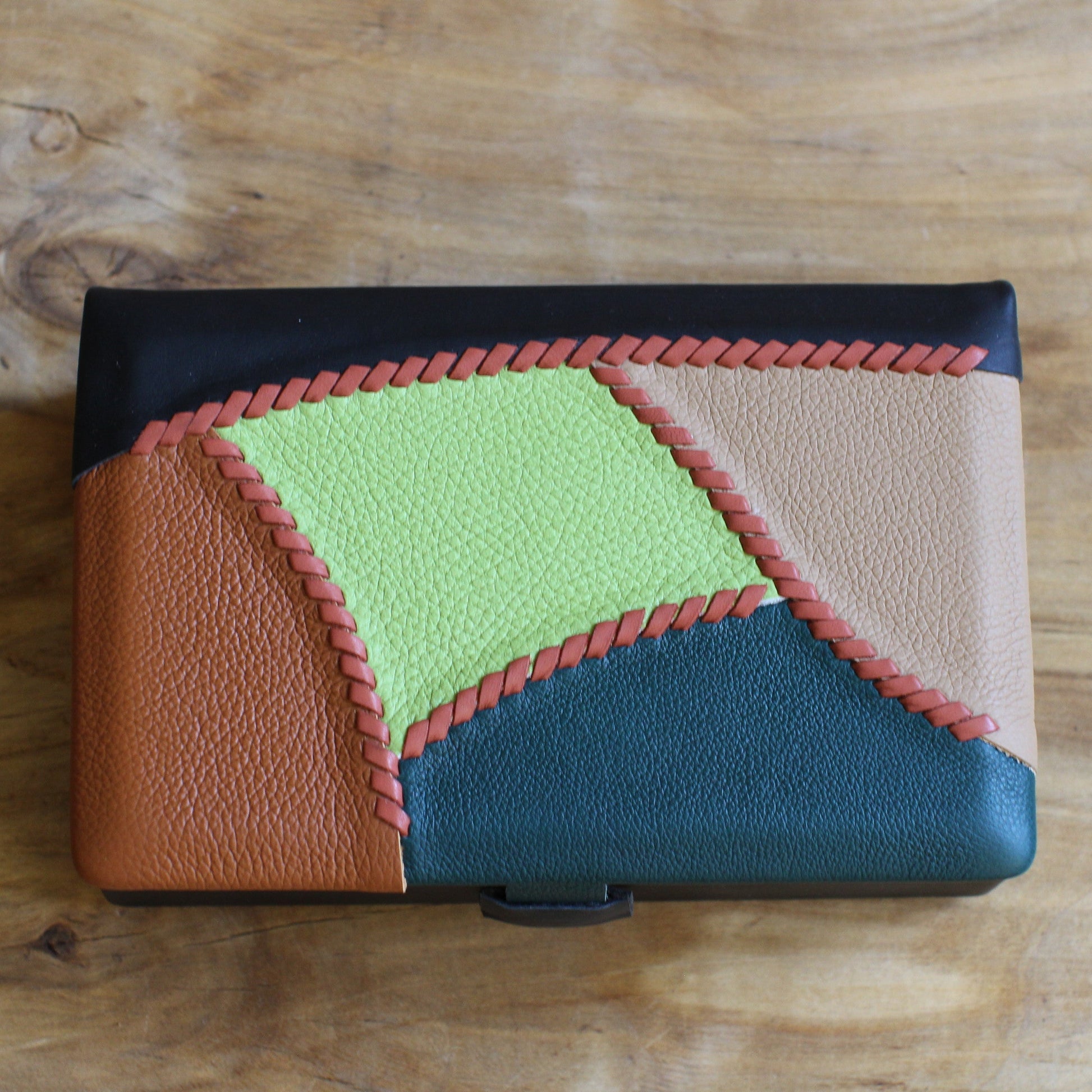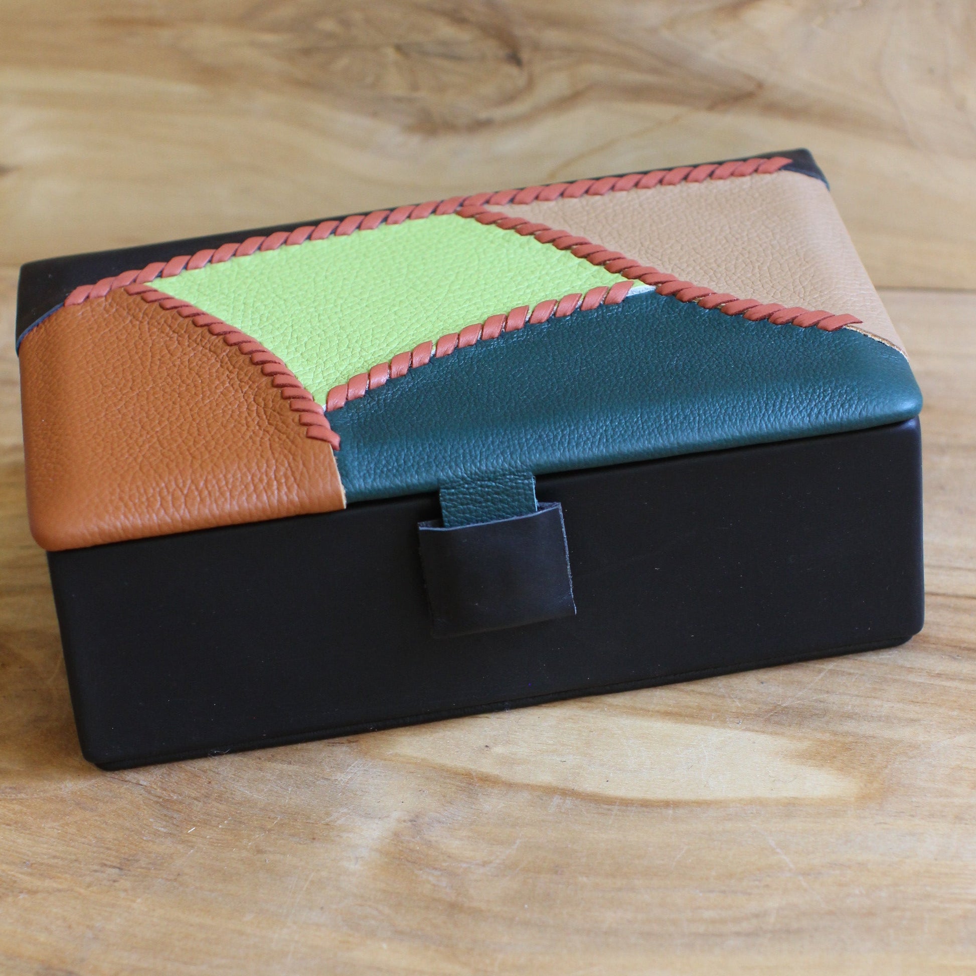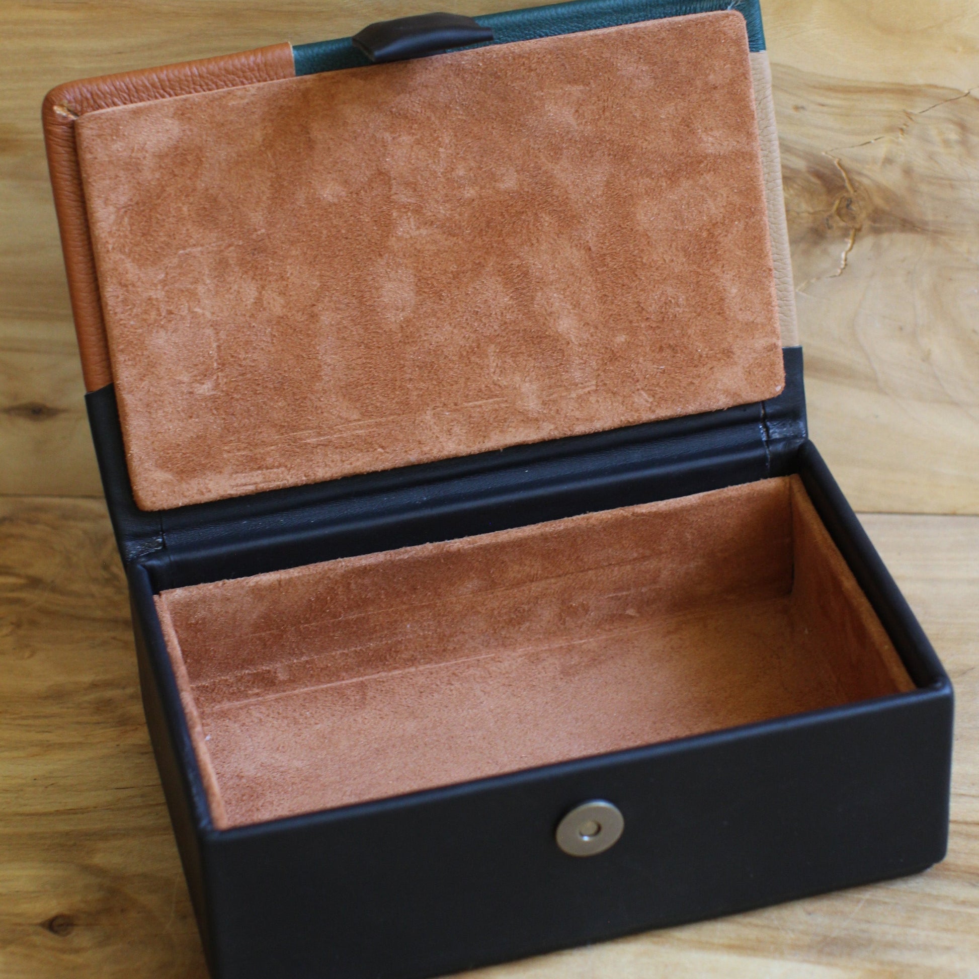 Brūna dabīgās ādas kārba ar divu toņu brūnu, zaļu, melnu vāku. Kārba ir tumši brūna ar dabīgo ādu apvilkta taisnstūra formas (~ pamats 21 x 13 cm / augstums 7 cm) dekoratīva kārba ar gaiši brūnas zamšādas oderi, magnētisku aizdari un brūni, zaļu ādas vāka virspusi ar dekoratīvu savienojumu nošuvumu.