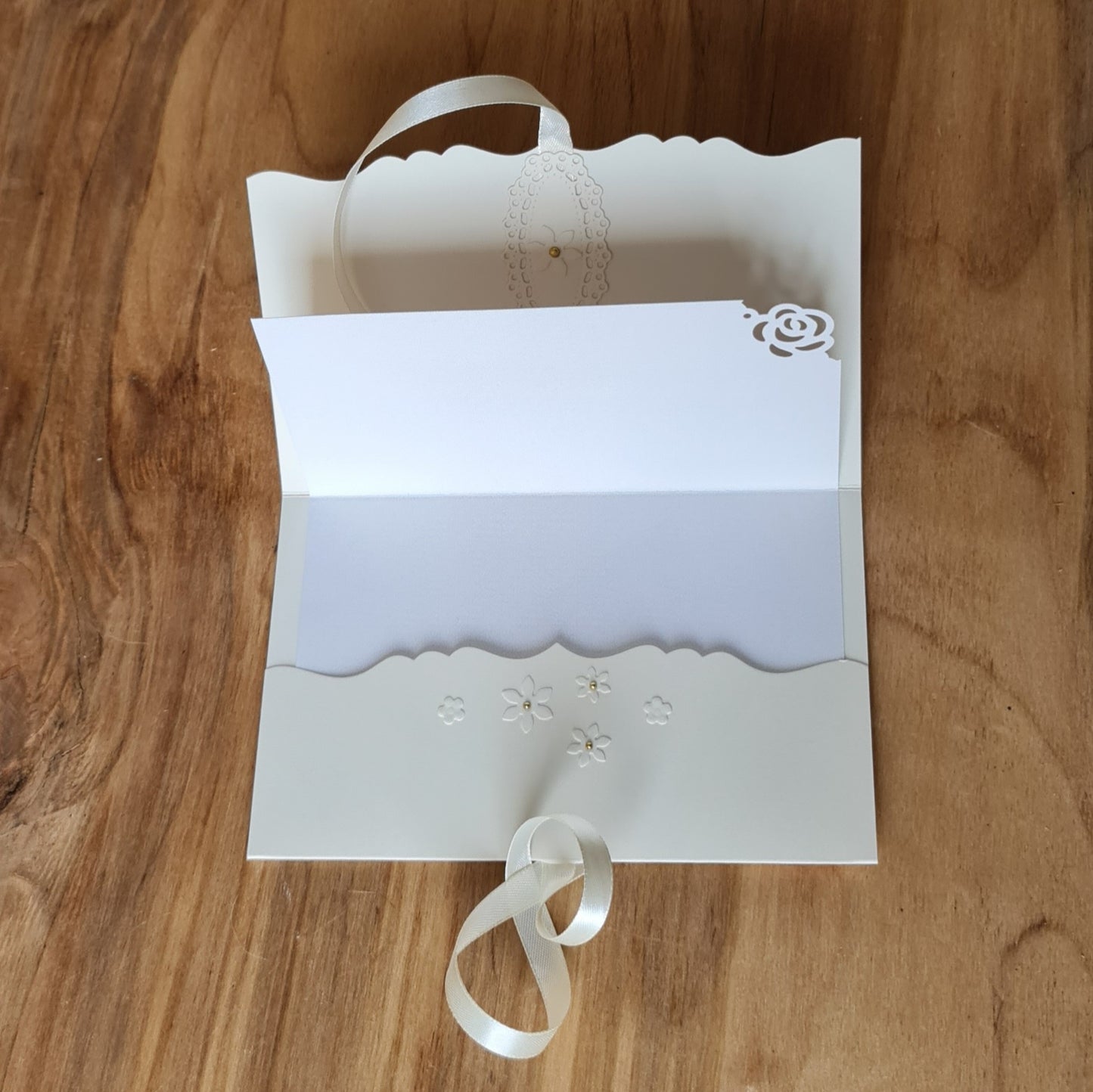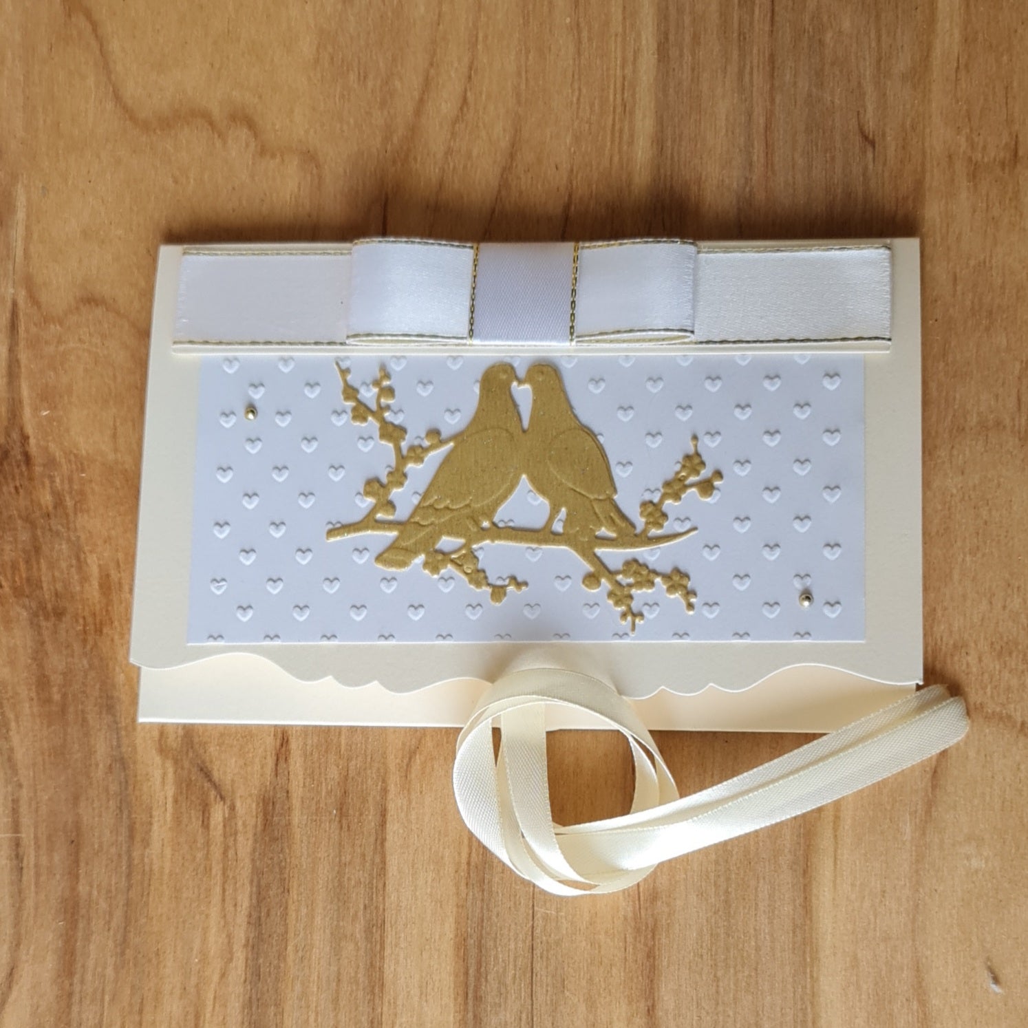 Dāvanu aploksne kremkrāsā kāzām ar 3D printu un diviem zelta baložiem un kremkrāsas lentas aizdari 11.5 x 18 cm (APU2)