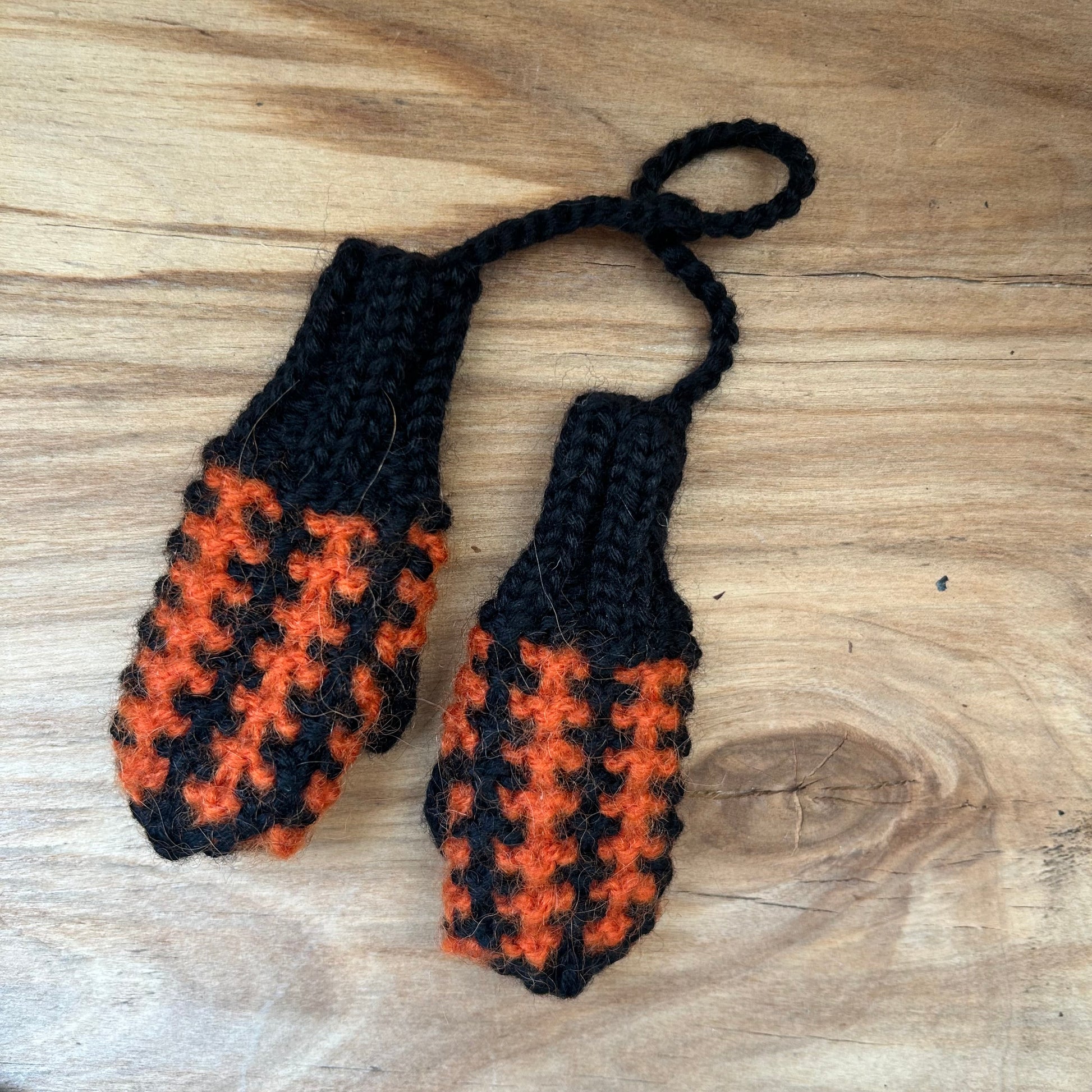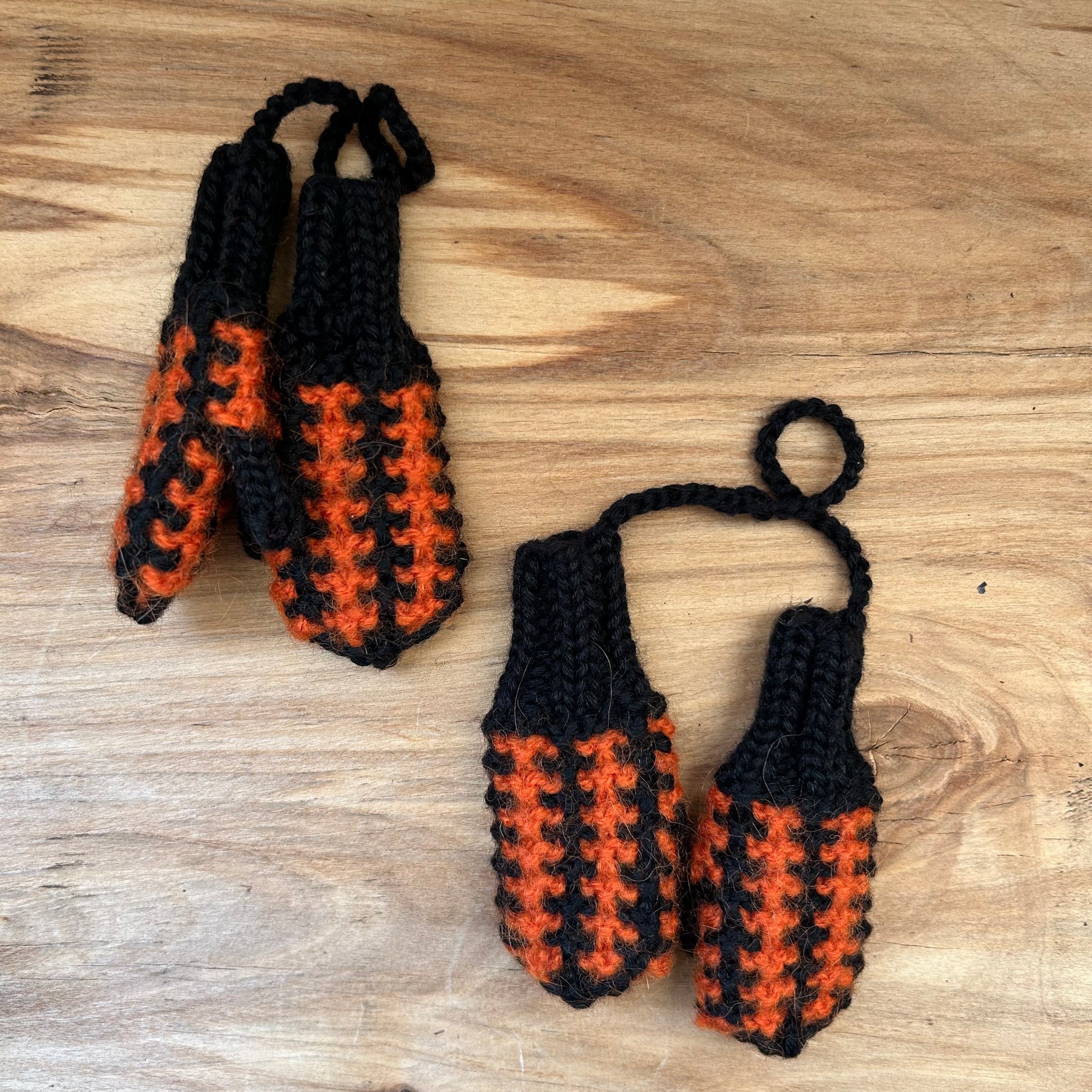 Rokām adīti dekoratīvi dūrainīši / auto piekariņš oranžs ar melnu . Cimdiņa augstums ~9,5cm / platums -3cm / aukliņa starp tiem ~13cm.