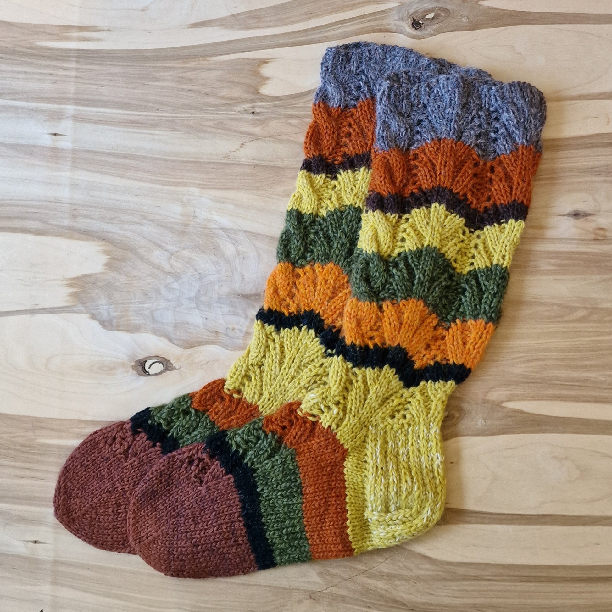 Rokām adītas pusgarās vilnas/mohēras zeķes 40.-42.izm. dzelteni/brūni/zaļos toņos ar viļņveida maliņu. Stulma augstums 29 cm / pēdas garums 26 cm.