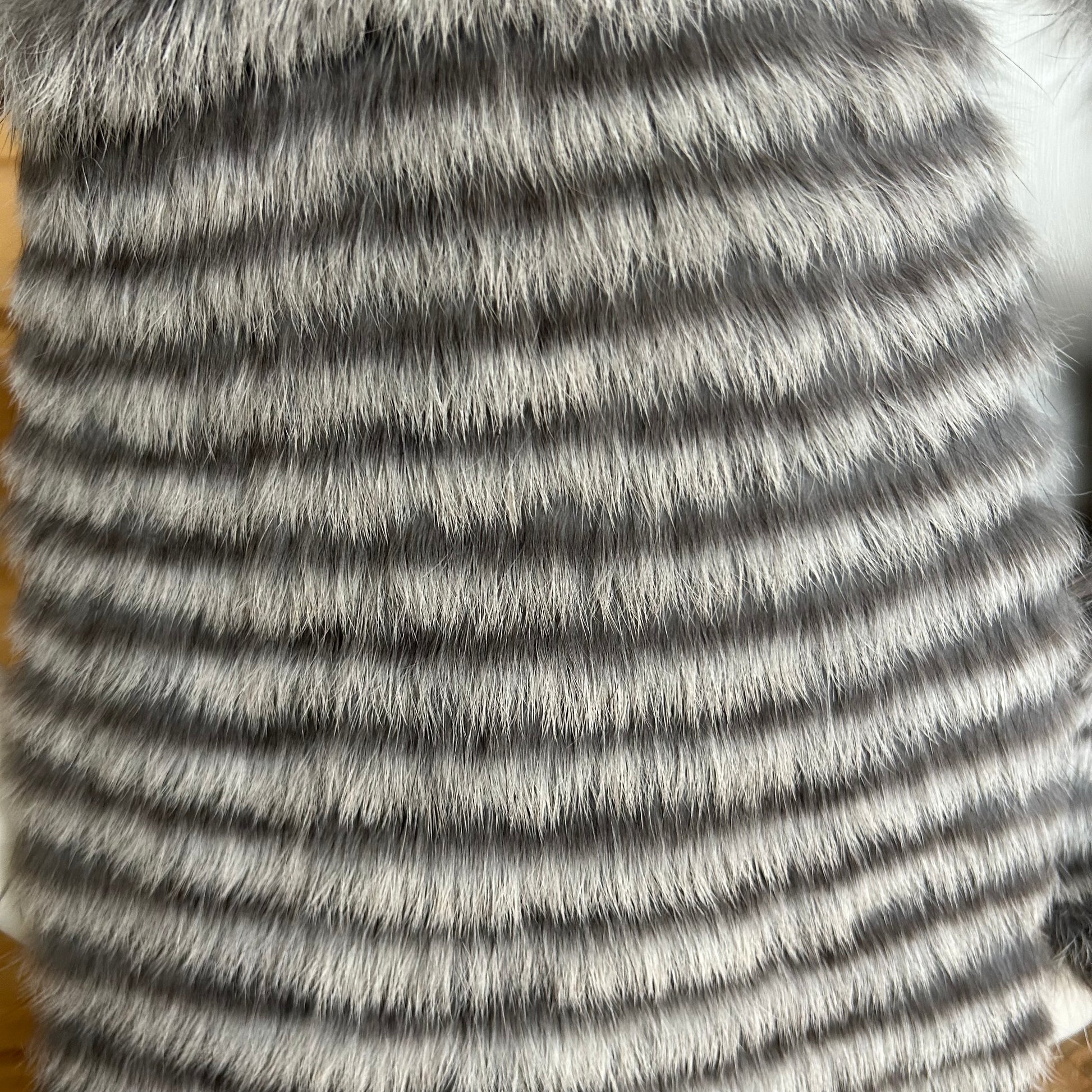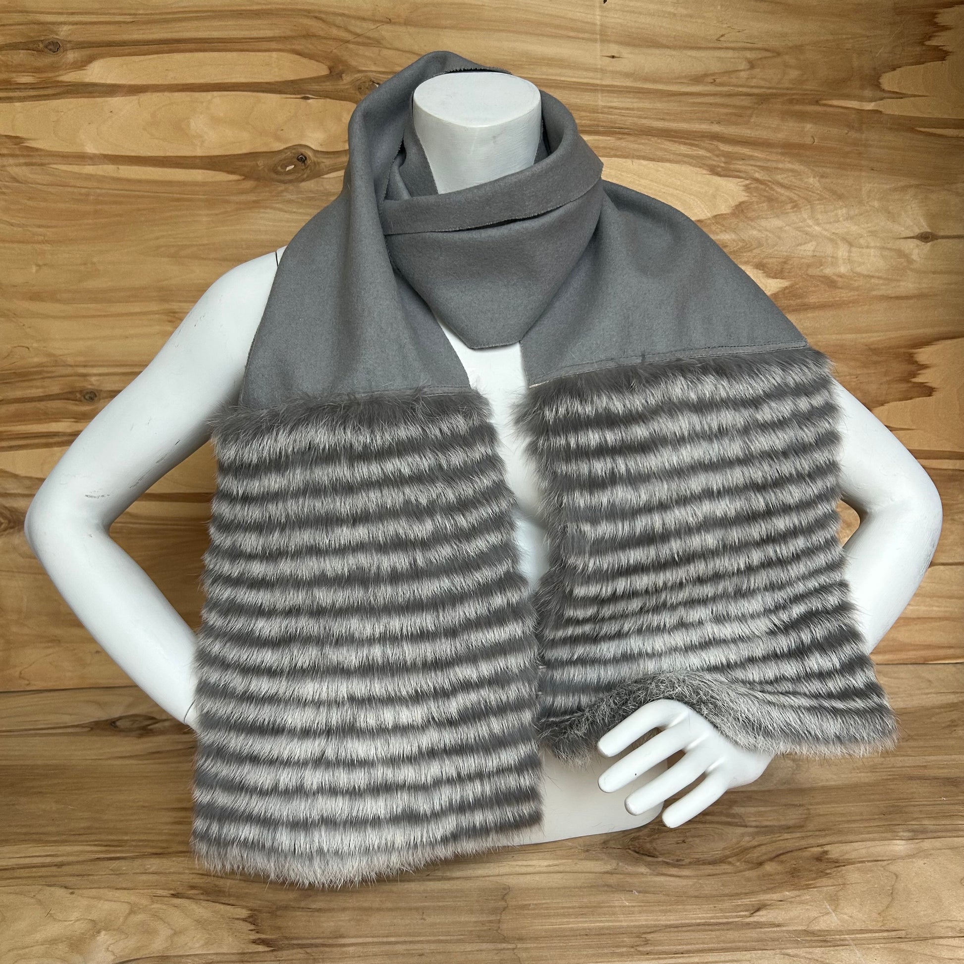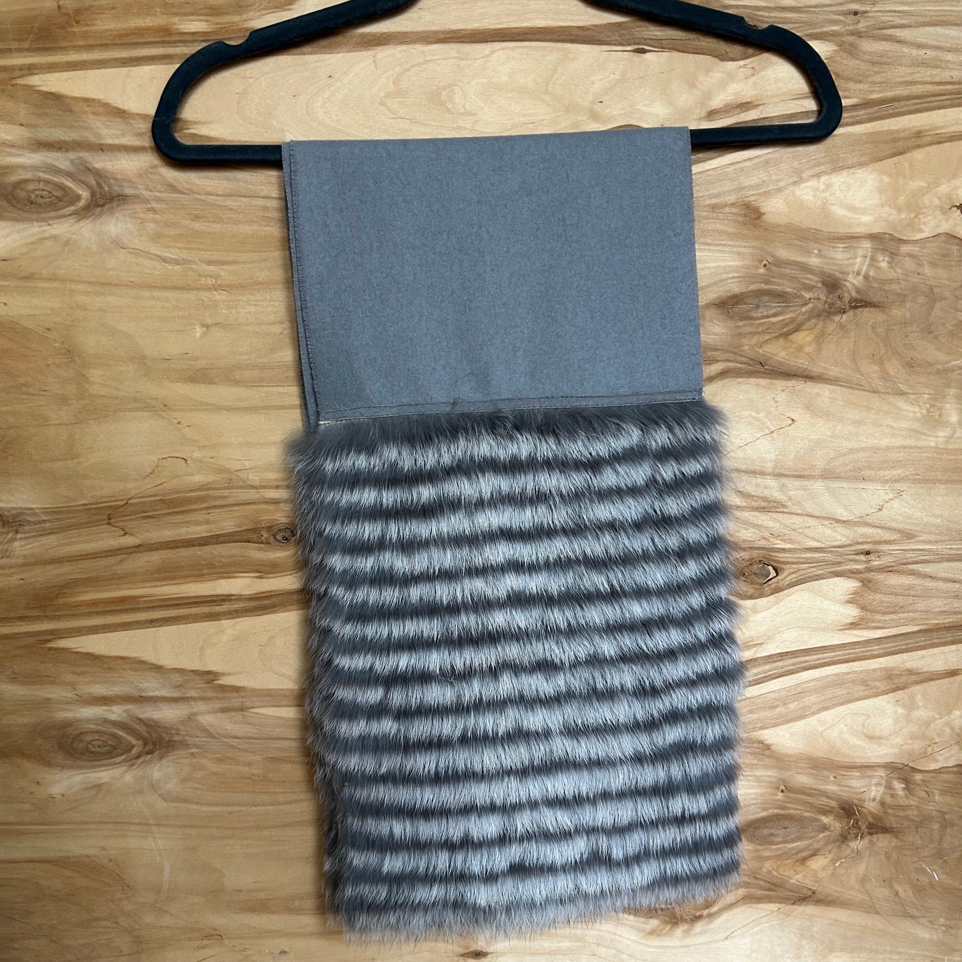Gaiši pelēka vilnas auduma šalle ar abpusēji dekoratīvām gaiši pelēkām truša vilnas malām.