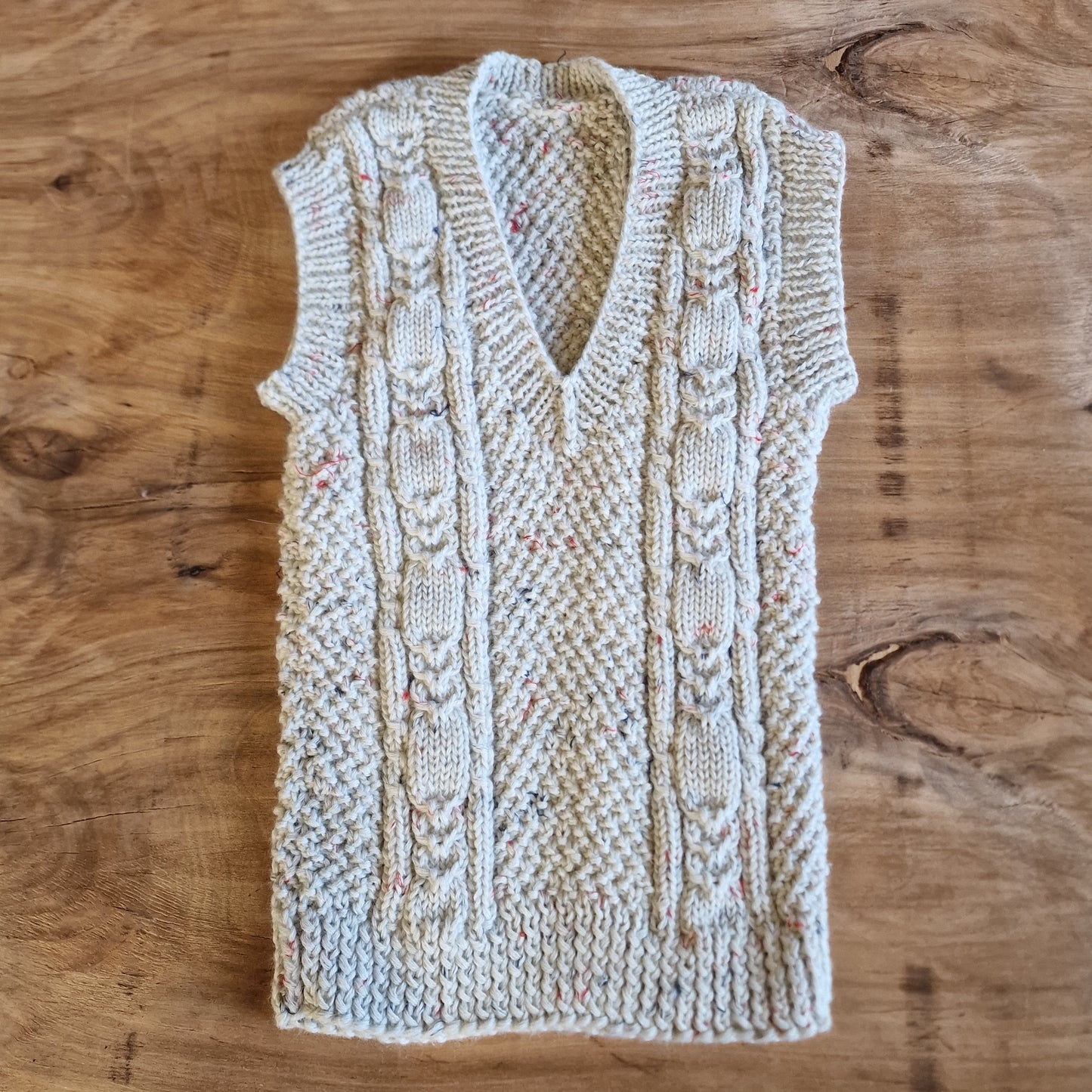 Gaiši pelēka ar ziliem un sarkaniem akcentiem rokām adīta bērnu (ap 92 cm) veste ar dekoratīviem pinumu rakstiem 42 x 23 cm (garums x platums).