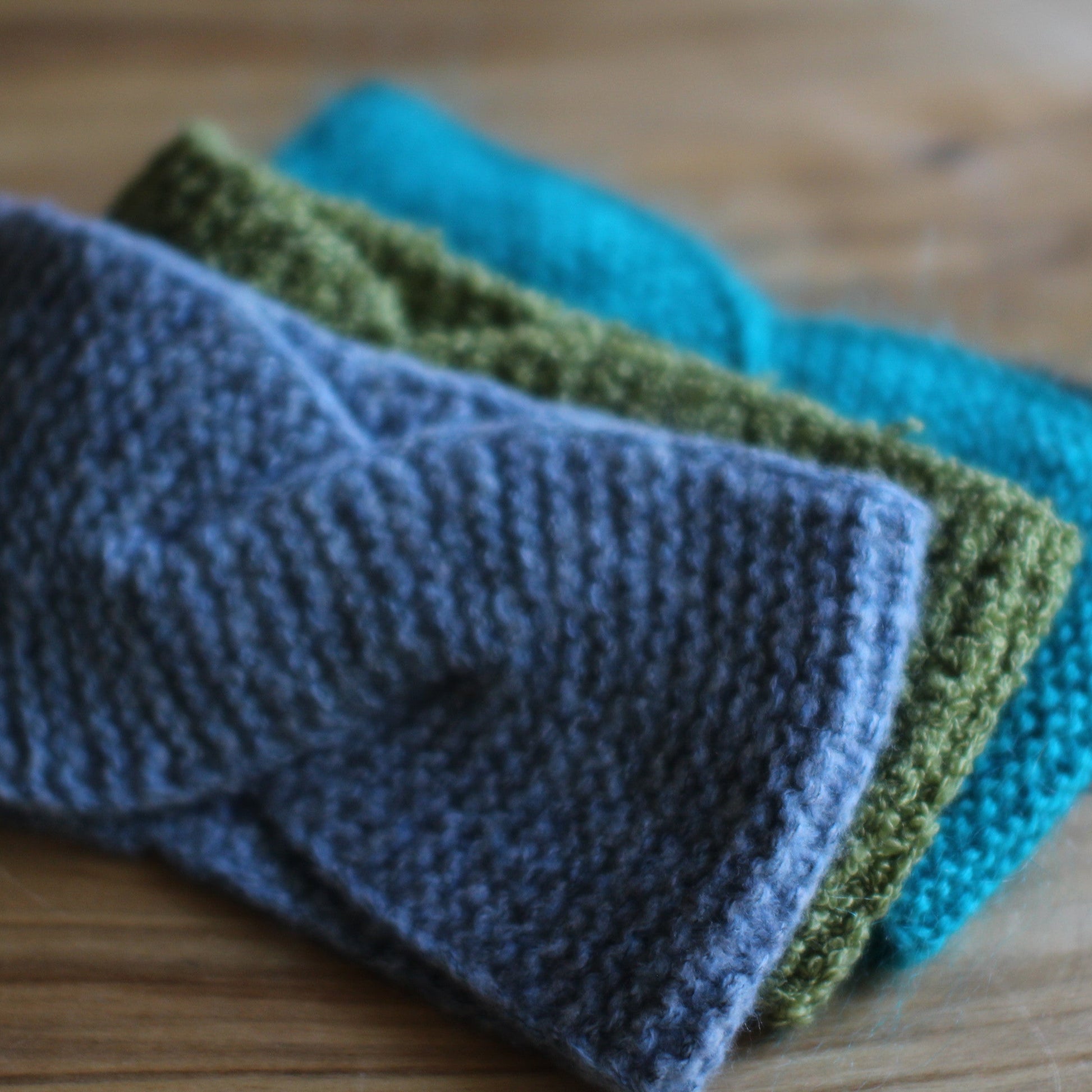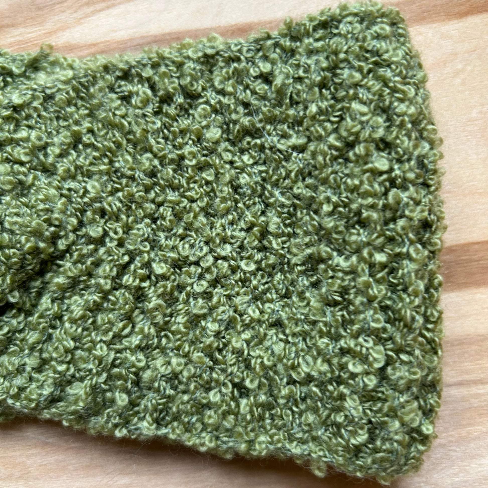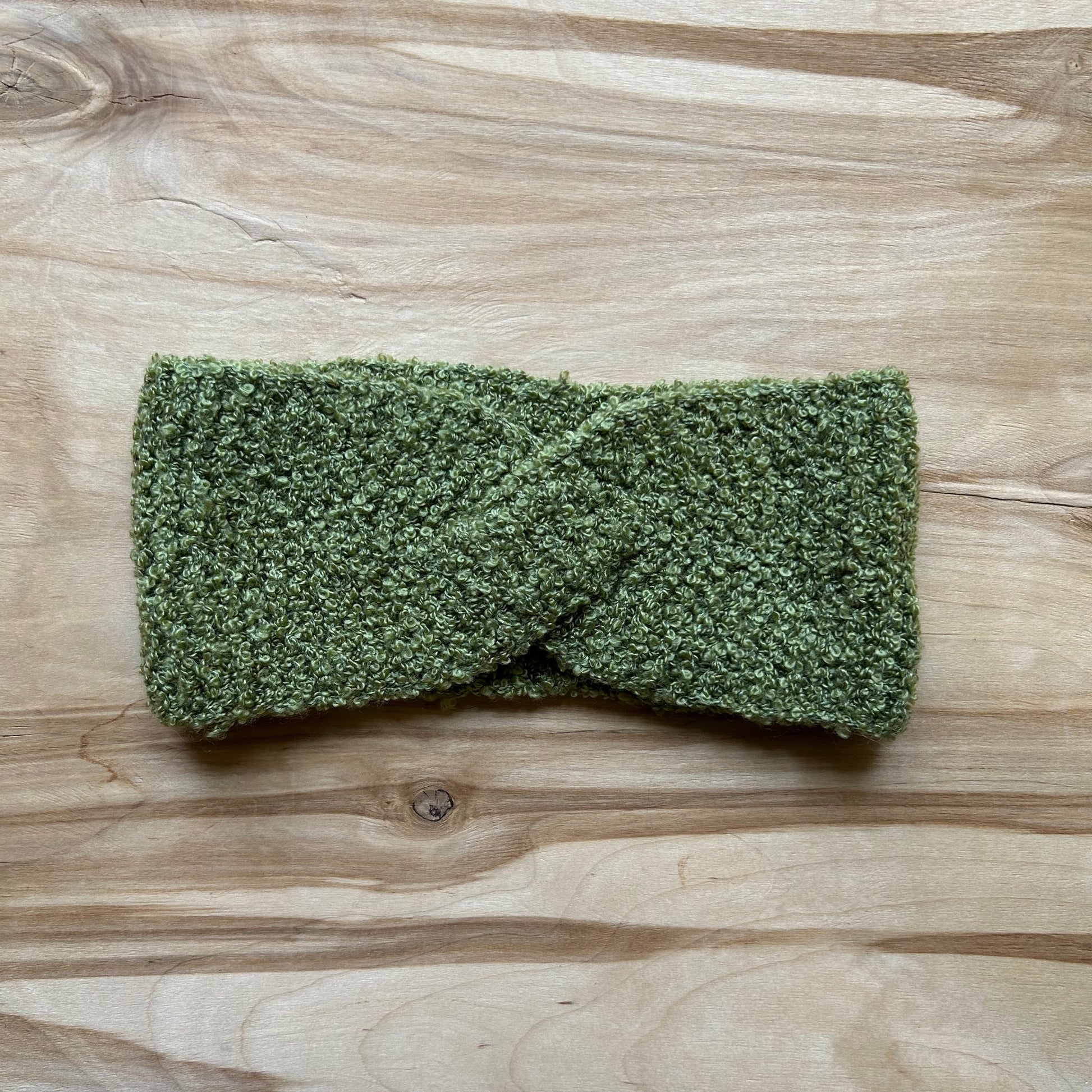 Zaļa adīta galvas lenta no buklē dzijas, ar sakrustojumu priekšpusē. Lentas platums 9 cm, pārlocīts garums 25 cm.