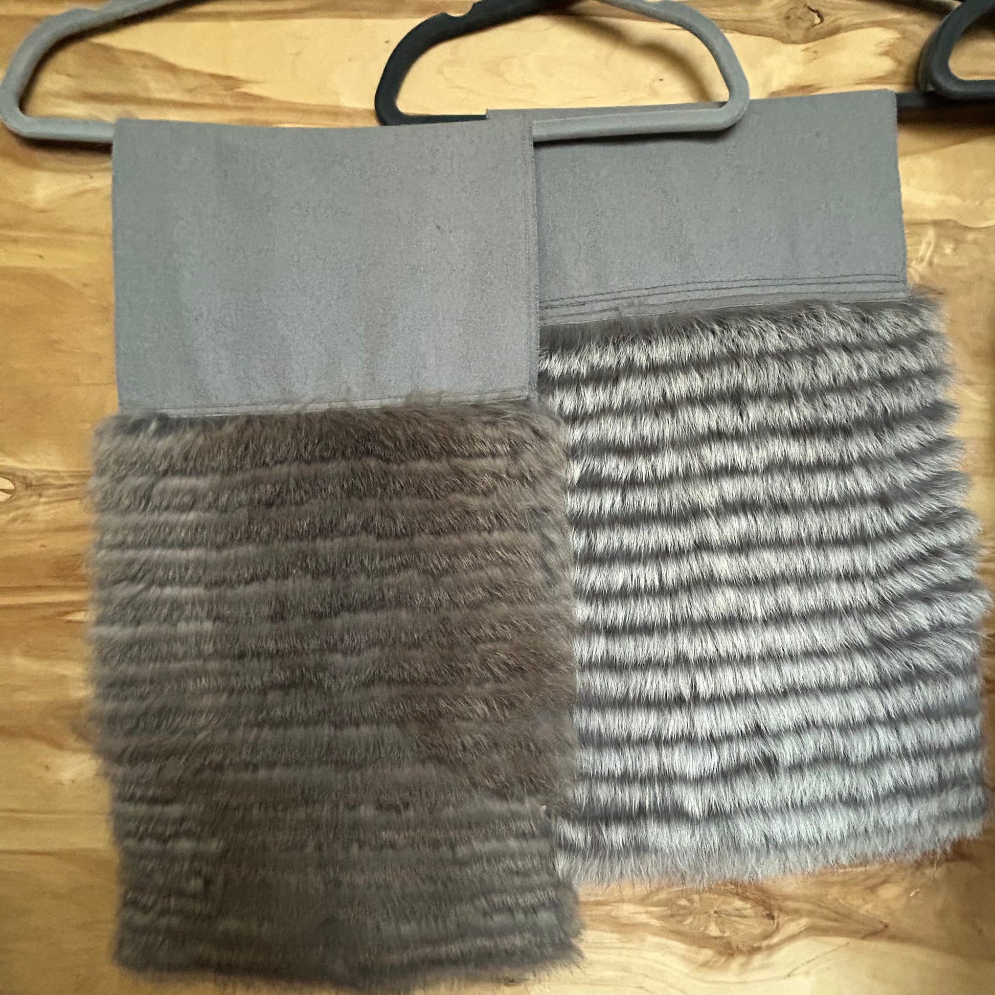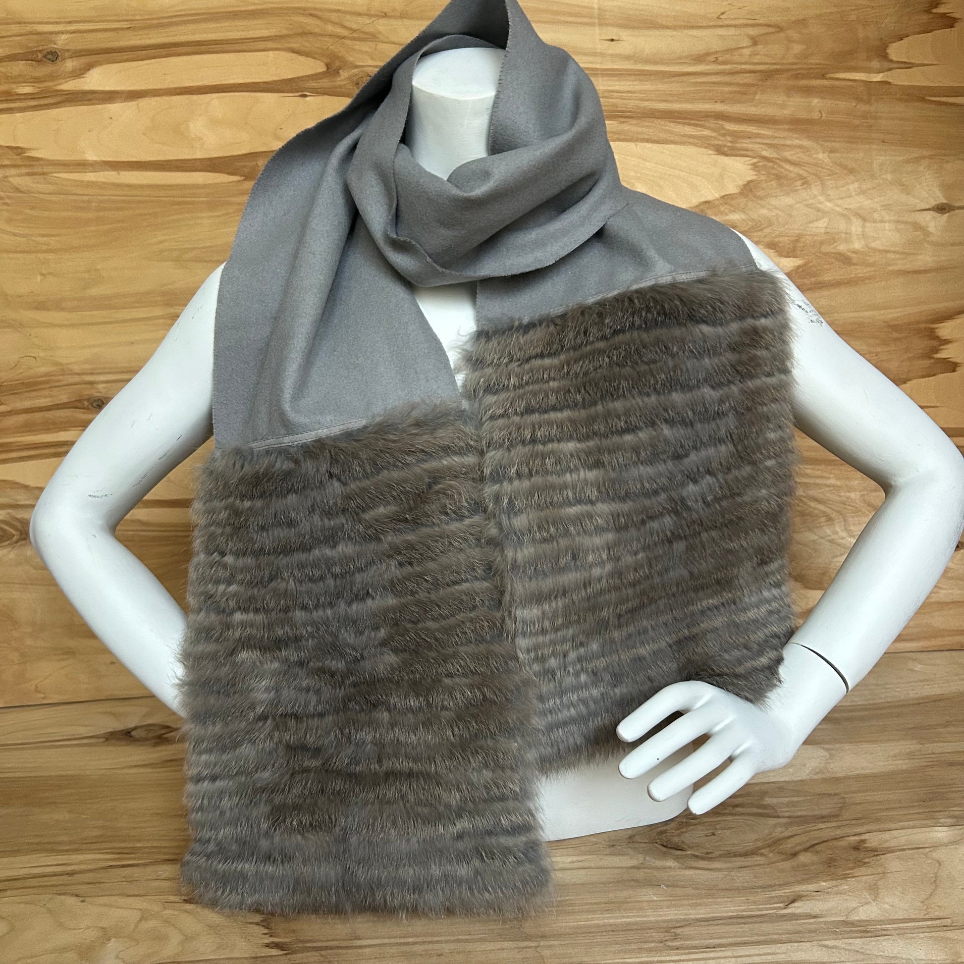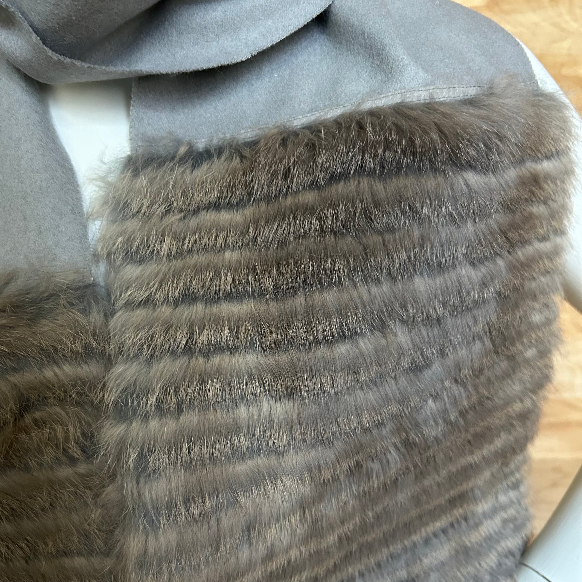 Gaiši pelēka vilnas auduma šalle ar abpusēji dekoratīvām gaiši pelēkbrūnām truša vilnas malām.