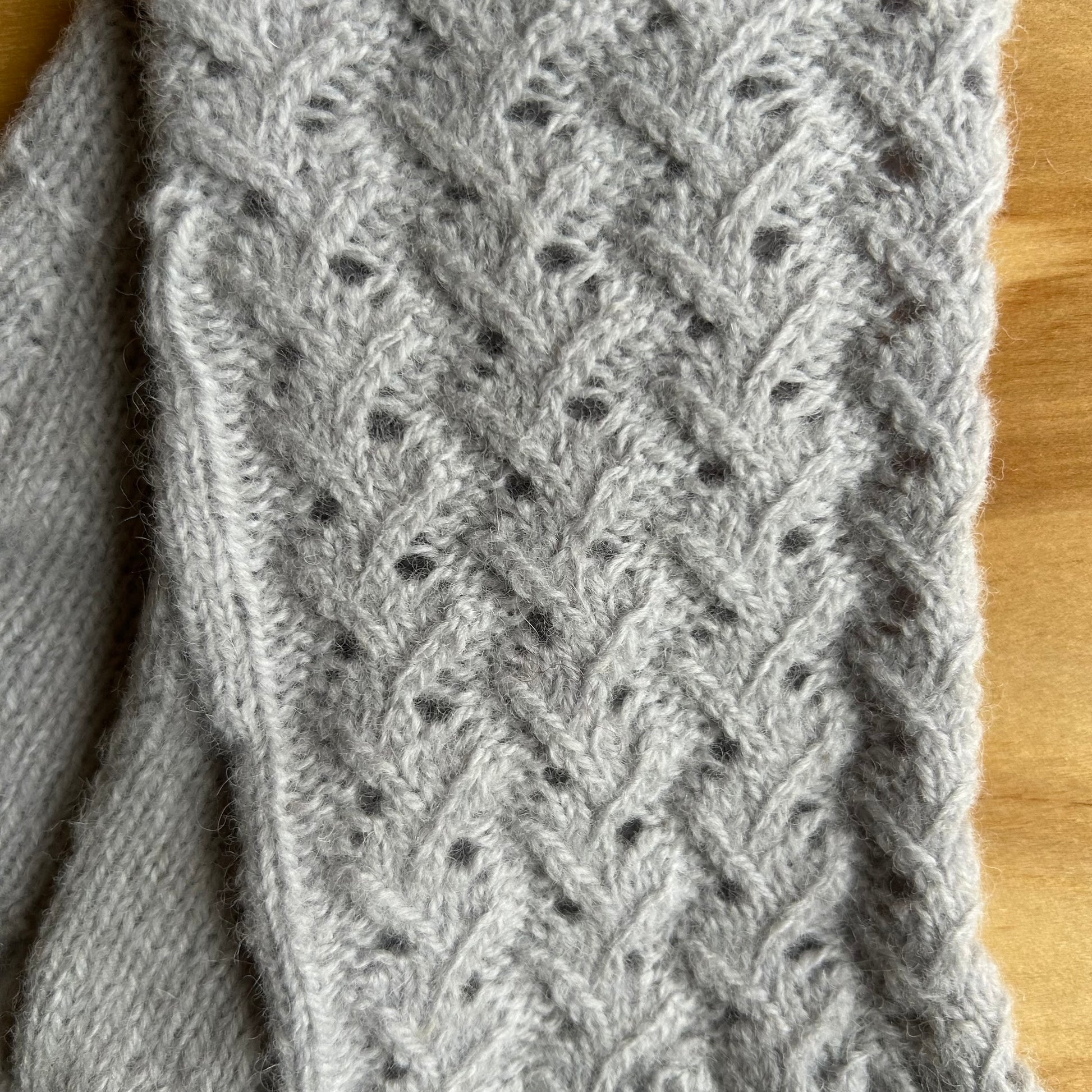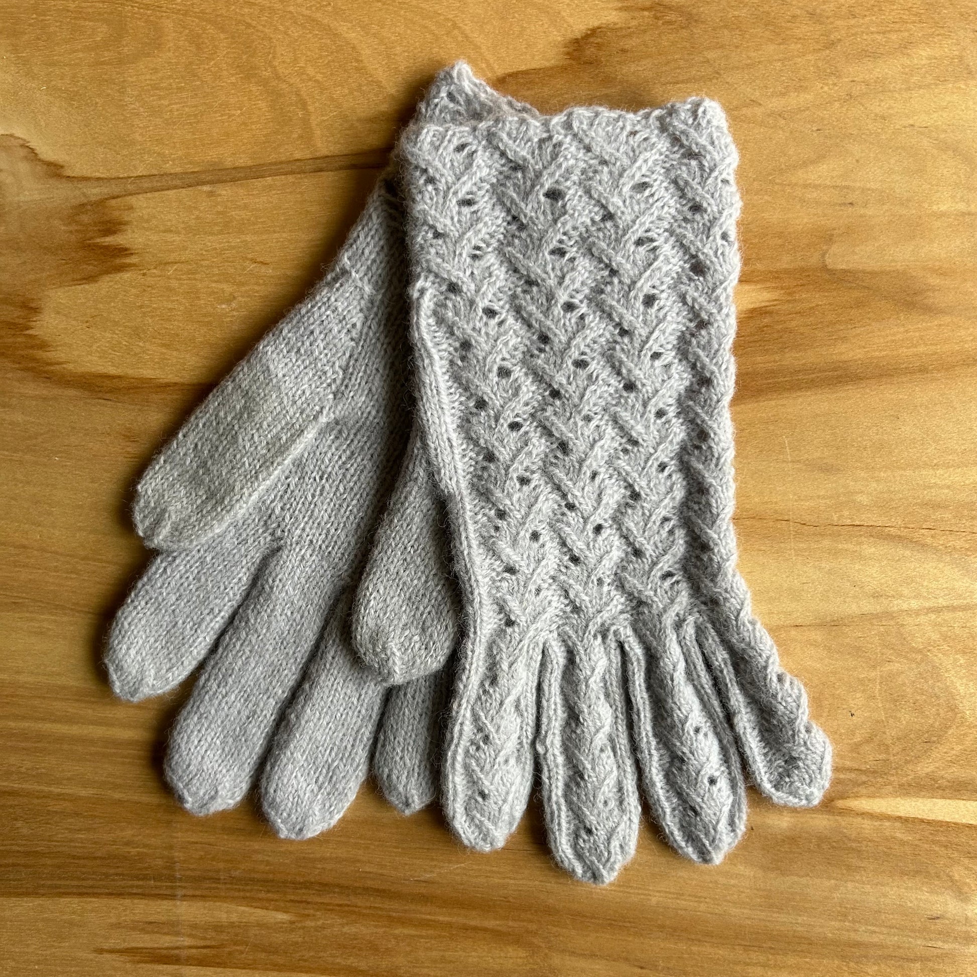Rokām adīti sieviešu pirkstaiņi gaiši pelēkā krāsā. Plaukstas virspusē mežģīņraksta adījums skujiņās rakstā. Garums 25 cm, platums 10 cm.