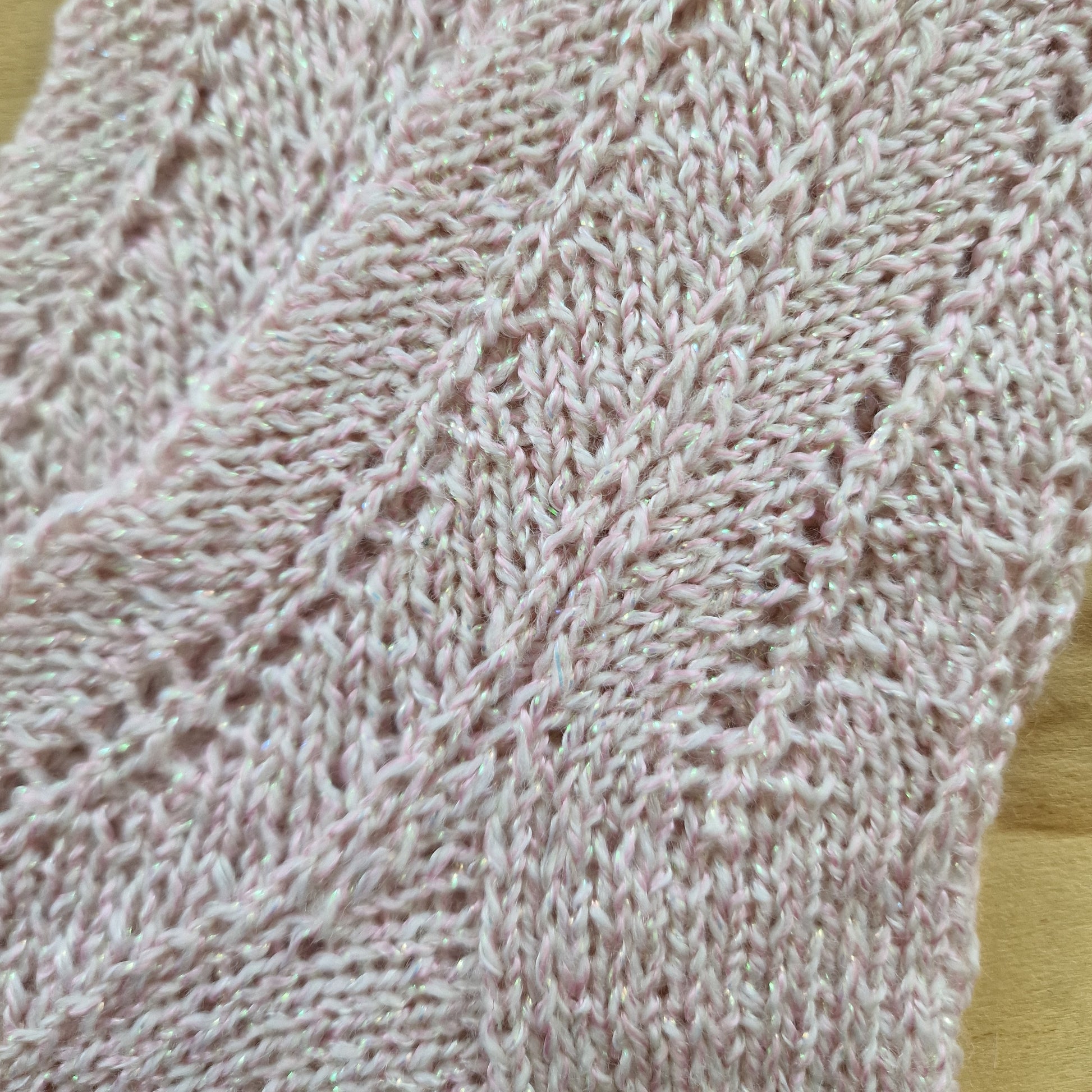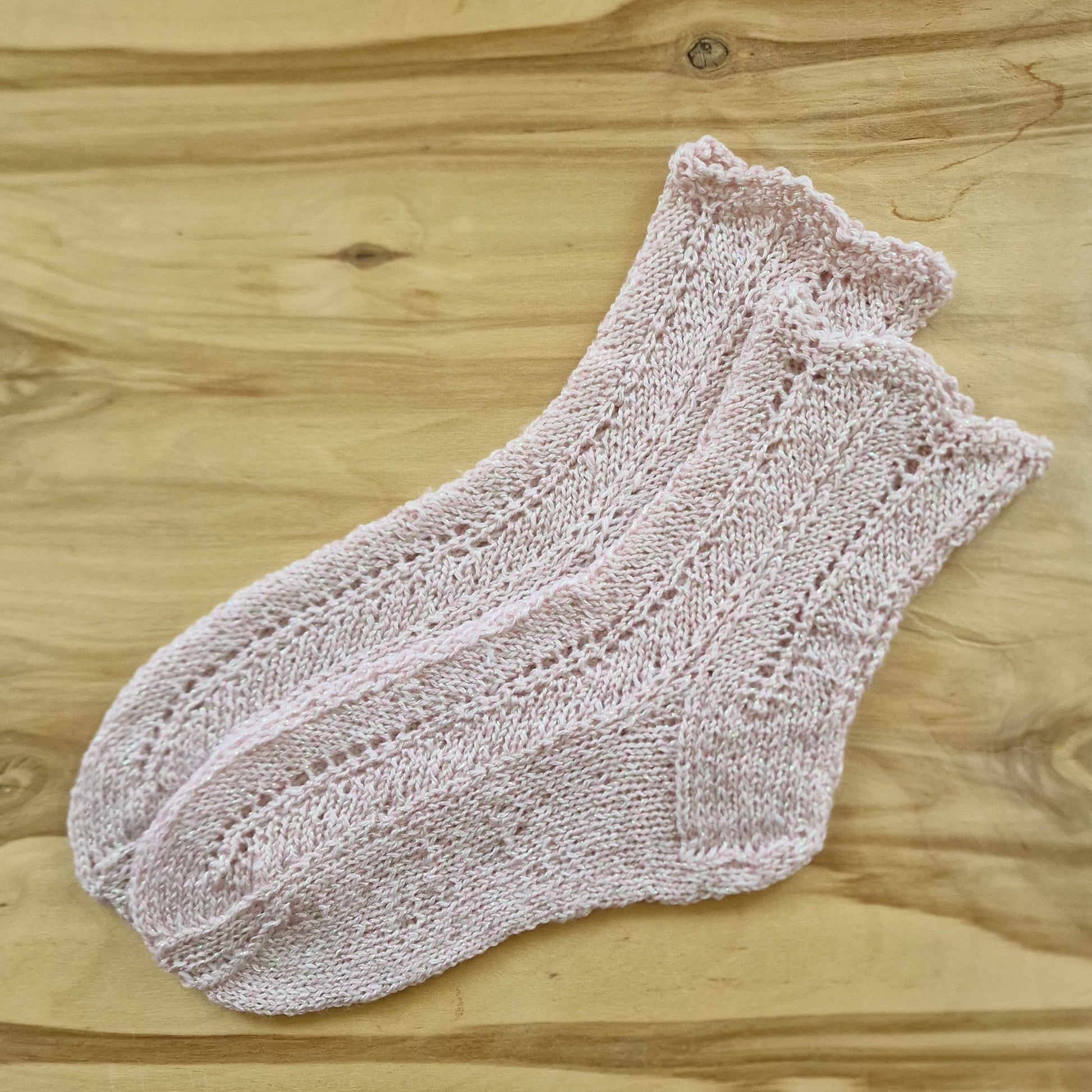 Rokām adītas gaiši rozā siltās zeķes 34.-36.izm. ar mirdzuma pavedienu un caurās vīles rakstu zeķes virspusē un uz stulma. Dekoratīvā adījumā nobeigta stulma augšmala. Stulma augstums ~12 cm / adītās pēdas garums neiestiepjot ~21,6 cm.