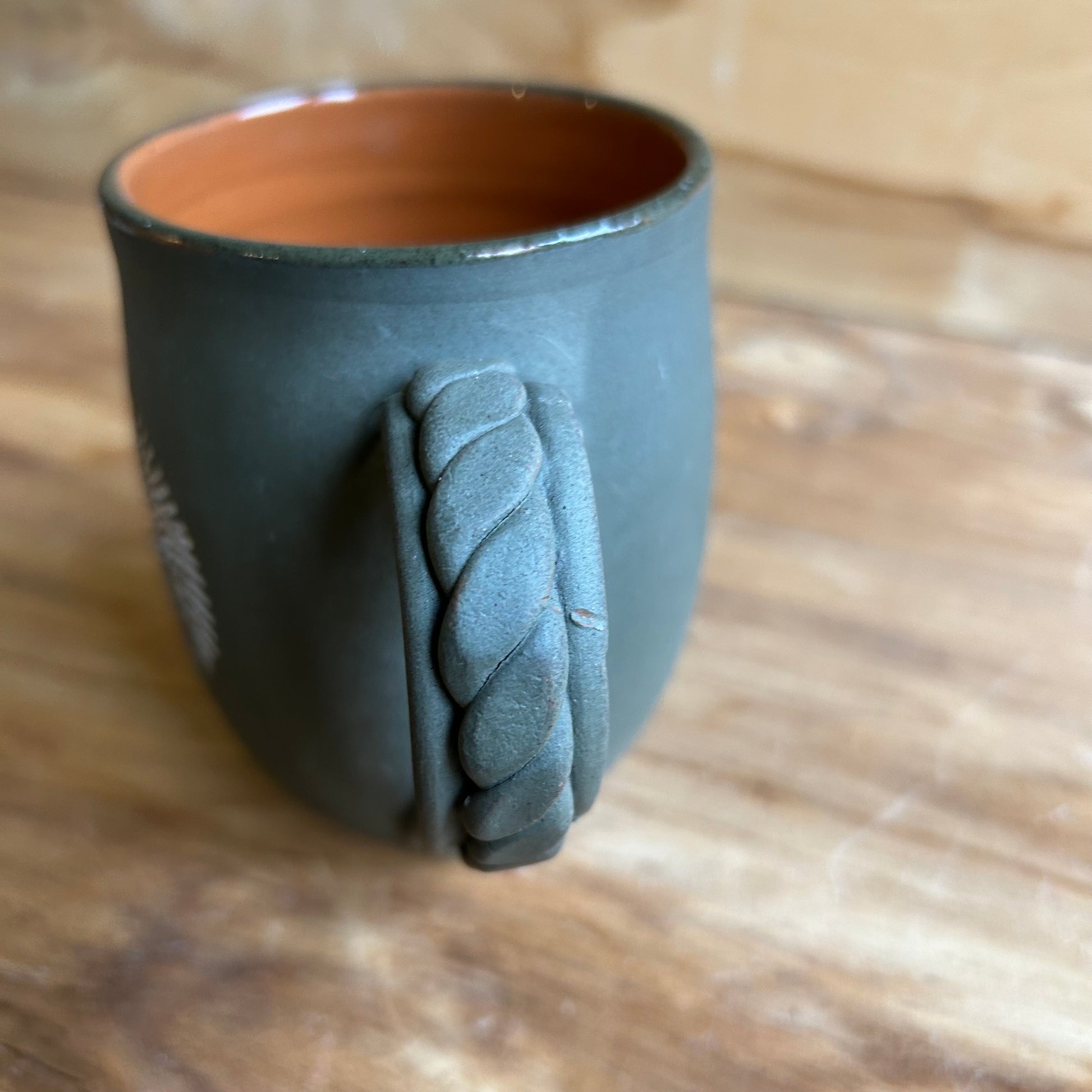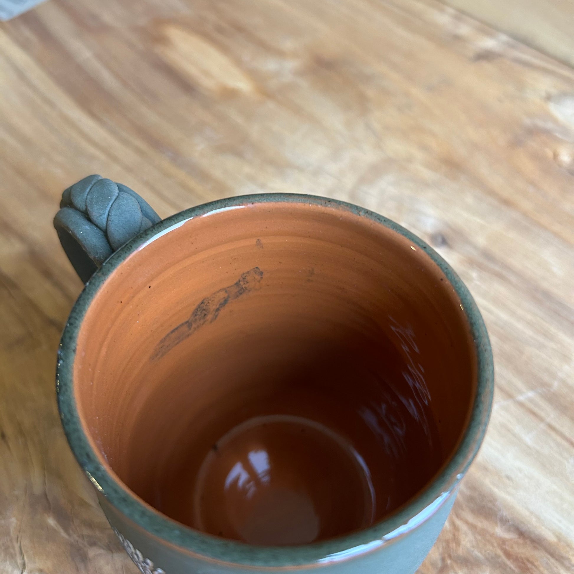 Rokām veidota tumši zaļa māla krūze ar brūnu glazētu iekšpusi, un zaļiem skrāpziedu ornamentiem. Osiņa ar savijumu.