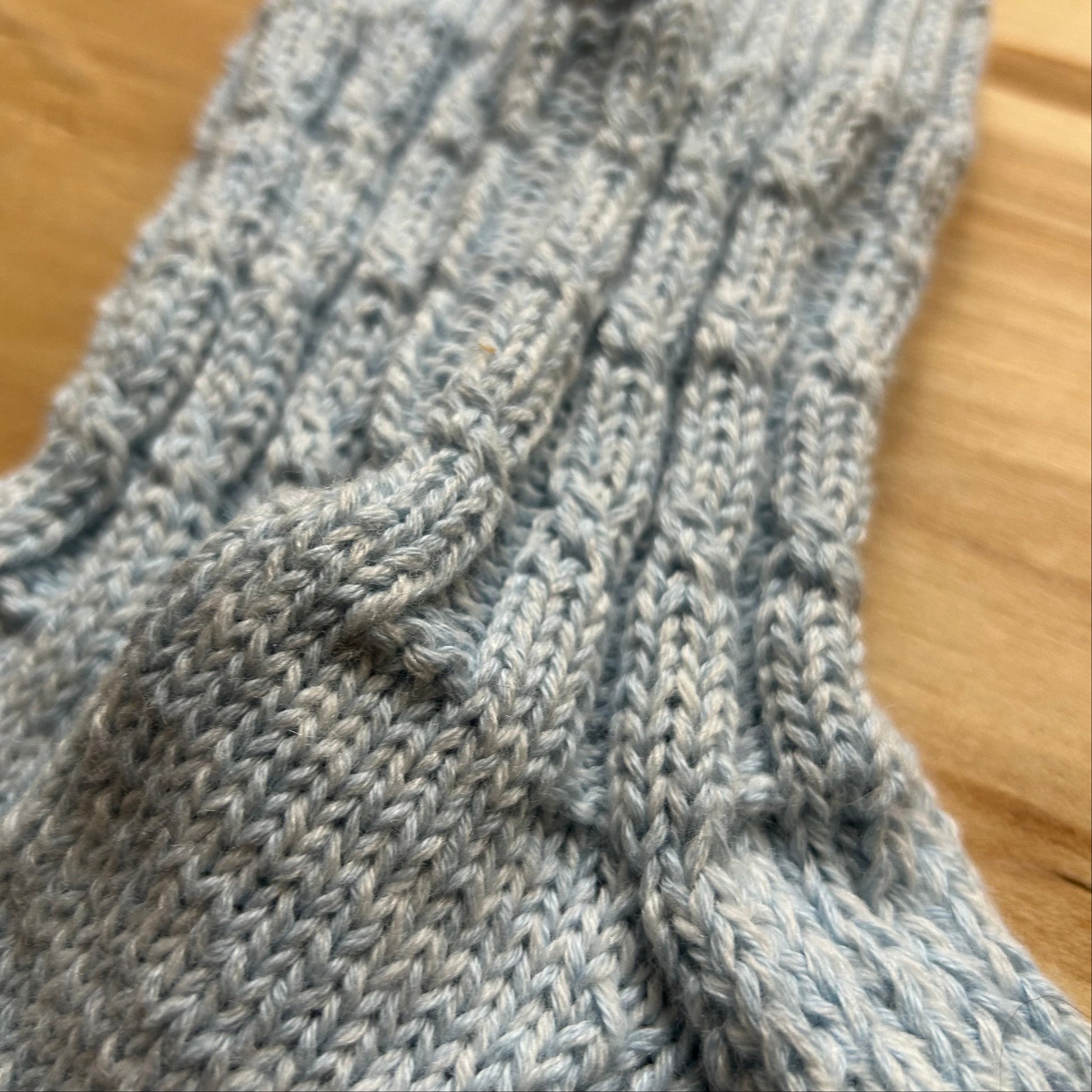 Rokām adītas gaiši zilas siltās zeķes 37.-39.izm. līdzenā adījumā ar rakstainu valnīti. Stulma augstums 15 cm / adītās pēdas garums neiestiepjot 24 cm.