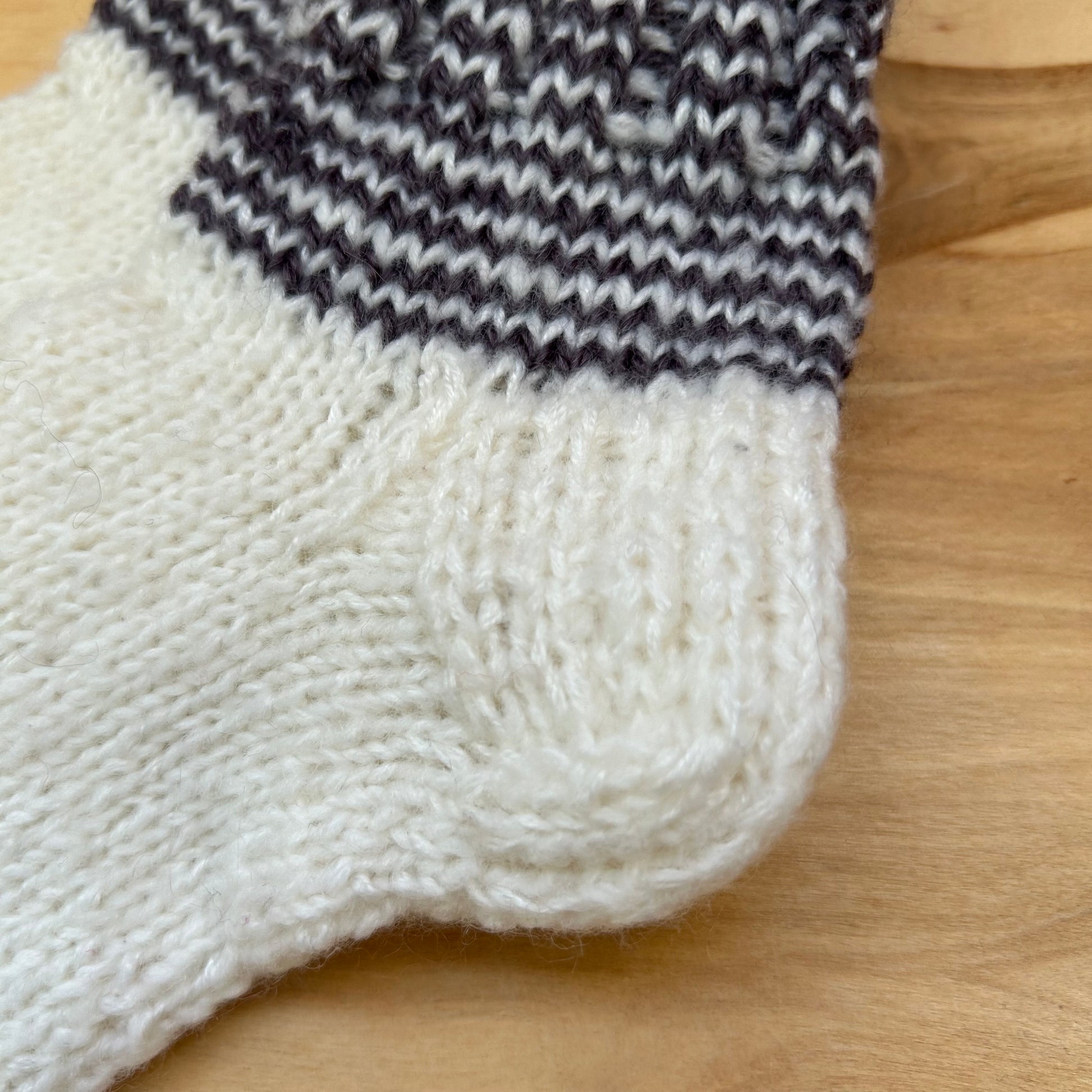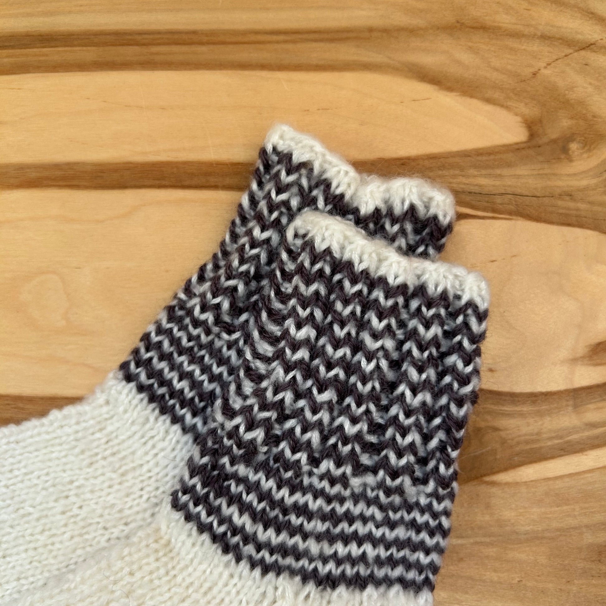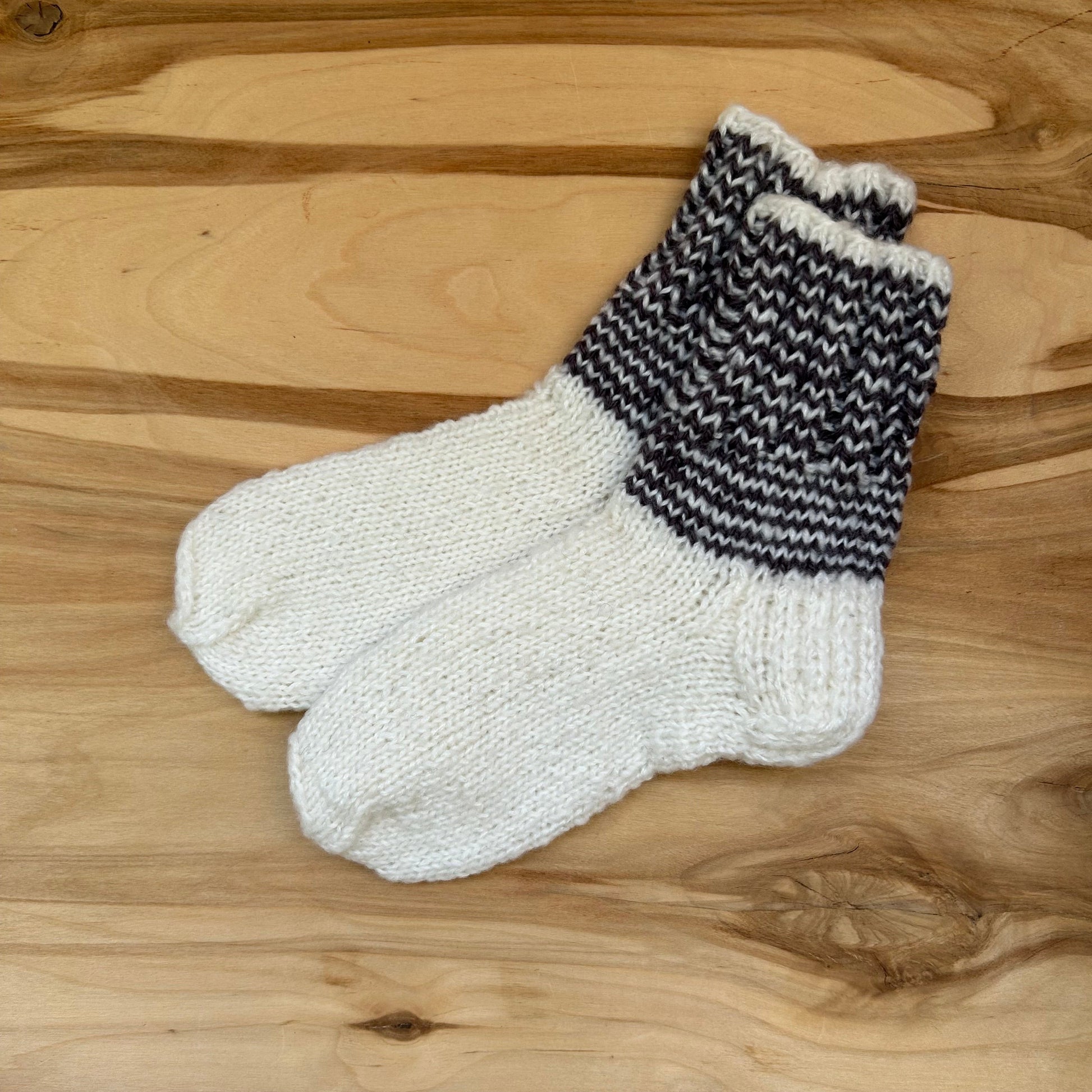 Rokām adītas siltās zeķes baltā krāsā ar pelēkām strīpām stulma daļā. 25.-27.izm. Stulma augstums ~8 cm / pēdas garums ~16,5 cm.