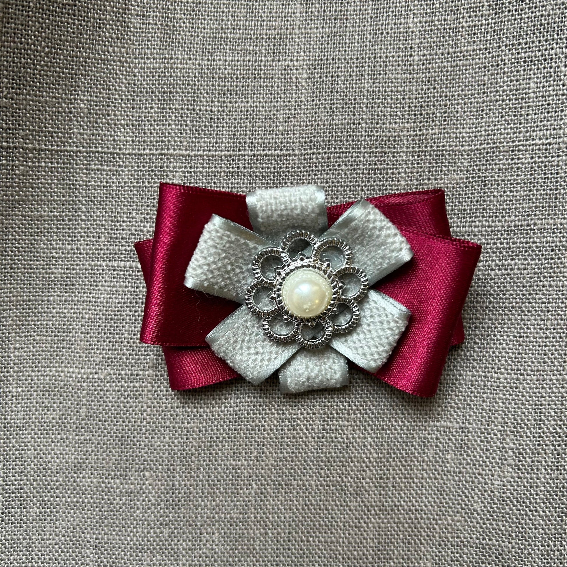 Patriotiska/latviska piespraude/broša ar tumšsarkanu lentu, pelēku dekoratīvu lentu lentu un nelielu sudraba krāsas saktiņu. Izmērs ~7x 5x1,5cm.
