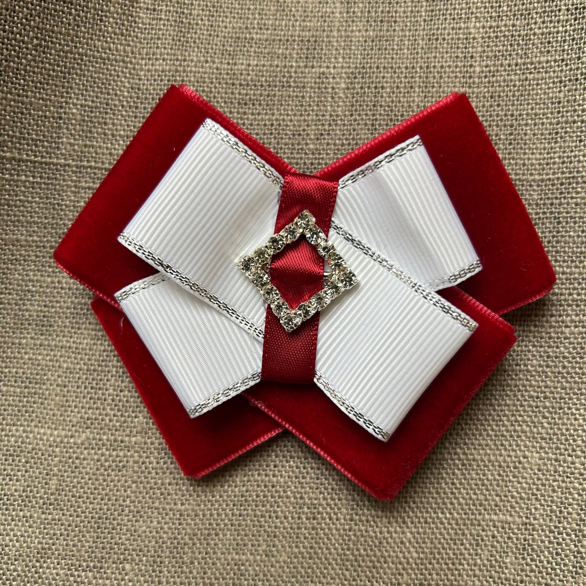 Patriotiska/latviska piespraude/broša ar sarkanu samta lentu, baltu dekoratīvu ripsa lentu un nelielu sudraba krāsas saktiņu. Izmērs ~9 x 7x1,5cm.