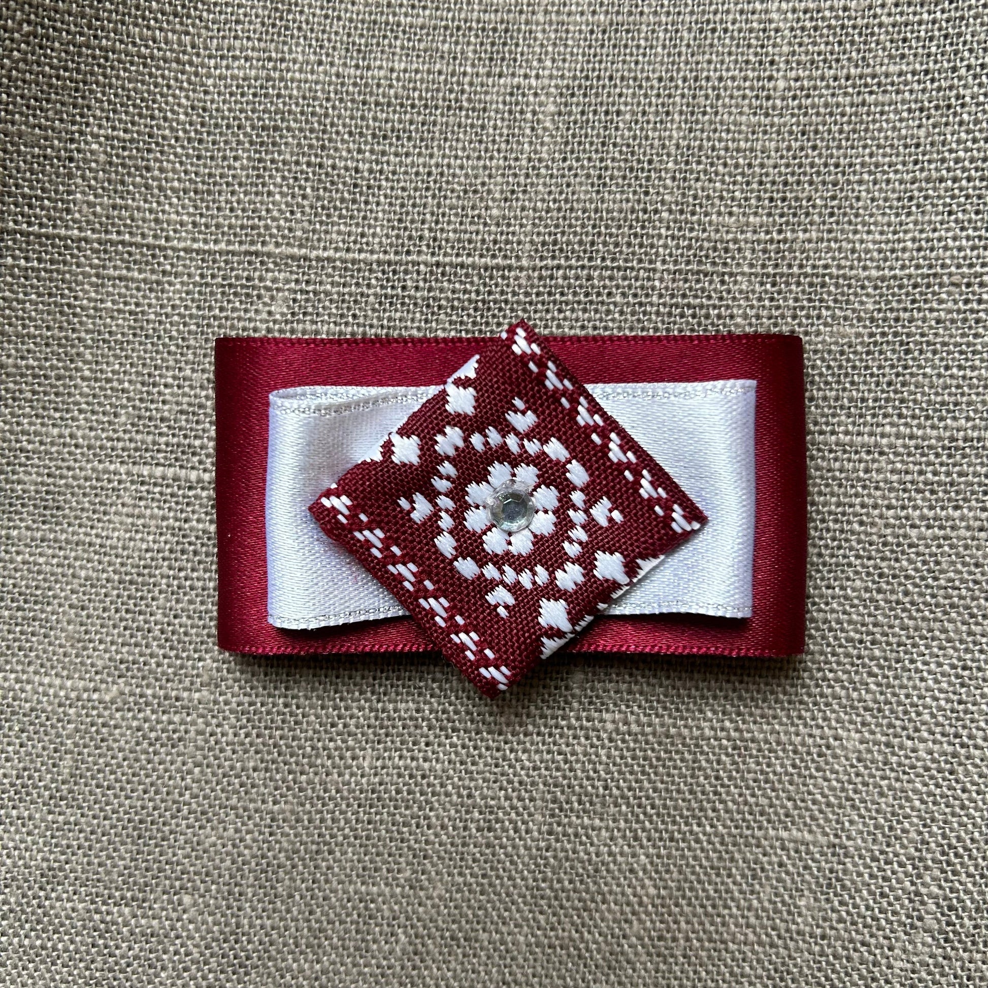 Patriotiska/latviska piespraude/broša ar tumši sarkanu lentu, baltu lentu un sarkanbaltu rakstainu tautisku lentu. Izmērs ~6,5x4x1,5cm.