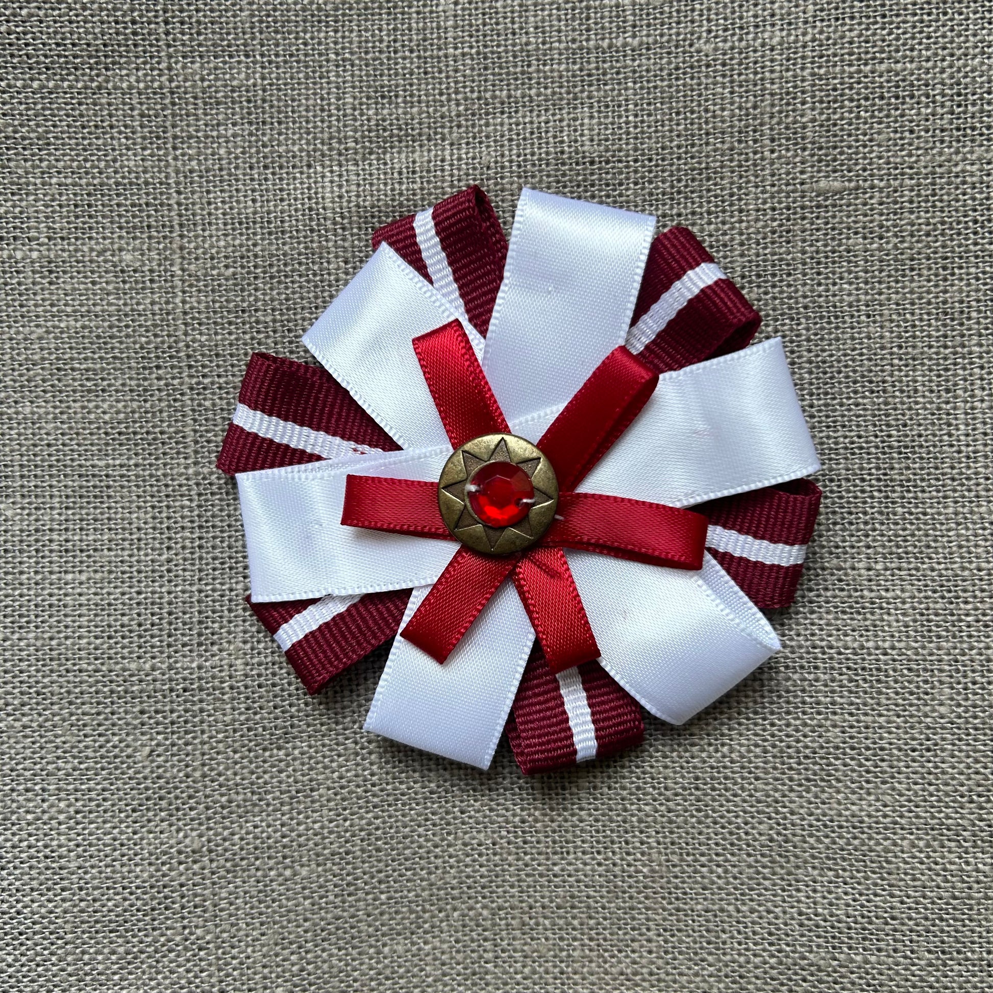 Patriotiska/latviska piespraude/broša ar Latvijas karoga lentu un baltu lentu, sarkanu lentu un metāla podziņu ar auseklīša rakstu centrā ar sarkanu pērlīti vidū. 8 cm diametrā.