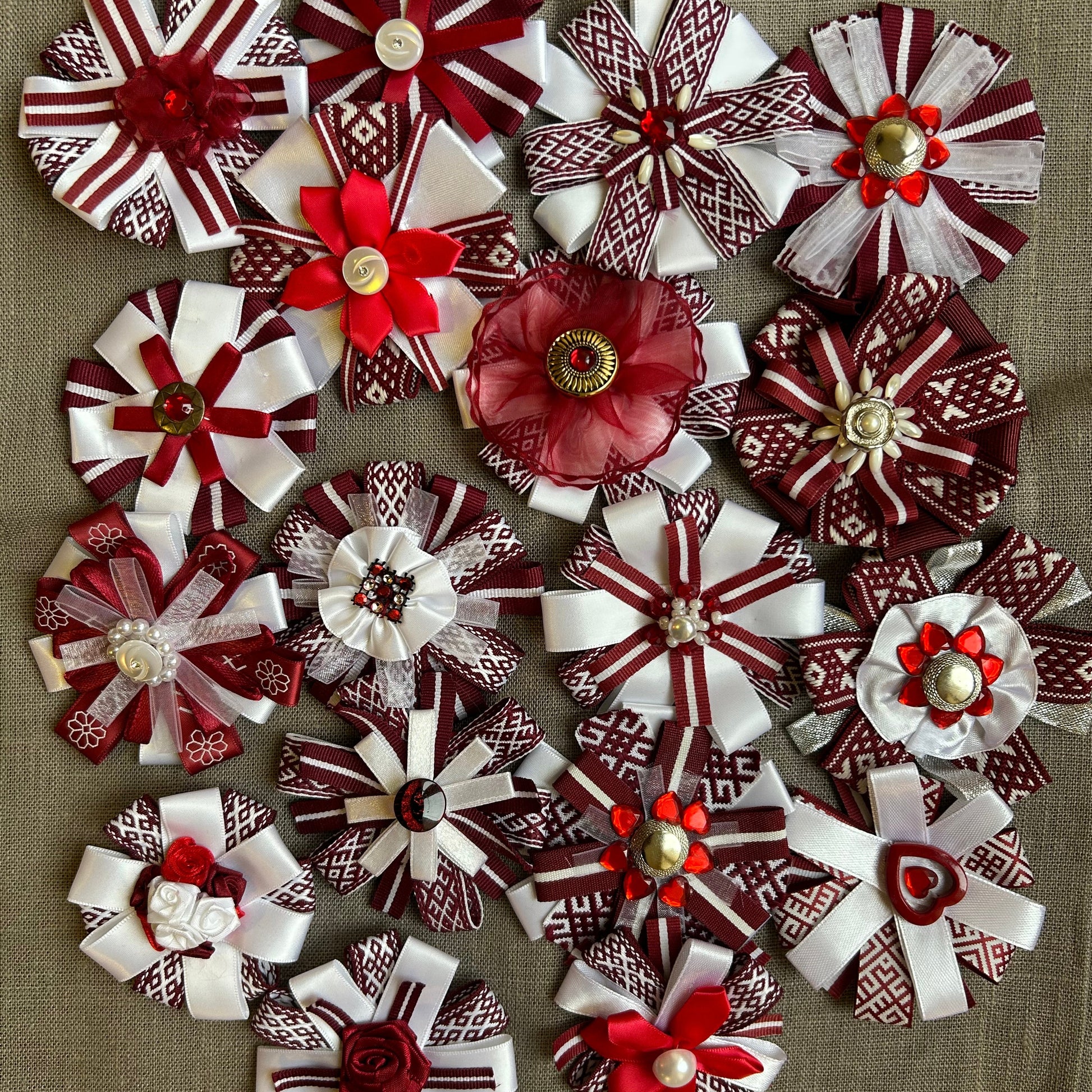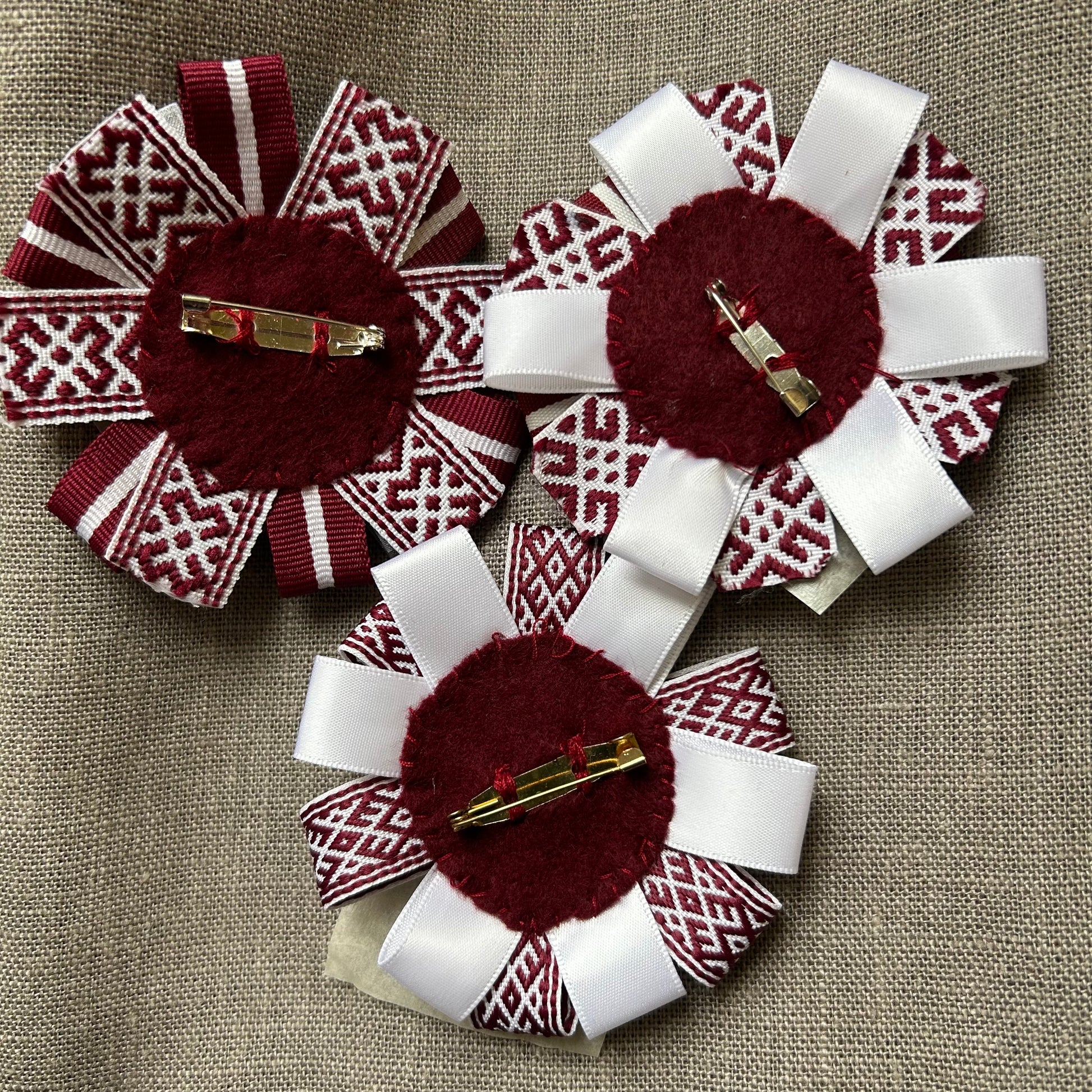 Attēlā redzamas latviskas piespraudes, kas veidotas no sarkanbaltsarkanām lentēm ar rakstiem, iedvesmojoties no latvju ornamentiem. Katra piespraude ir unikāla — ar atšķirīgu formu, lentīšu kārtojumu un rotājumu vidū.