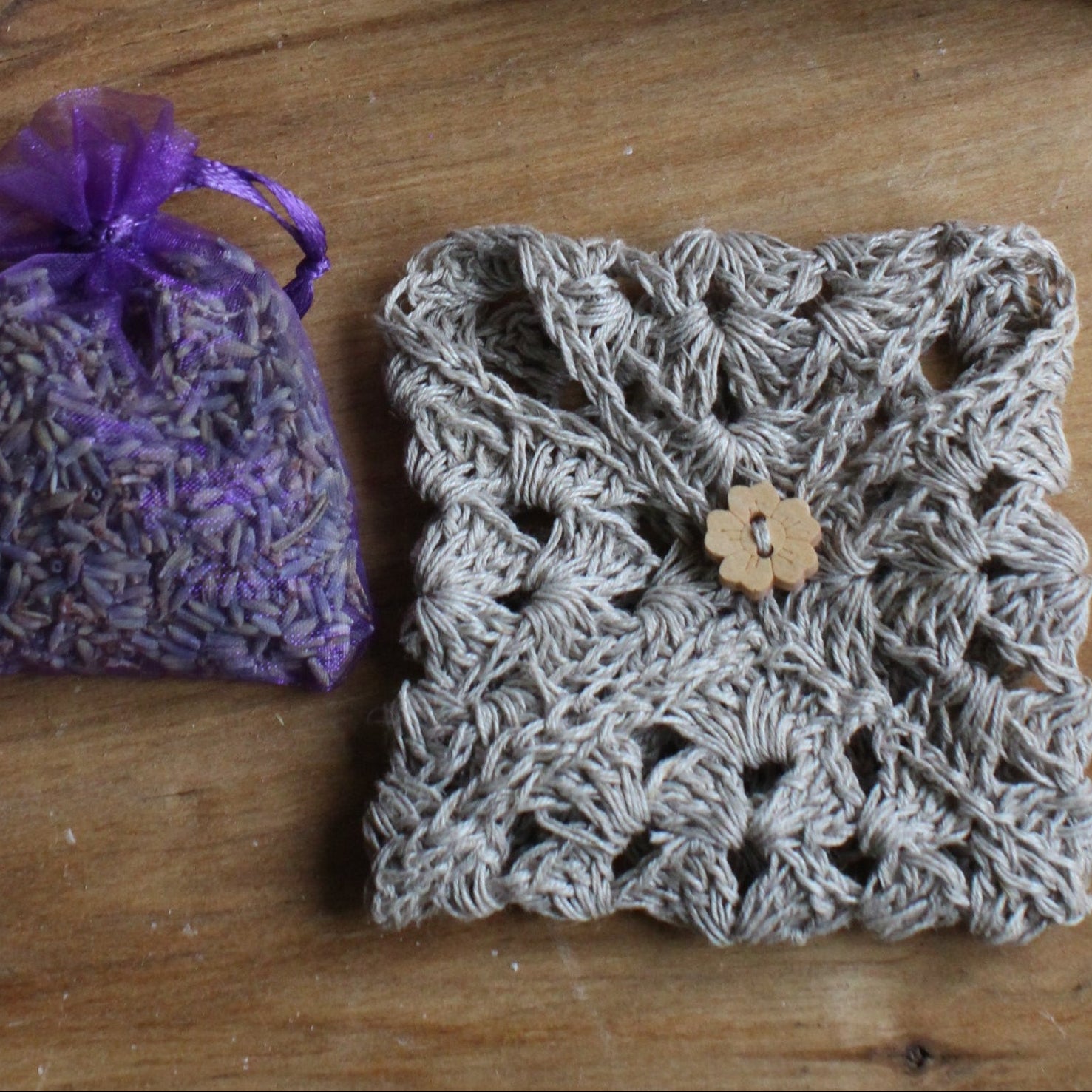 Lavandas maisiņš - Tamborrūķa roku darbs, tamborēts linu maisiņš, ar aizdares pogu zieda formā koka krāsā, pildīts ar kaltētiem lavandas ziediņiem. Izmērs 8x8x4cm