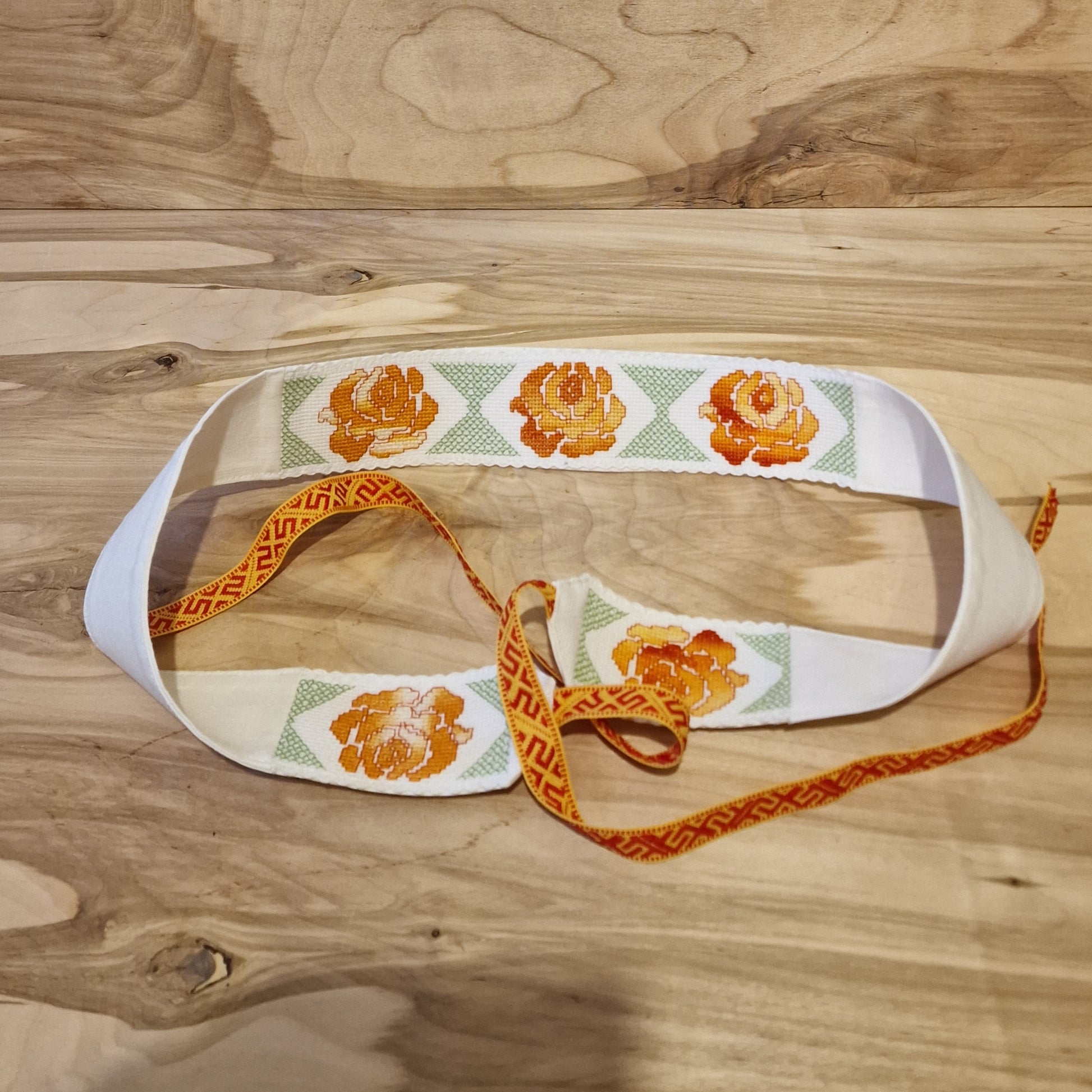 Balta lina josta 83 x 5 cm (+ sasiešanas lentas) ar oranžu/dzeltenu rožu krustdūriena izšuvumu - trīs ziedi centrā un pa vienam katrā galā. Jostas glabāšanai - dāvanā lina maisiņš ar mežģīni.