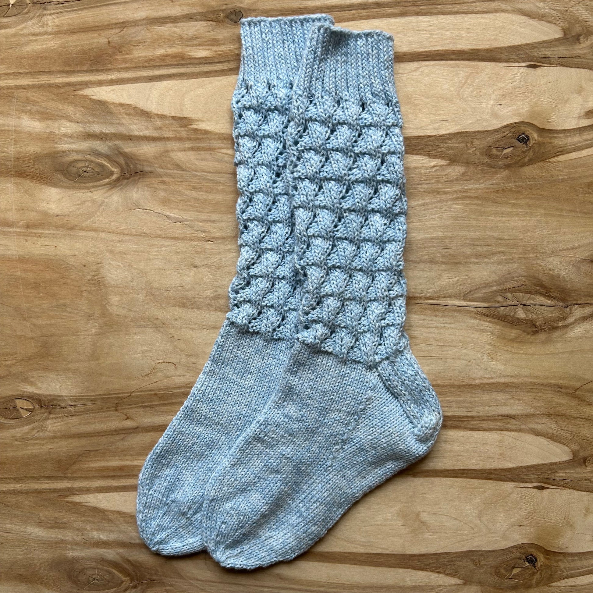 Rokām adītas garas siltās zeķes 38.-40.izm. līdzenā adījumā ar rakstainu valnīti pīnīšu rakstā maigi zilas krāsā. Stulma augstums 23 cm / adītās pēdas garums neiestiepjot 23,5 cm.