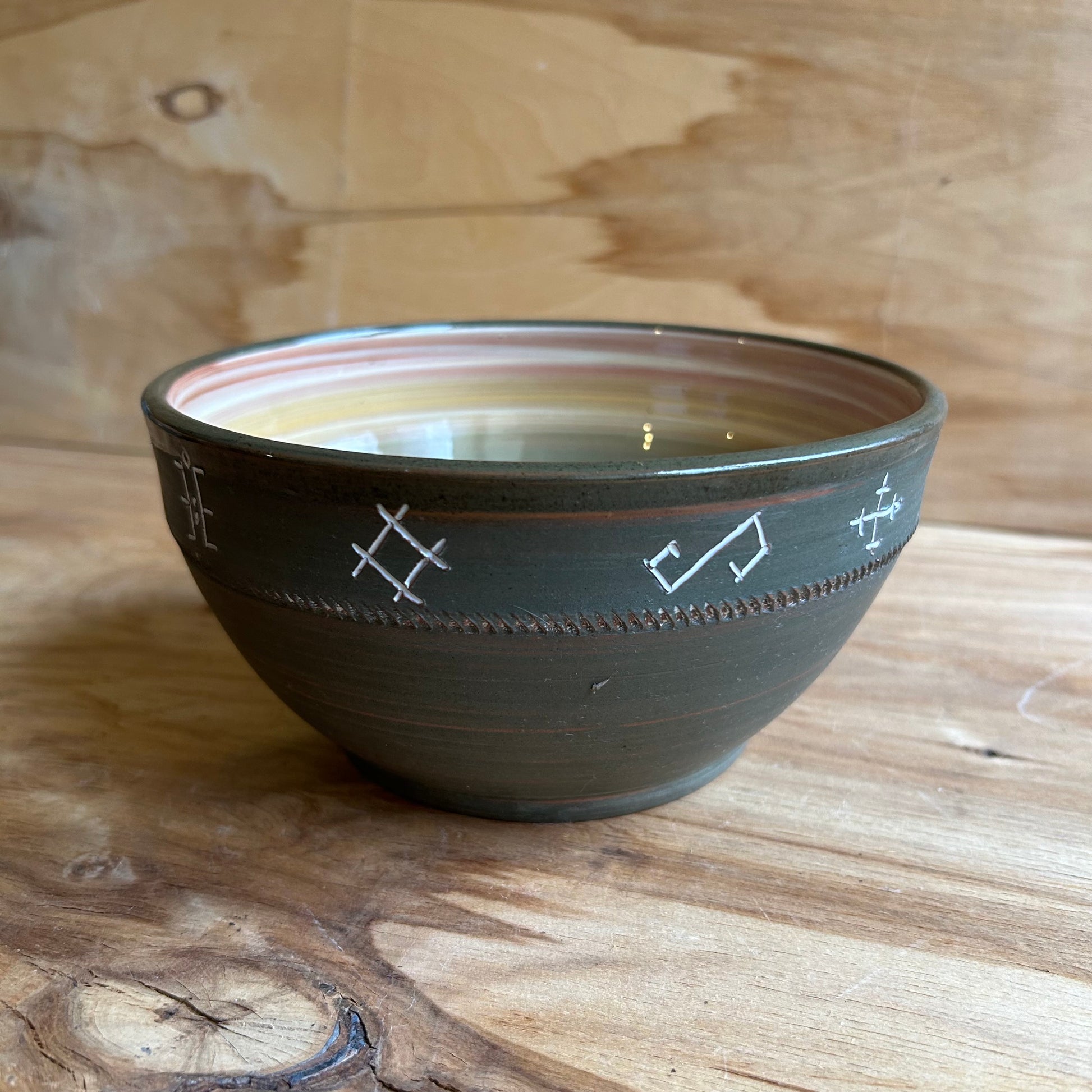 Rokām veidota māla bļoda zaļā krāsā ar krāsainu glazūras iekšu un baltu etnogrāfisku ornamentu rakstu gar malu.