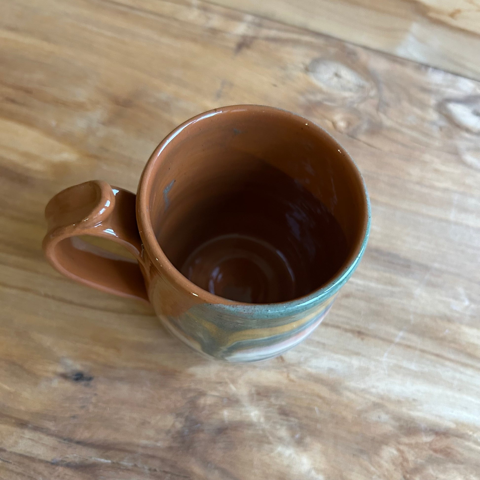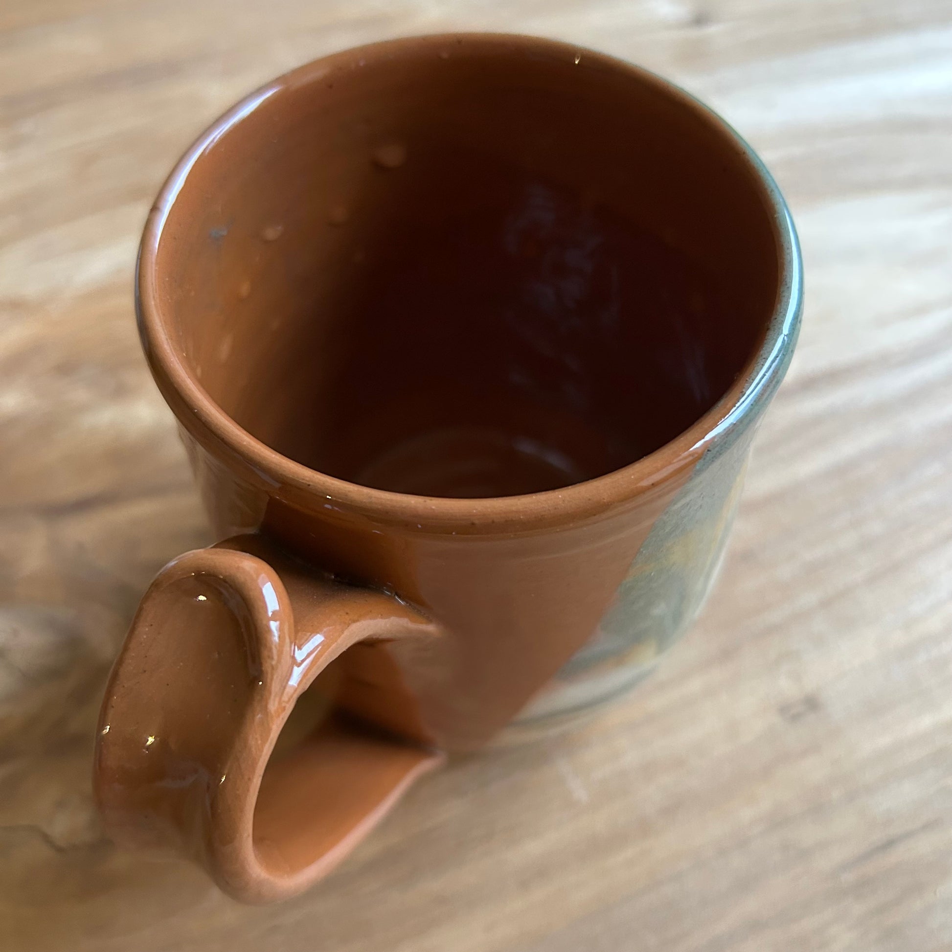 Rokām veidota brūna māla krūze ar glazētu iekšpusi, krāsainu ārējo glazūru un parocīgu veidojumu uz roktura. Krūzes augstums ~9,5 cm, diametrs ~8 cm, tilpums ~400 ml.