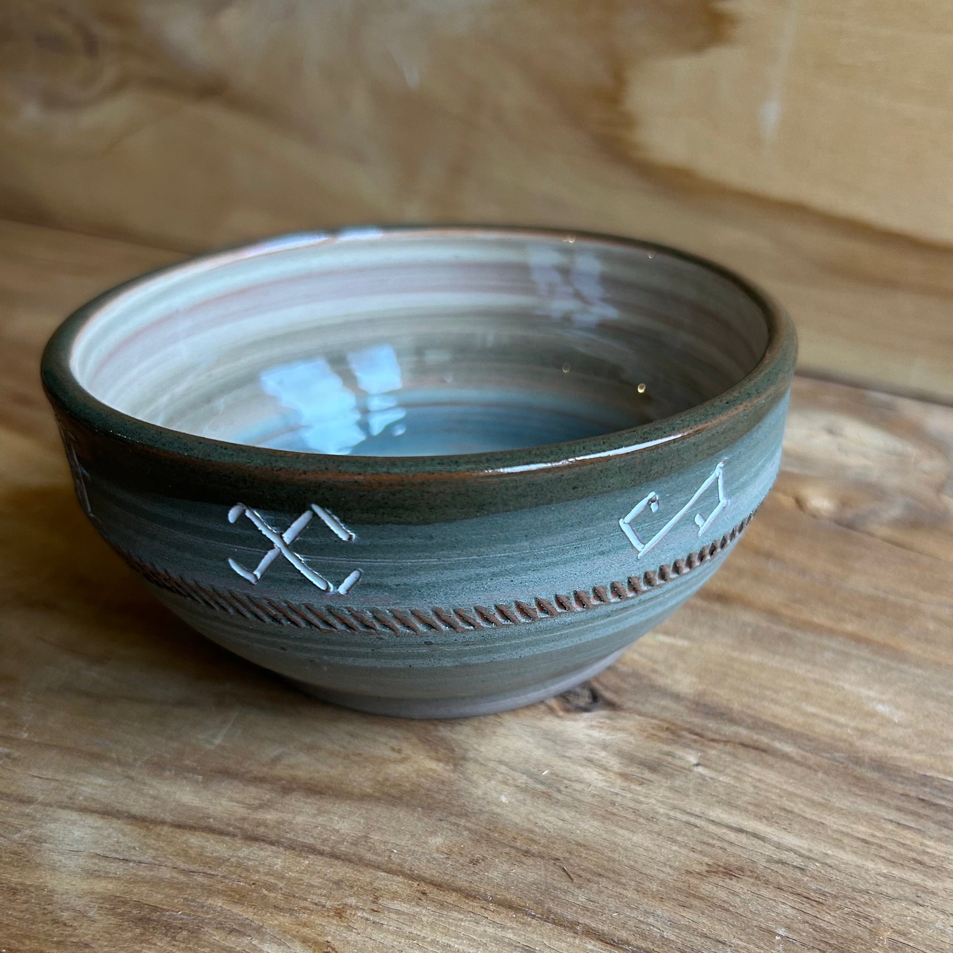 Rokām veidota māla bļodiņa zaļā krāsā ar krāsainu glazūras iekšu un baltiem etnogrāfiskiem ornamentu rakstiem gar malu.