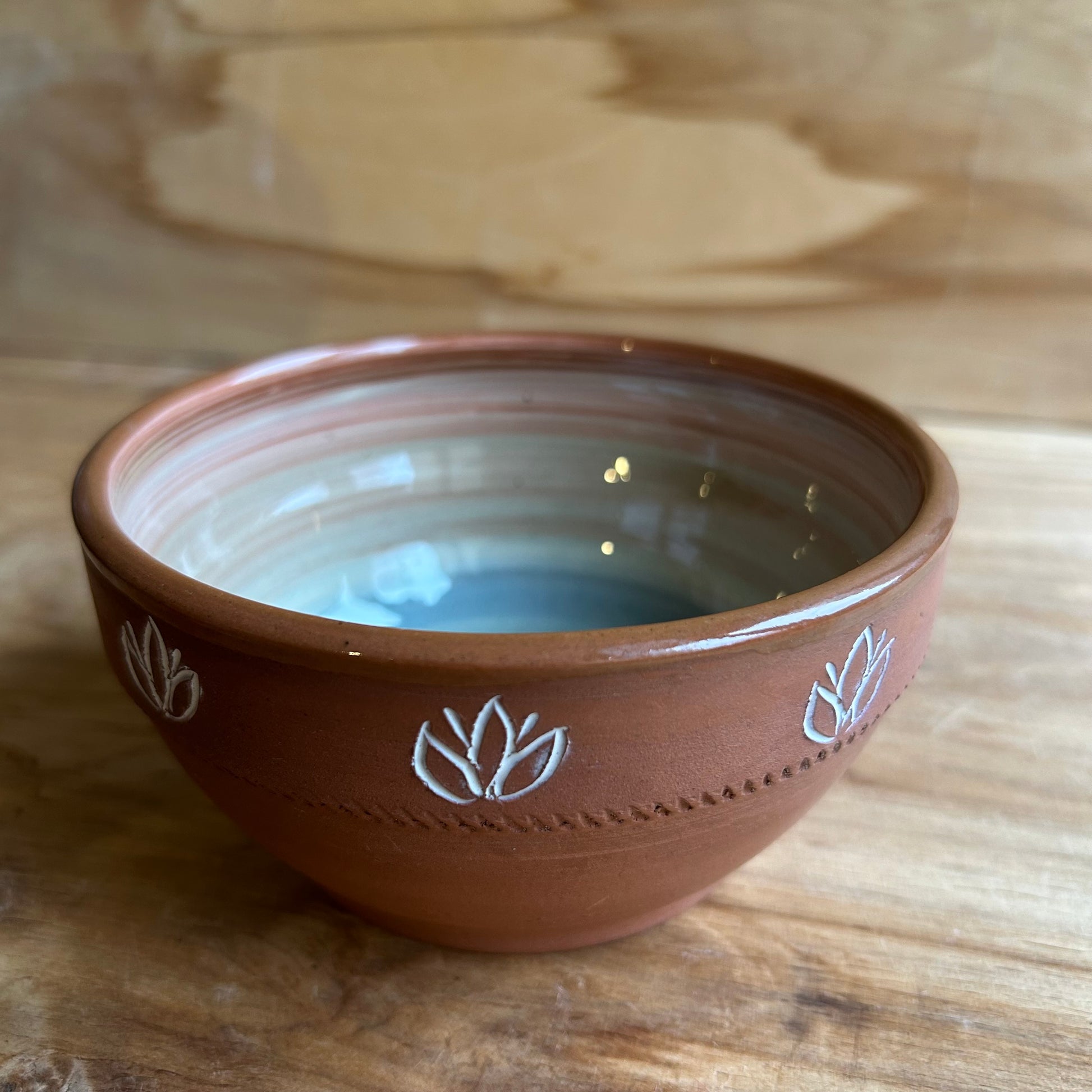 Rokām veidota māla bļodiņa brūnā krāsā ar krāsainu glazūras iekšu un baltiem lapiņu rakstiem gar malu.