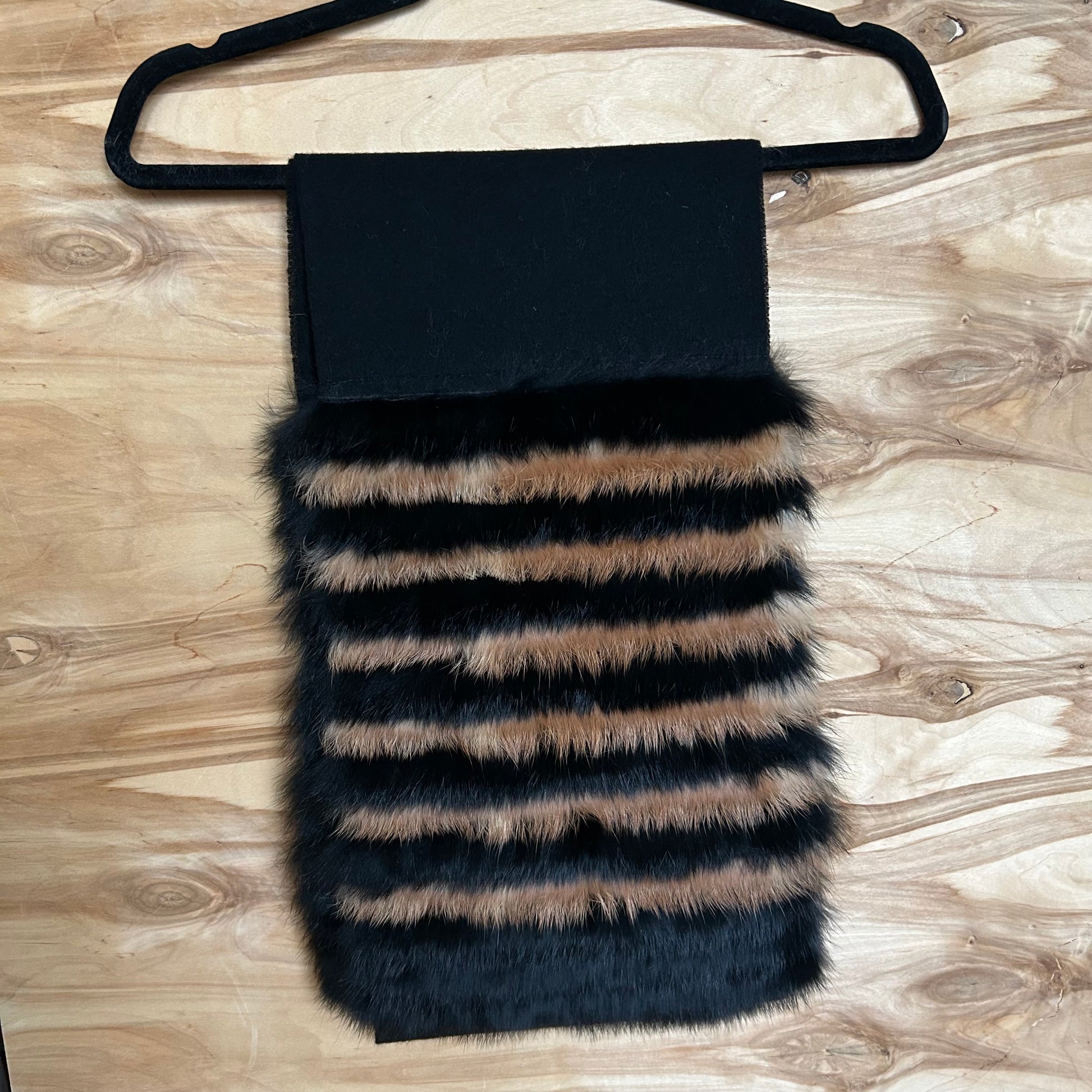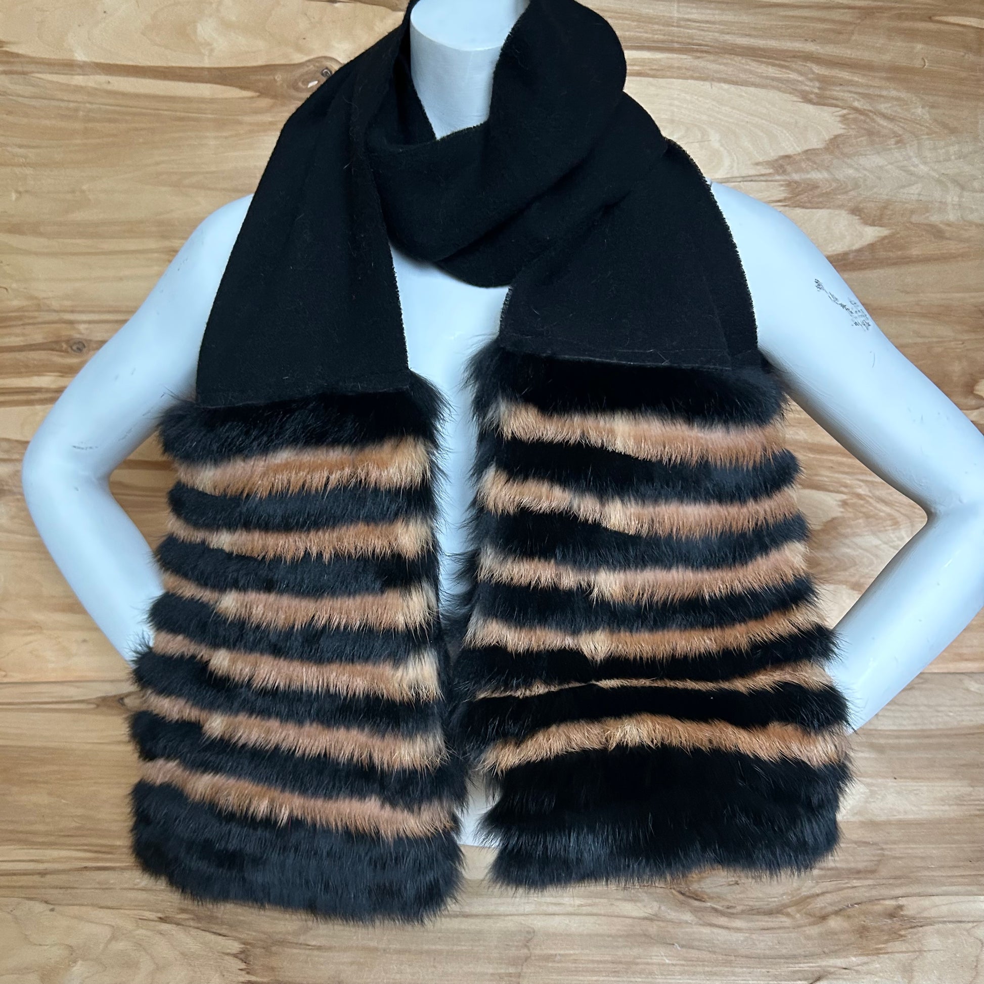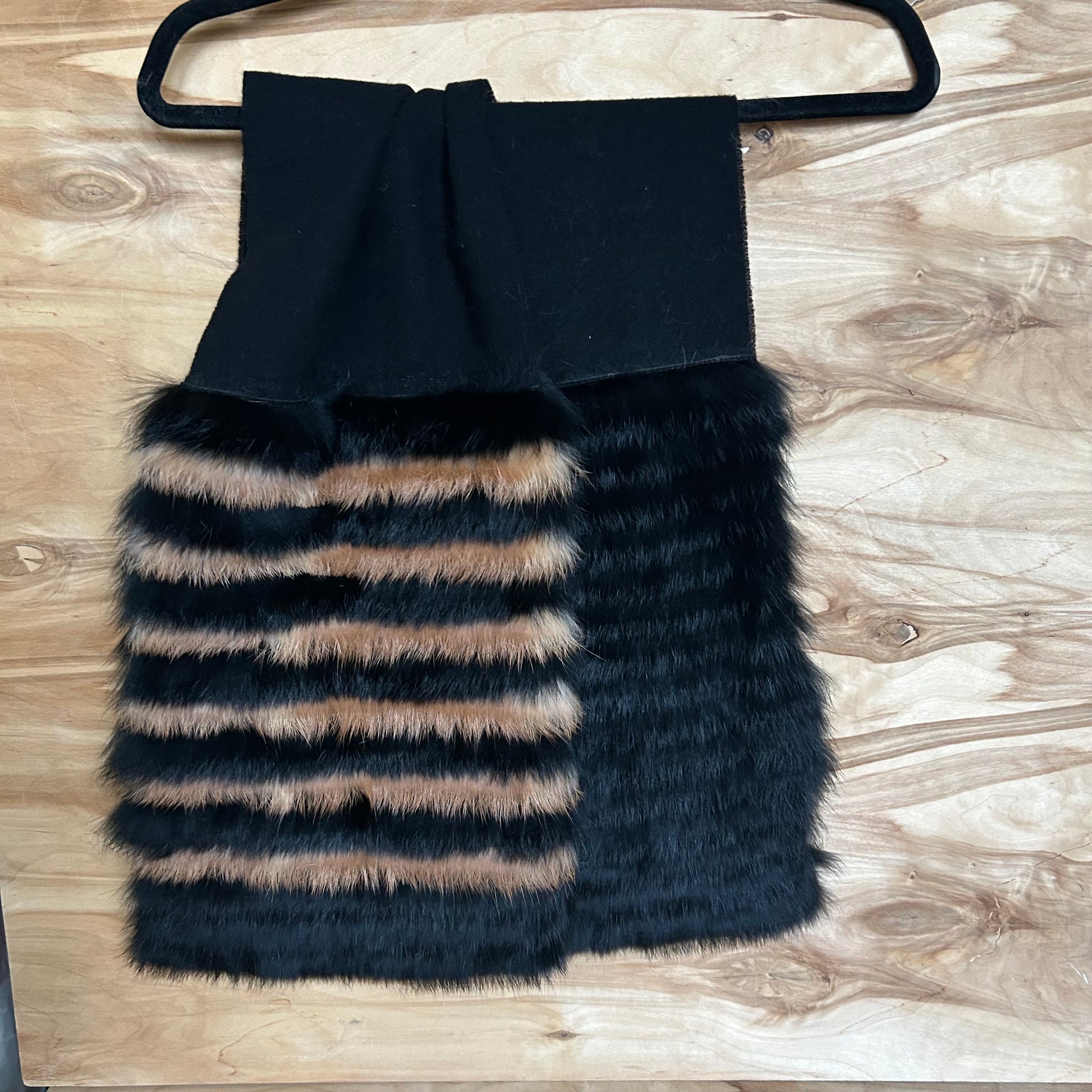 Melna vilnas auduma šalle ar abpusēji dekoratīvām melnām un brūnām truša vilnas malām.