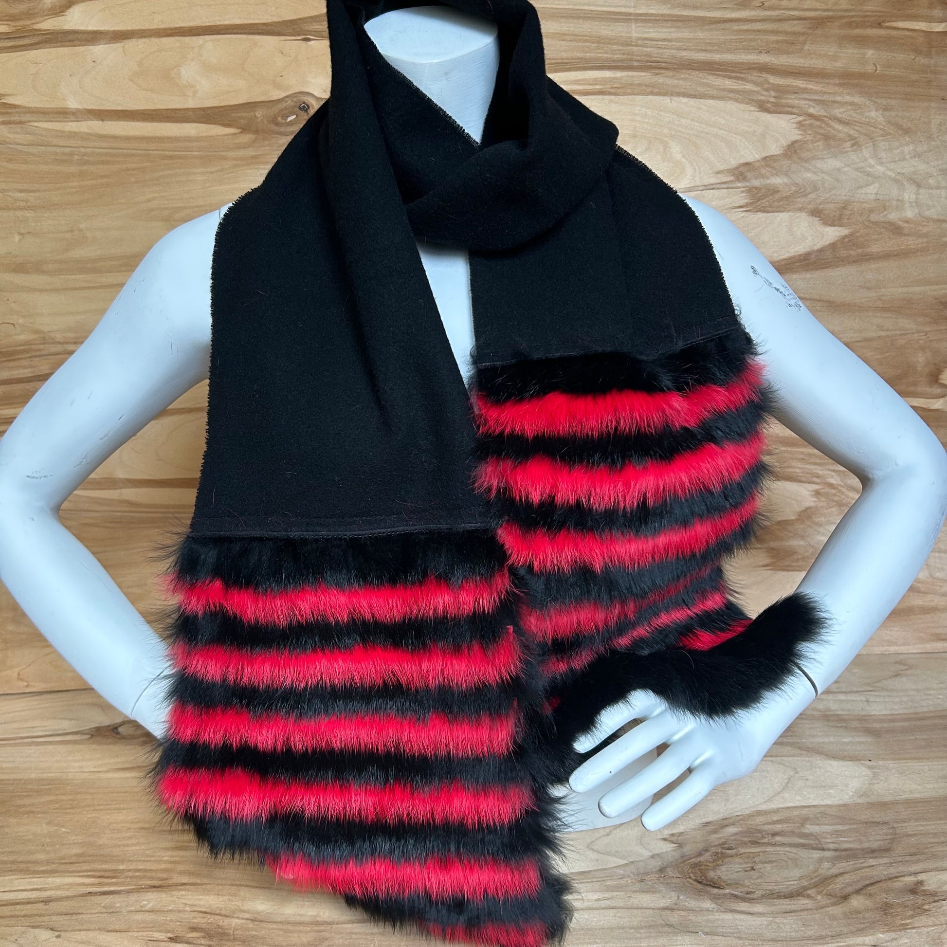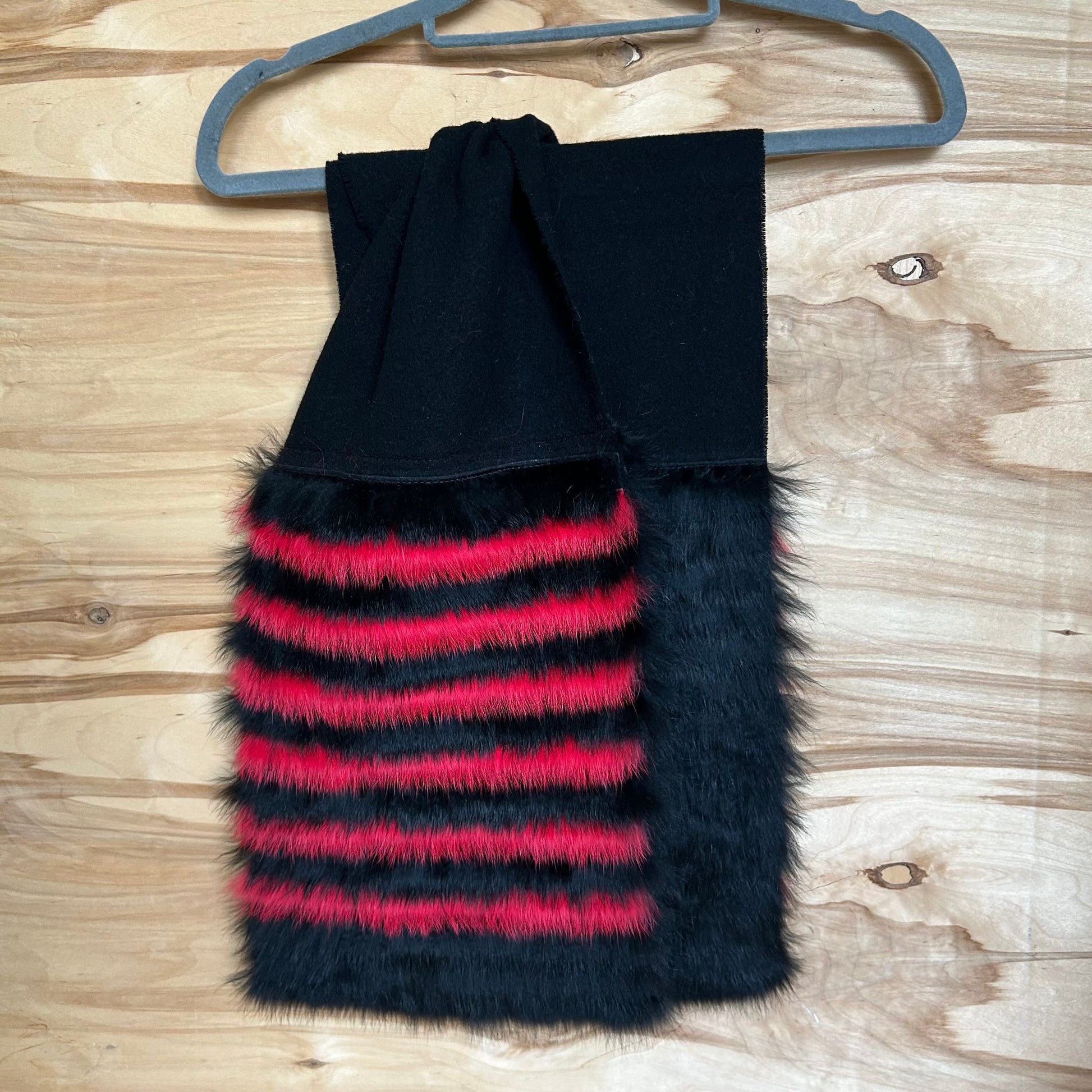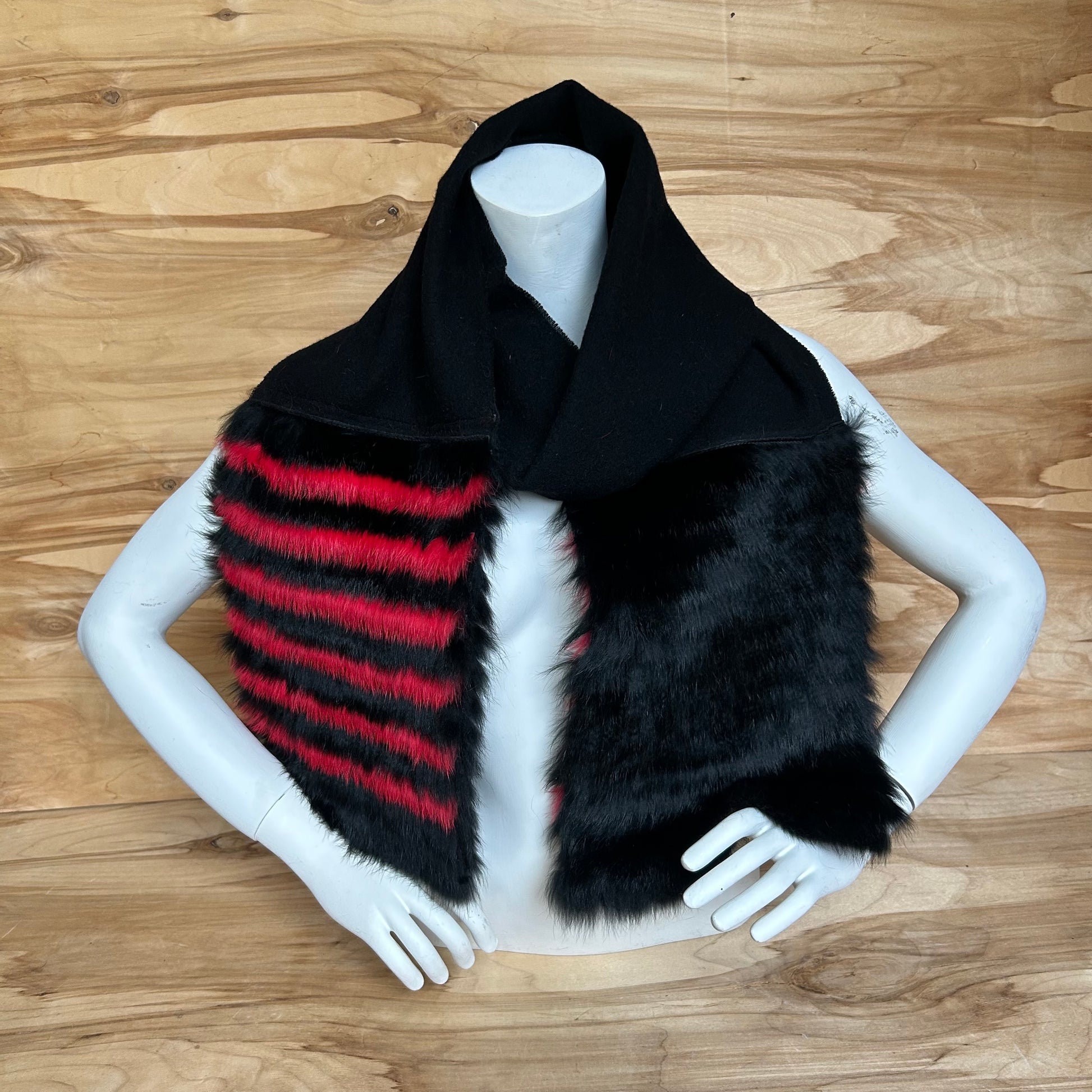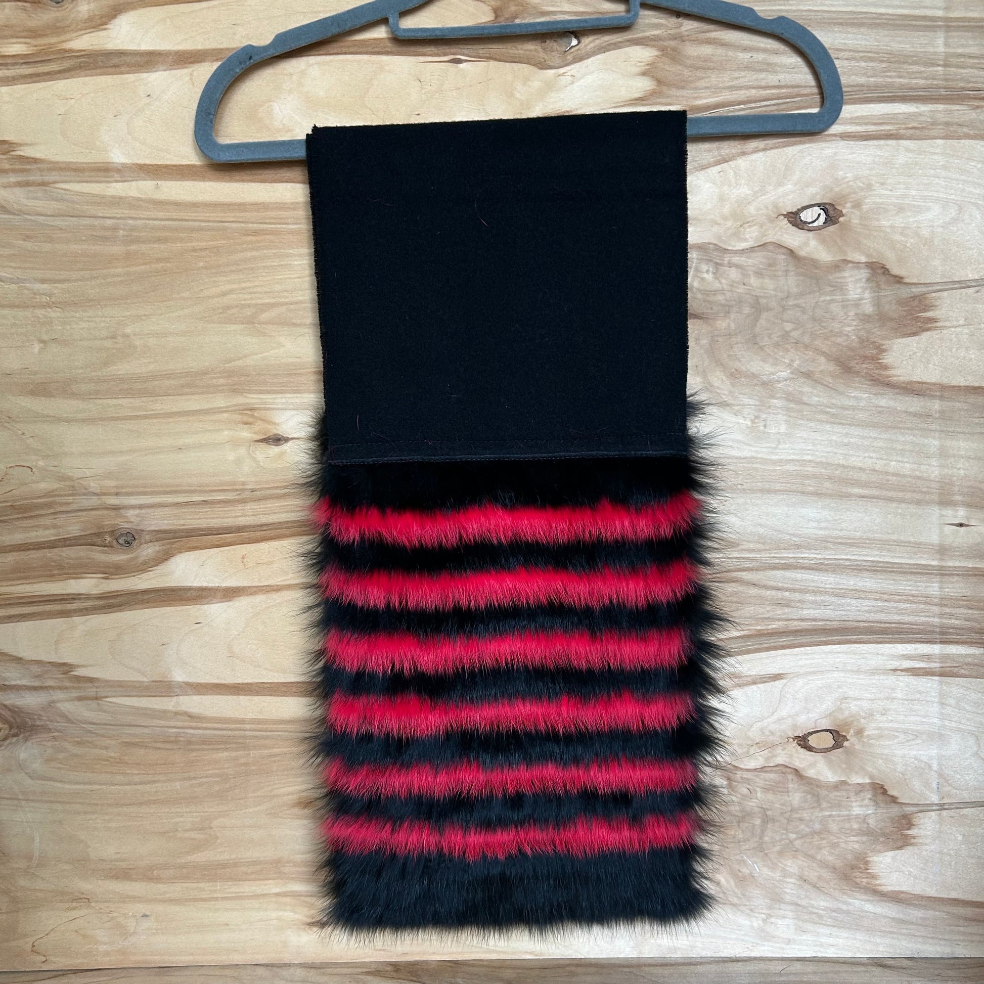 Melna vilnas auduma šalle ar abpusēji dekoratīvām melnām un koši sarkanām truša vilnas malām.