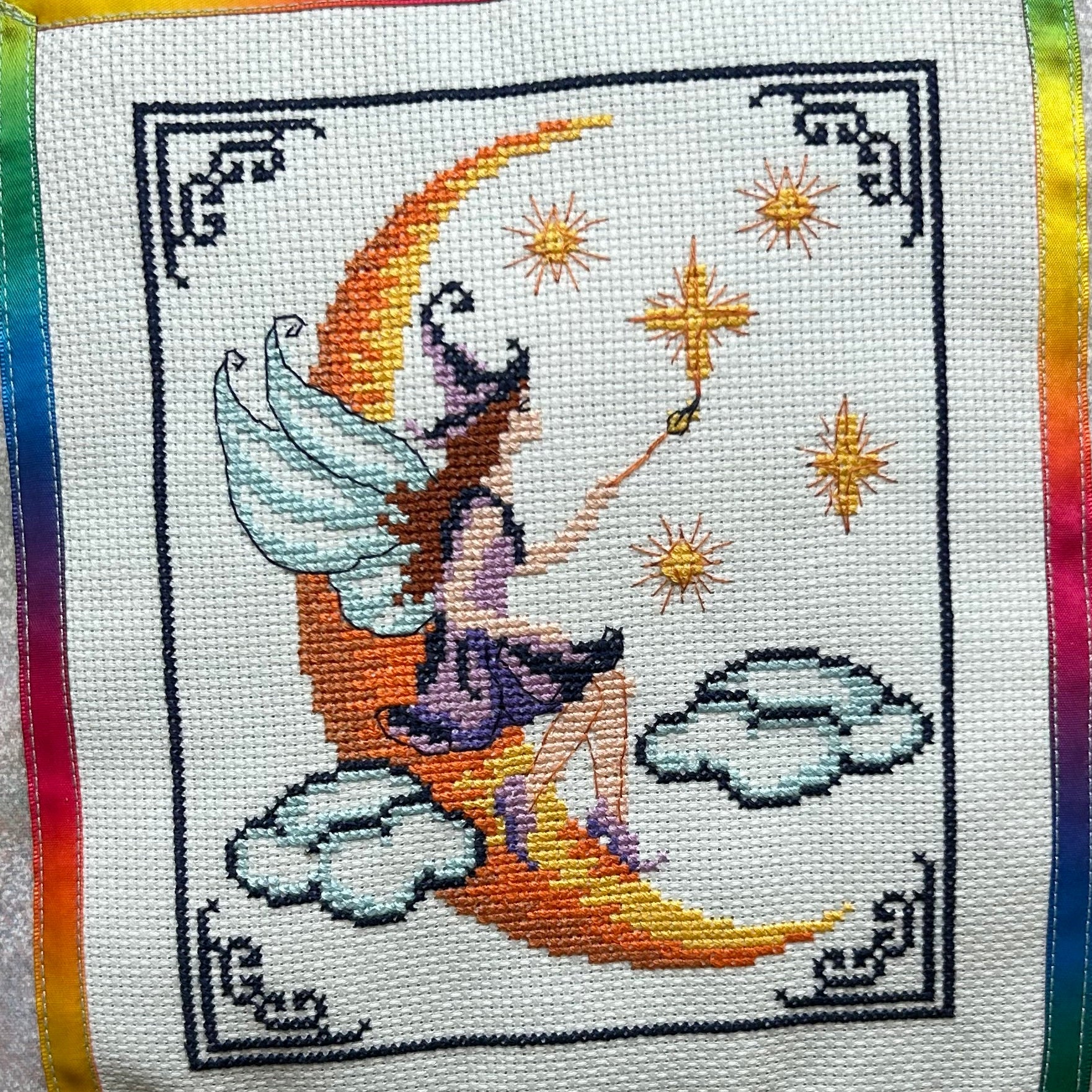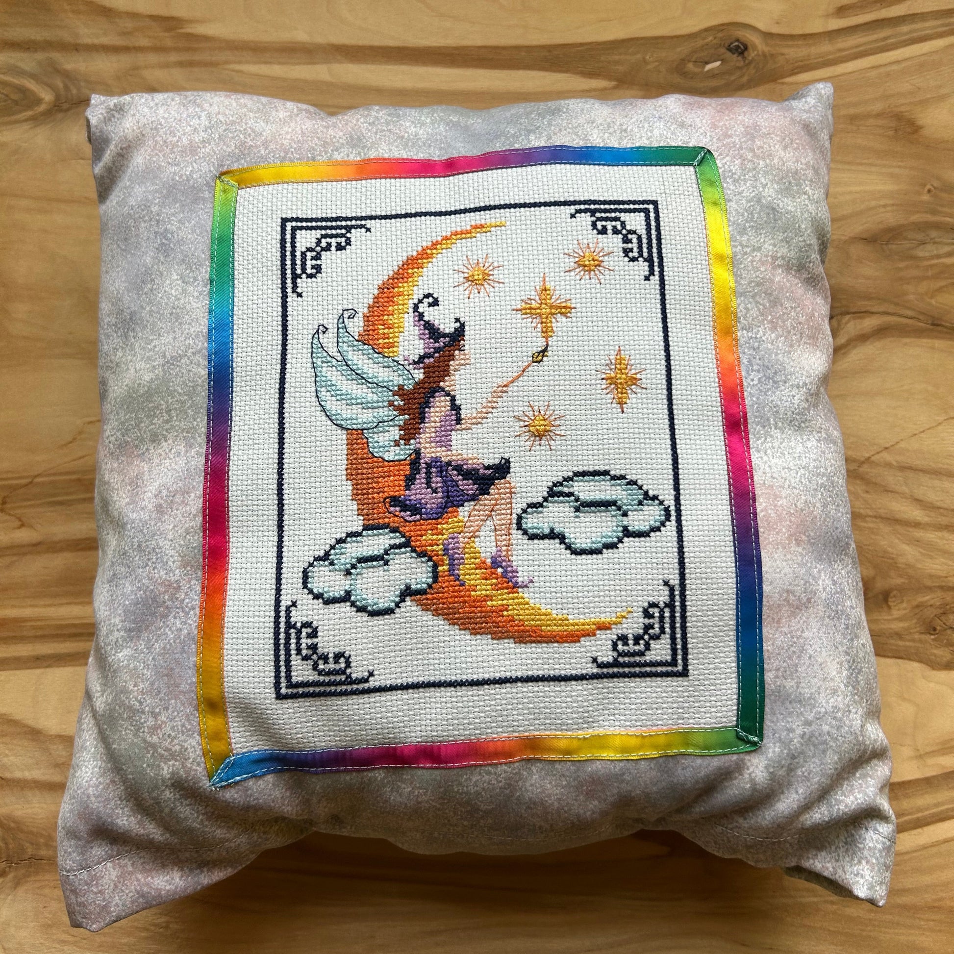Mīksts kokvilnas auduma spilvens, virsma rotāta ar rūpīgi krustdūrienā izšūtu zīmējumu- dekors "Feja uz mēness".