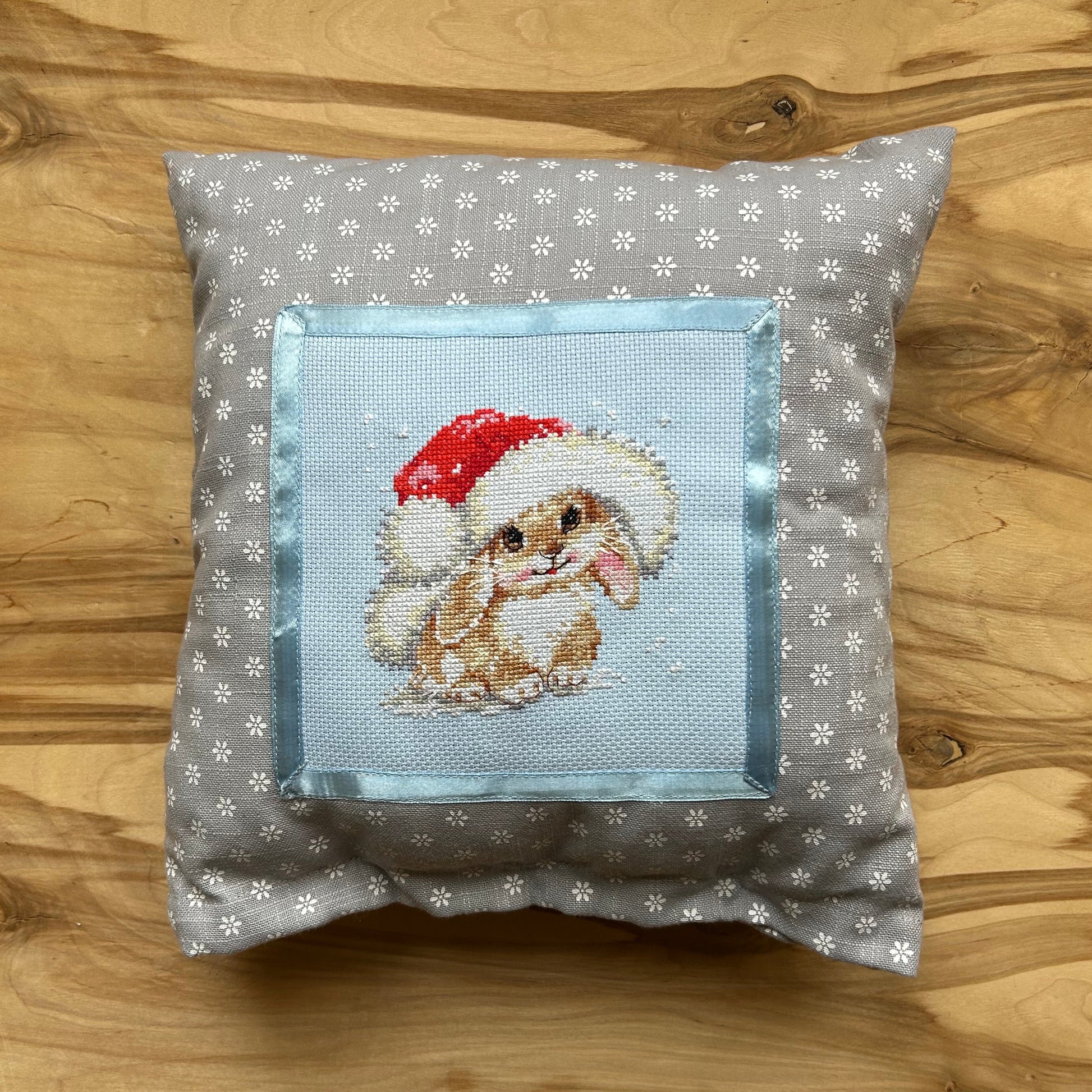 Mīksts kokvilnas auduma spilvens, virsma rotāta ar rūpīgi krustdūrienā izšūtu zīmējumu- dekors "Trusītis ar rūķa cepuri".