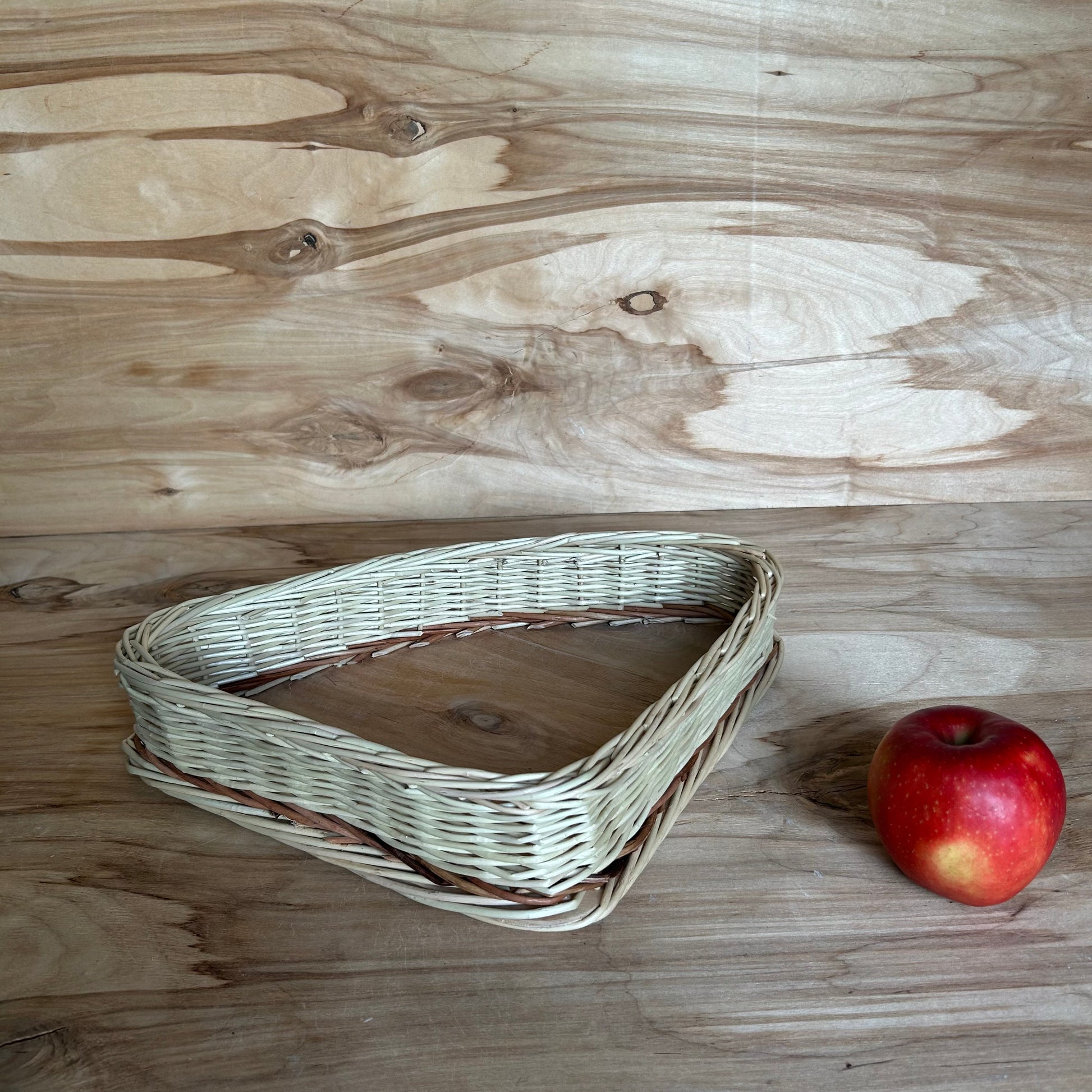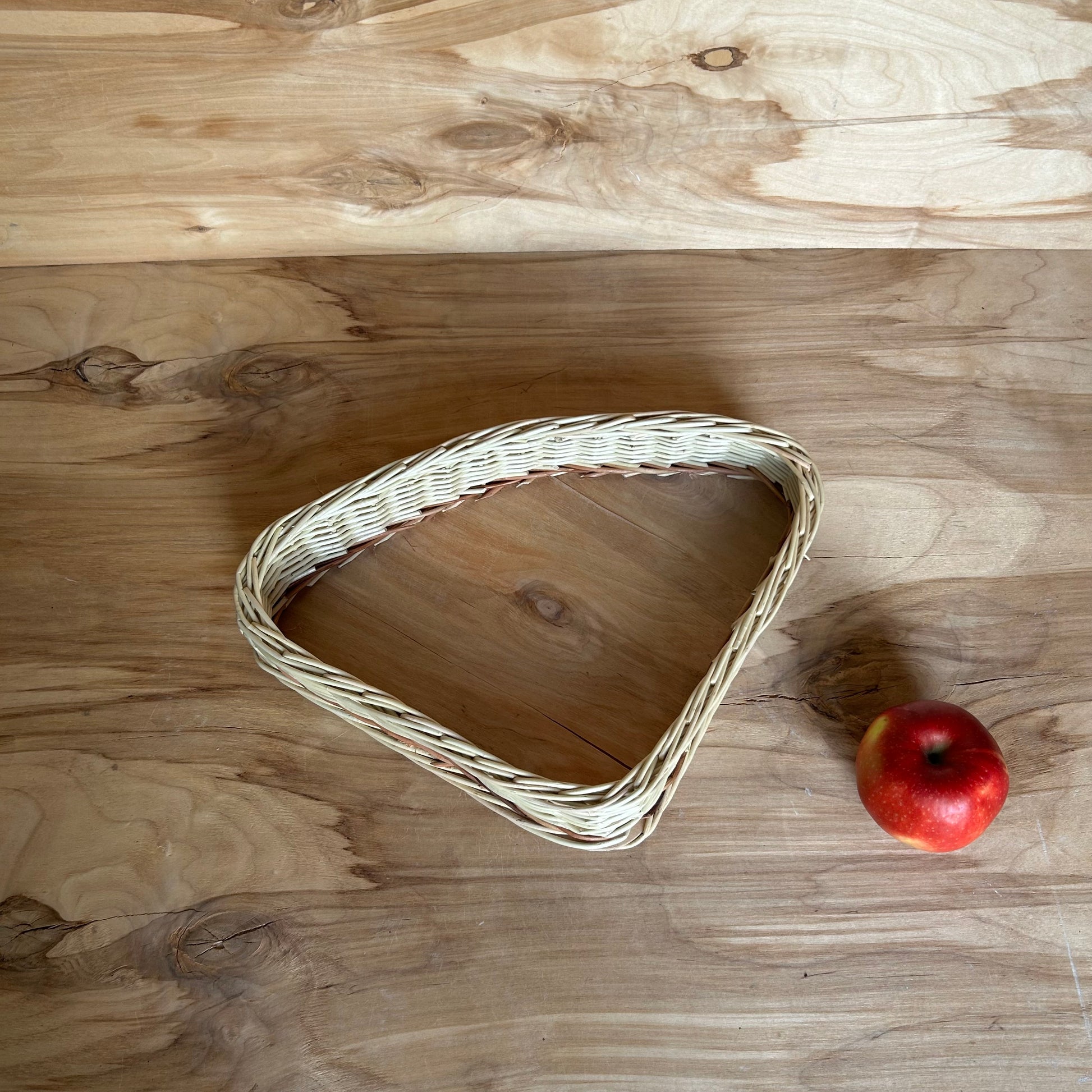 Rokām pīts mizotu klūgu groziņš trijstūra formas. Groziņa - paplātes izmērs - 32x25 cm, malas augstums 6 cm.