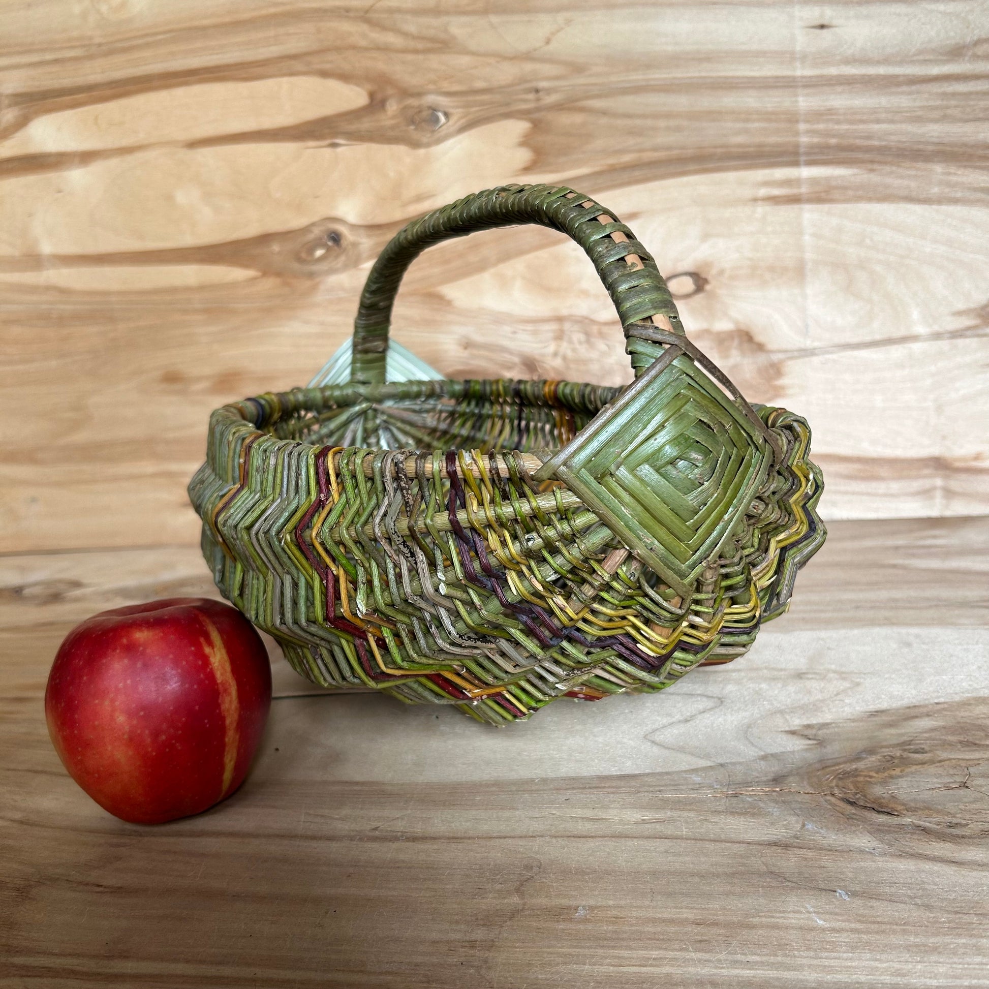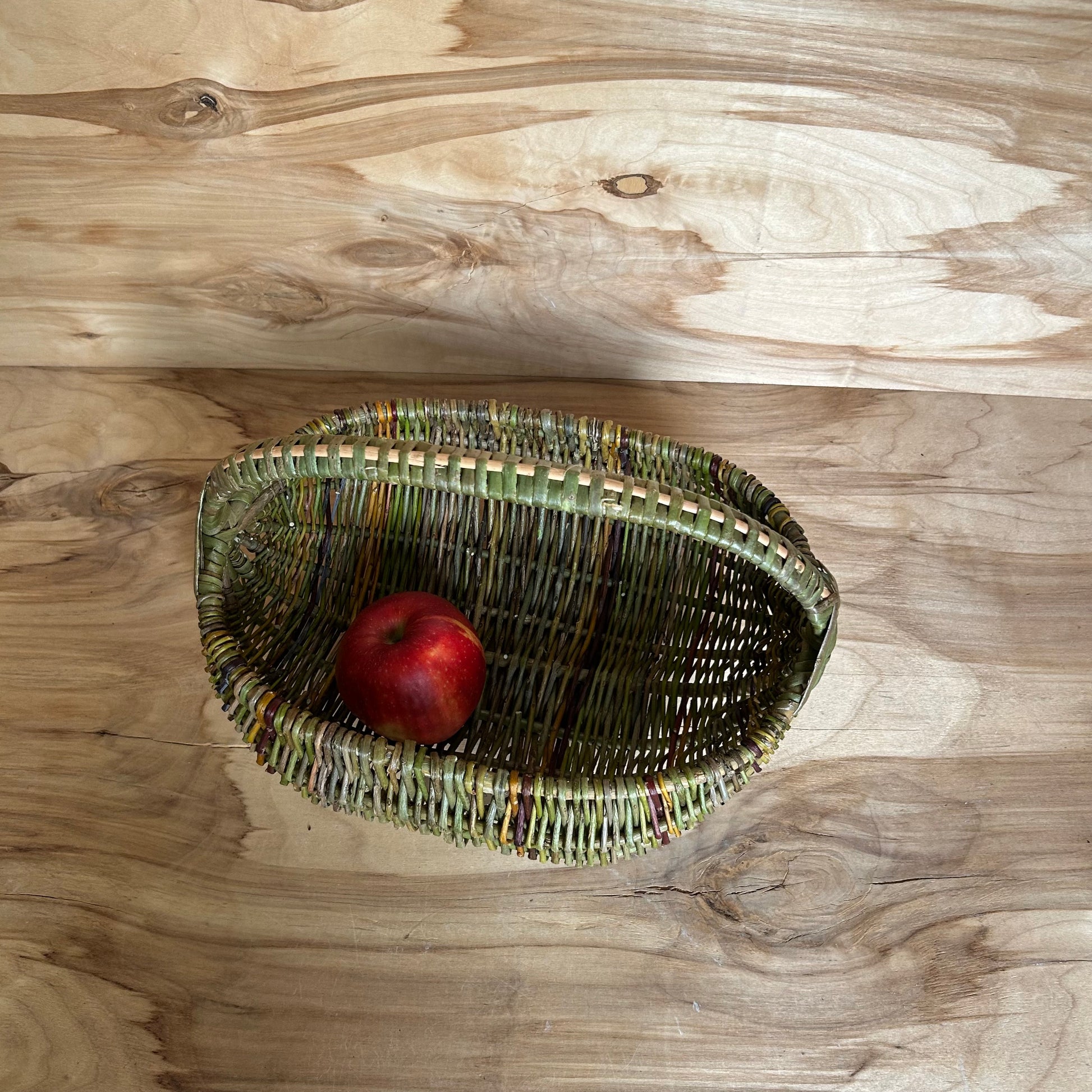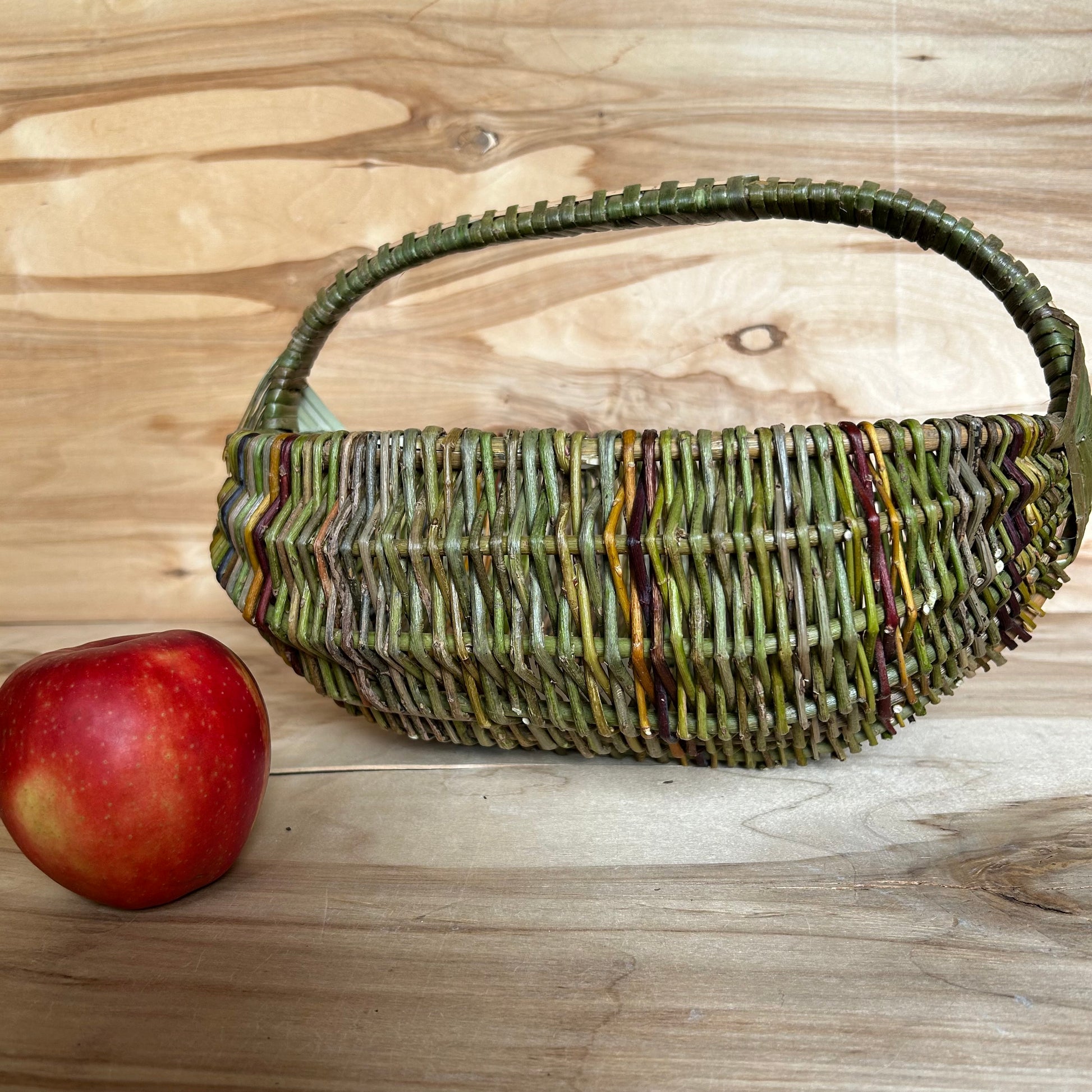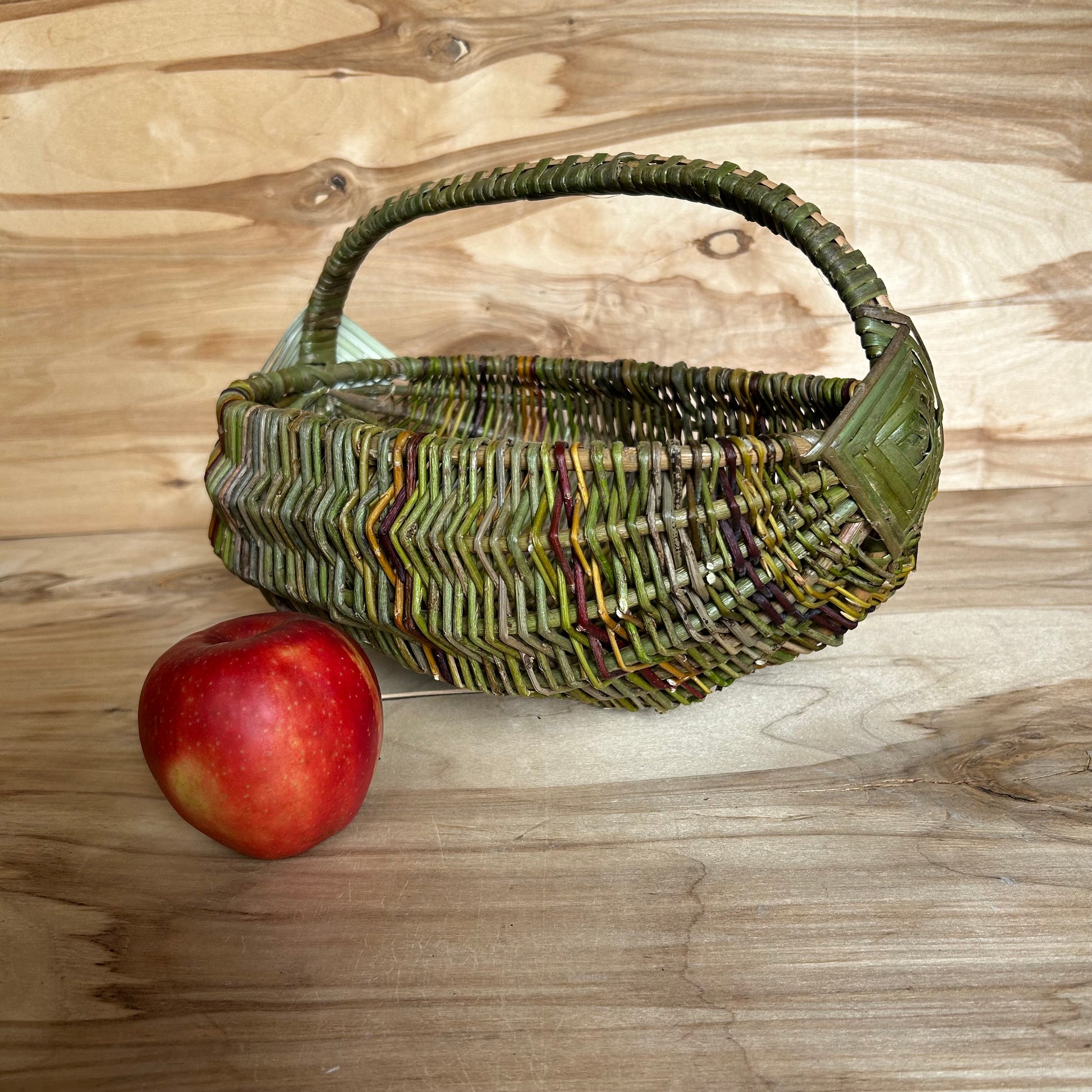 Rokām pīts ieapalas formas vidēja lieluma nemizotu klūgu grozs zaļganbrūnās krāsās. Zaļganbrūns rombiņš un brūns rokturis. Groza izmērs 21x29 cm, malas augstums ~13 cm, augstums ar rokturi ~23 cm.