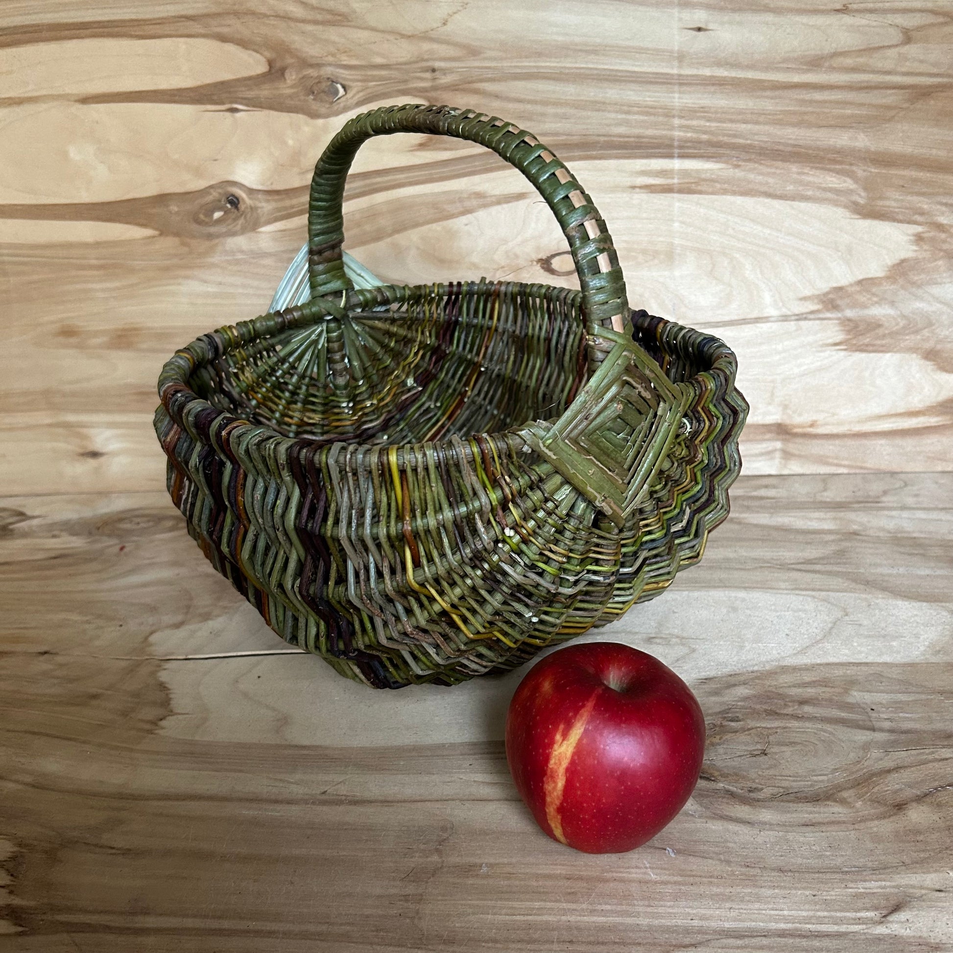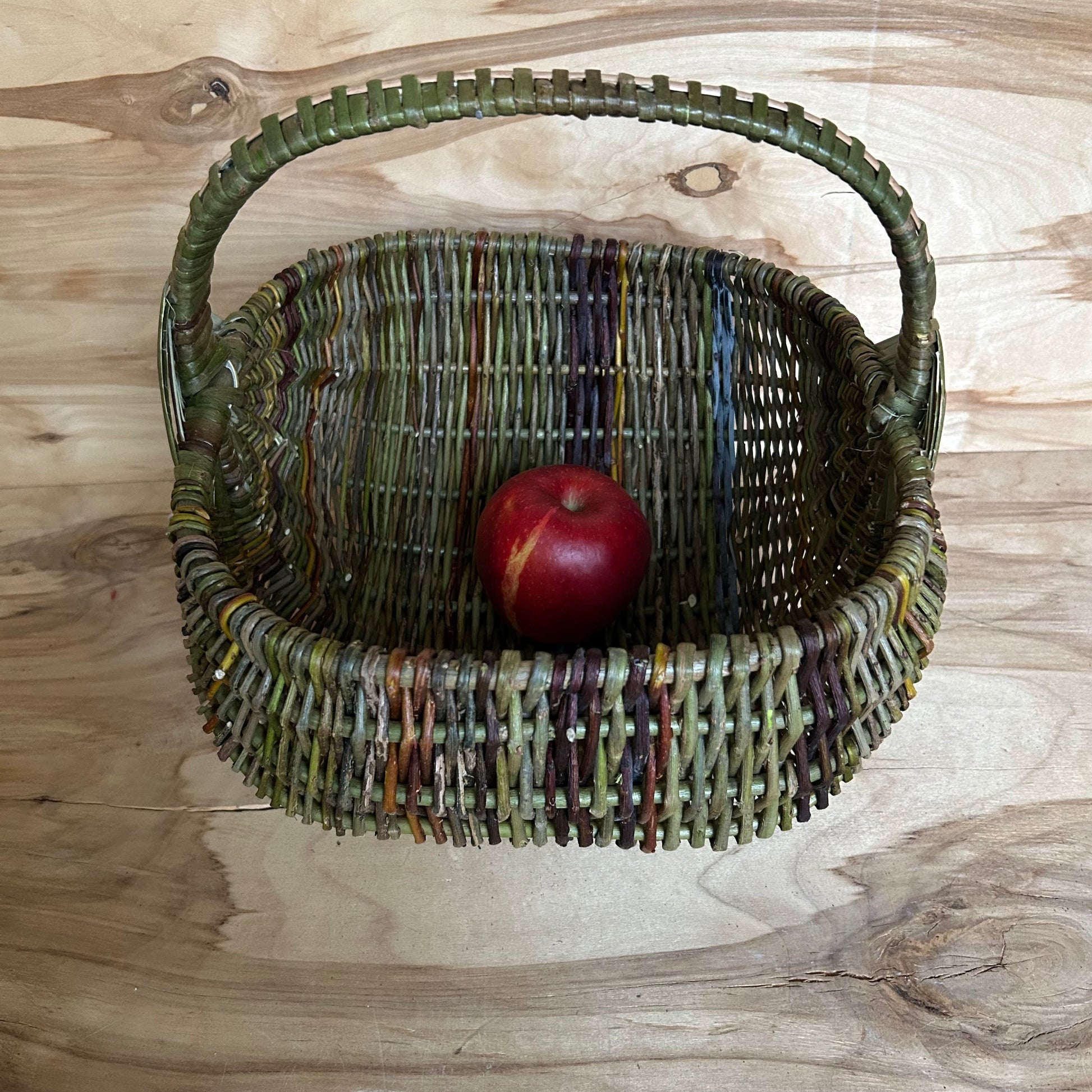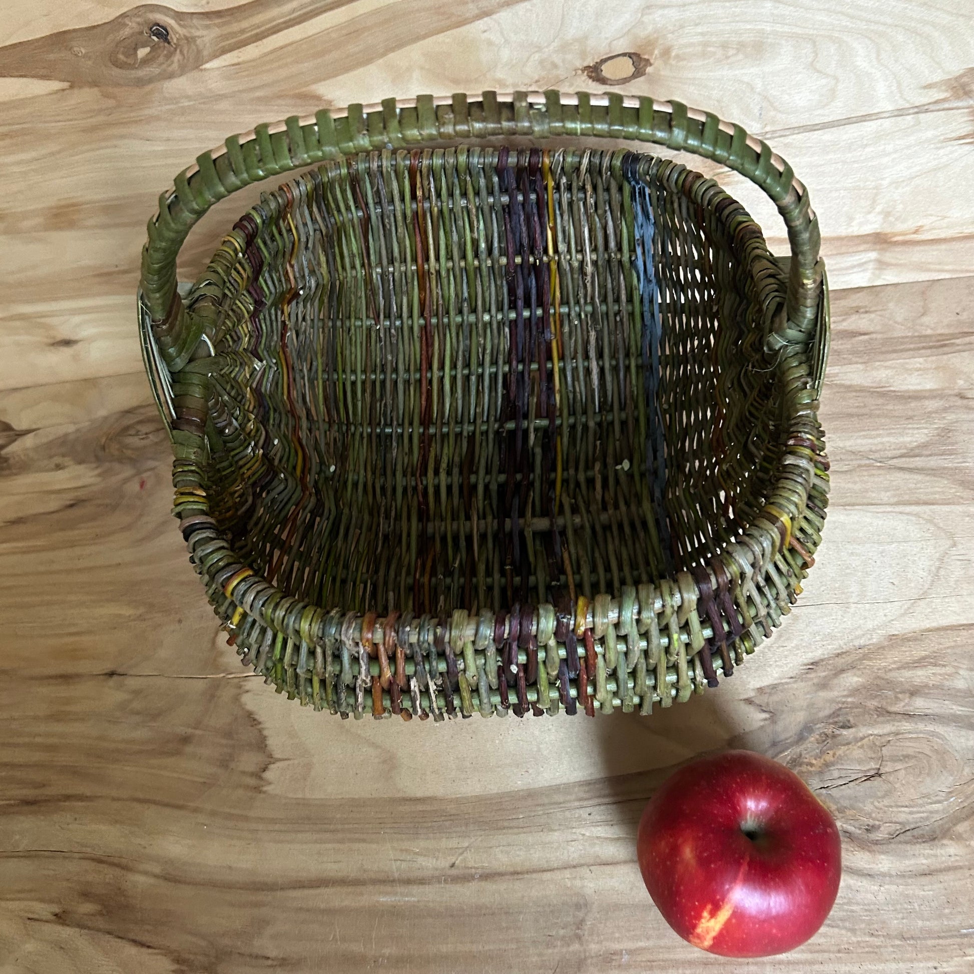 Rokām pīts kvadrātains formas vidēja lieluma nemizotu klūgu grozs zaļganbrūnās krāsās. Zaļganbrūns rombiņš un brūns rokturis. Groza izmērs 27x27 cm, malas augstums ~16 cm, augstums ar rokturi ~28 cm.