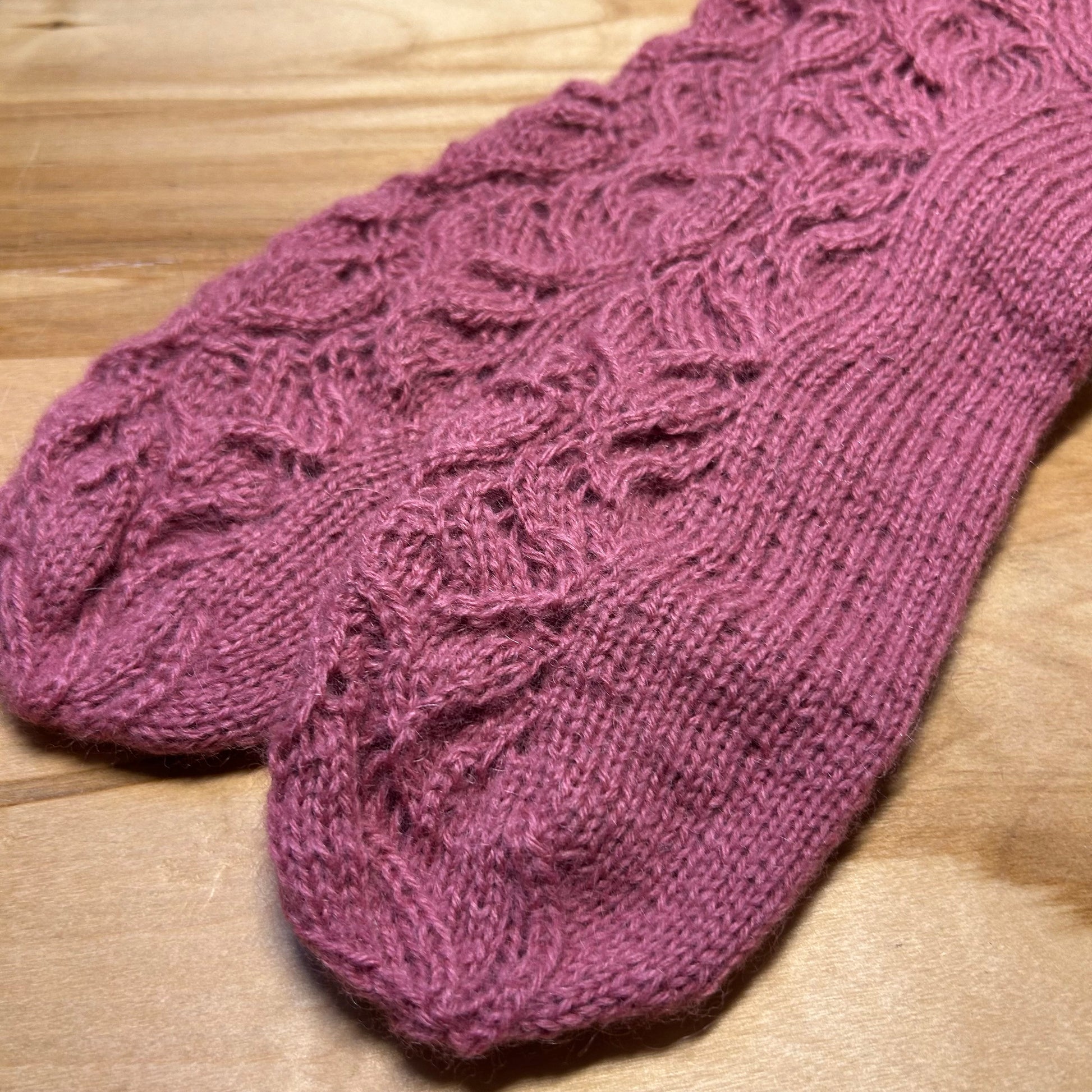 Rokām mežģīņu rakstā adītas rozā krāsas siltās zeķes 38.-40. izm. Stulma augstums ~13 cm / pēdas garums ~25 cm.