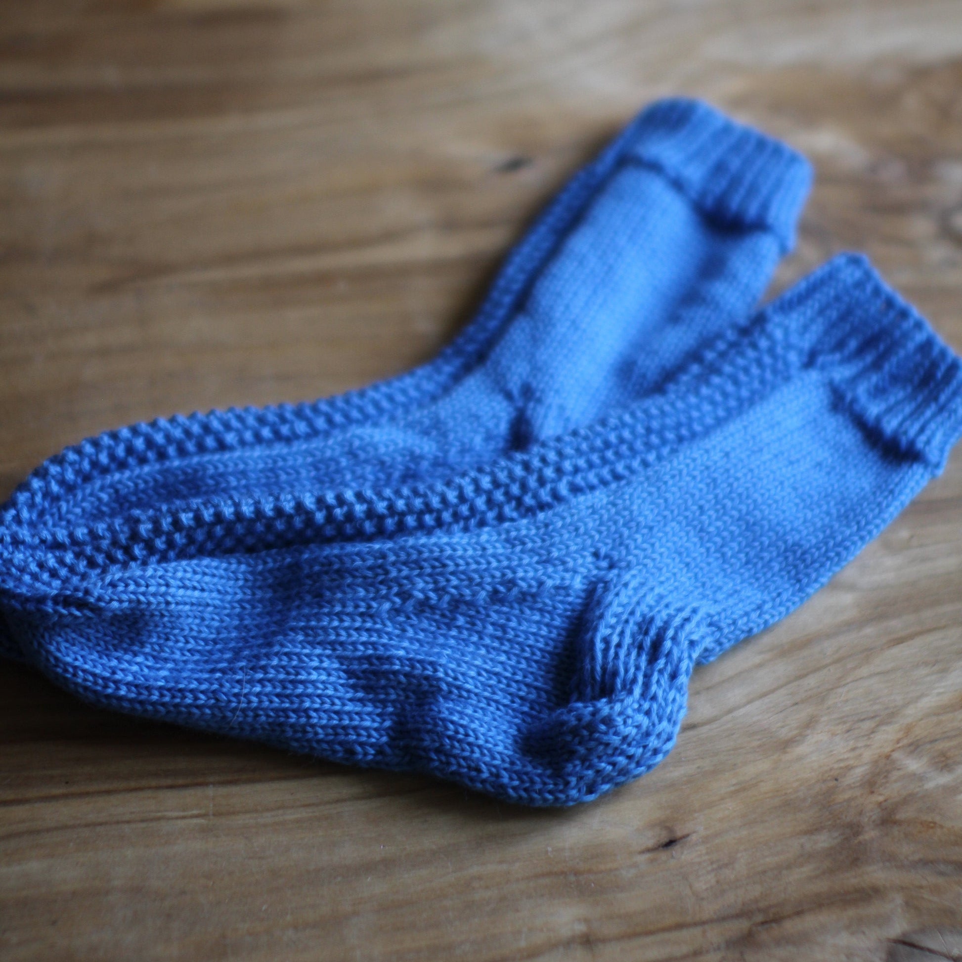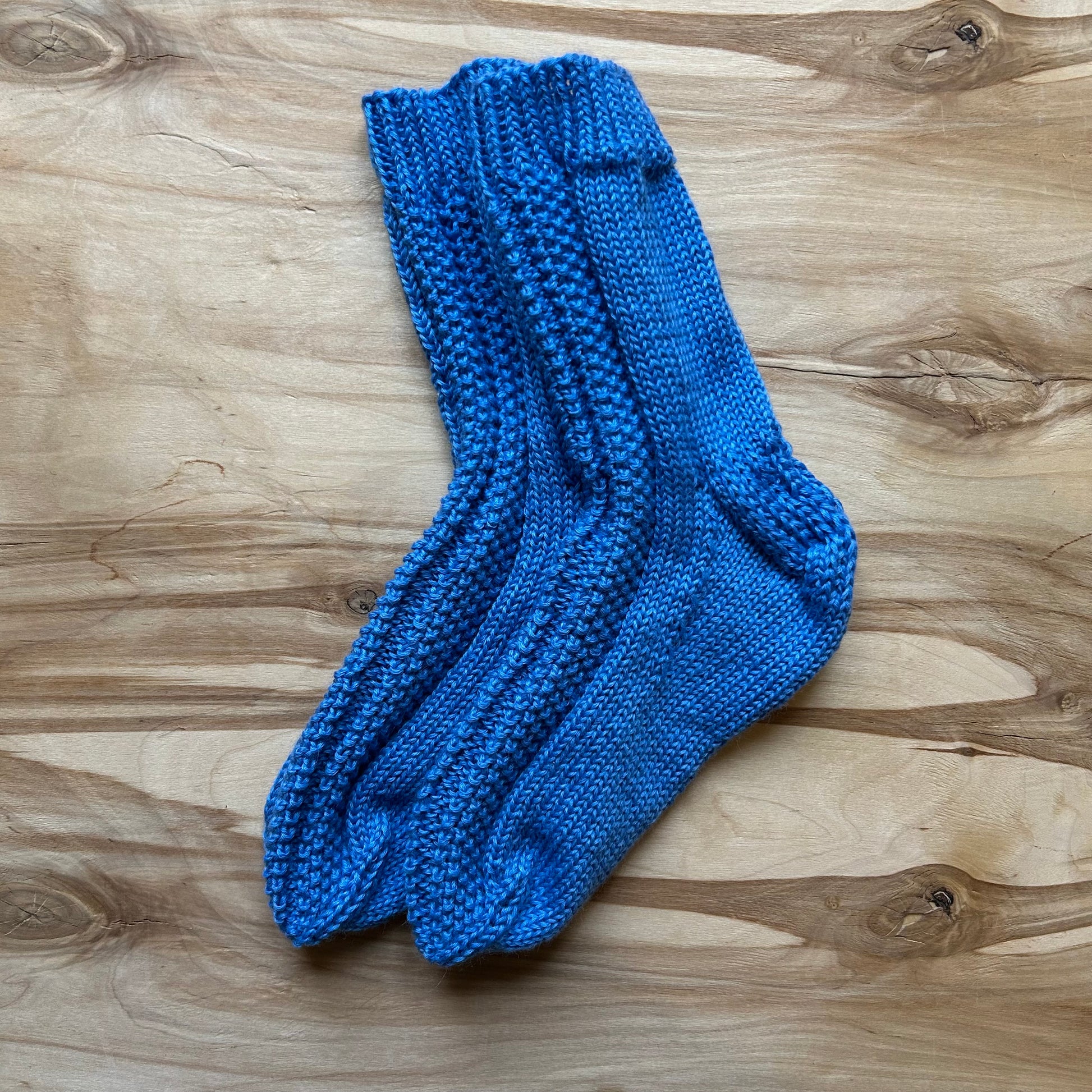 Rokām adītas koši zilas siltās zeķes 35.-37.izm. līdzenā adījumā ar rakstainu pēdas virspusē un pa valnīti. Stulma augstums 16 cm / adītās pēdas garums neiestiepjot 22 cm.
