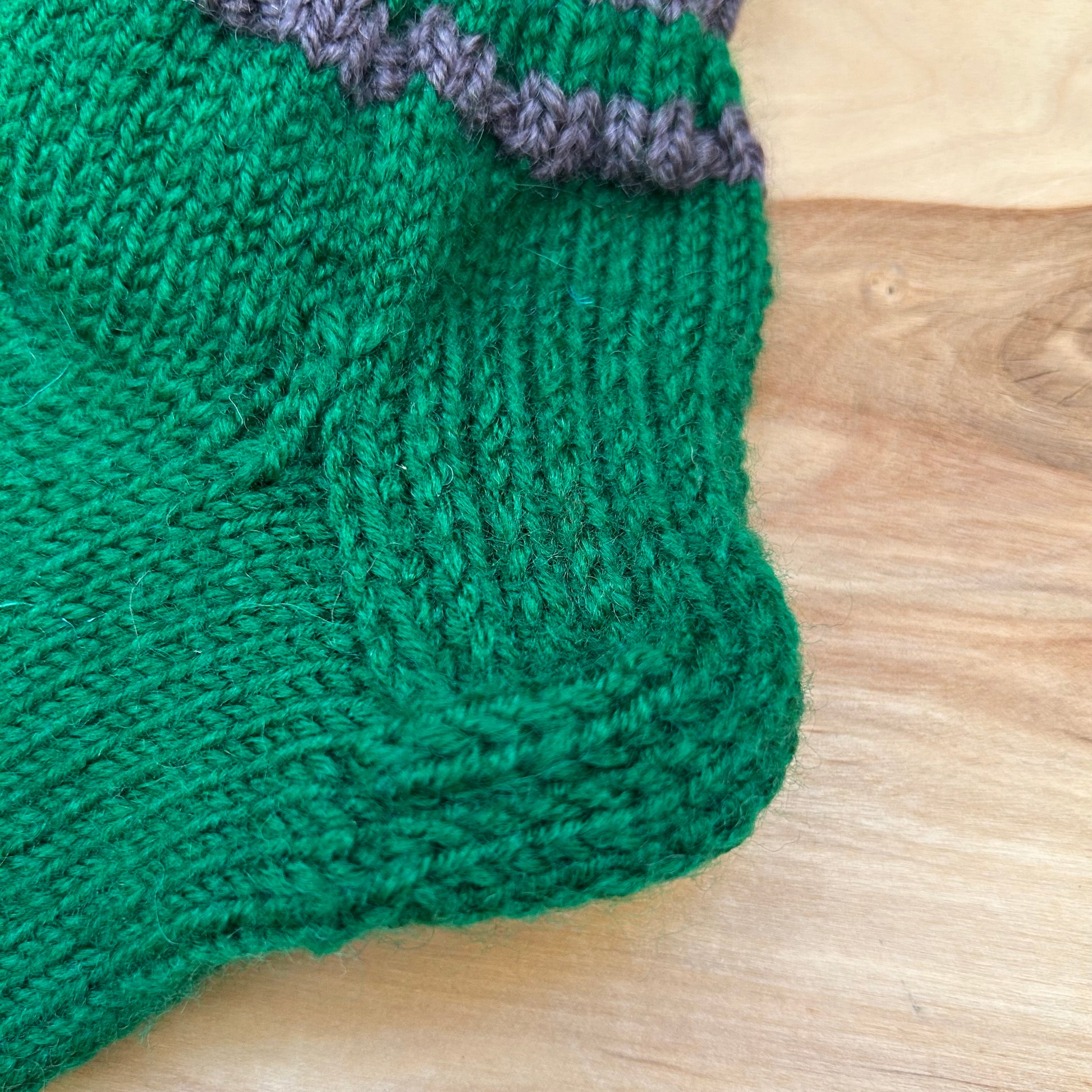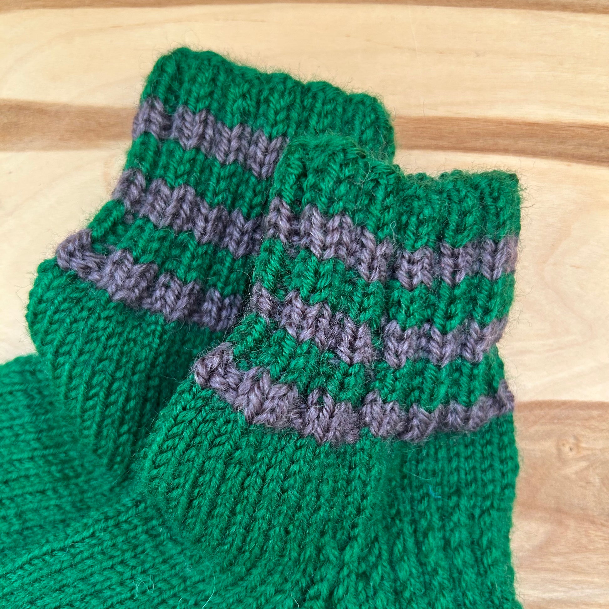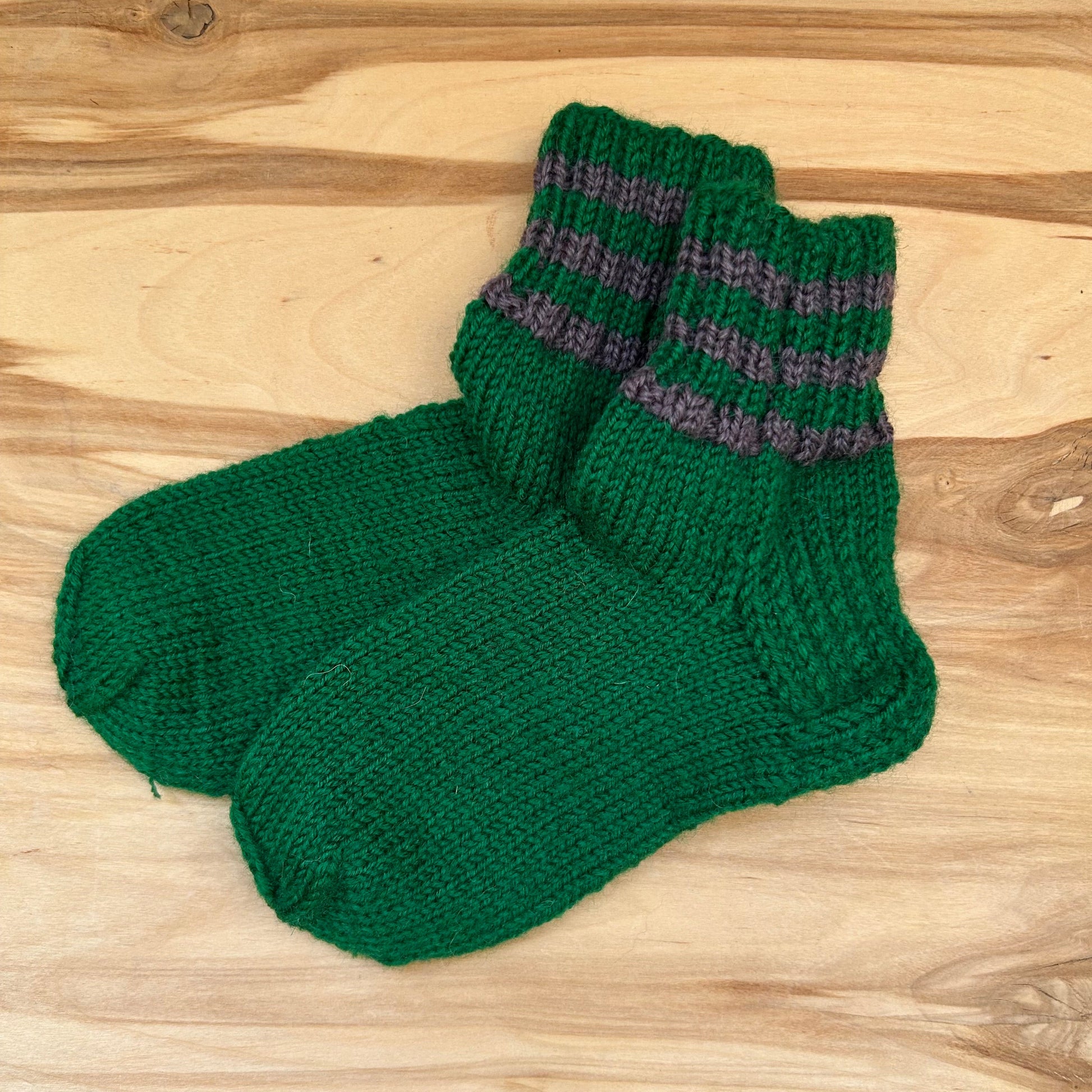 Rokām adītas siltās zeķes tumši zaļā krāsā ar pelēkām strīpām stulma daļā. 25.-27.izm. Stulma augstums ~8 cm / pēdas garums ~16 cm.