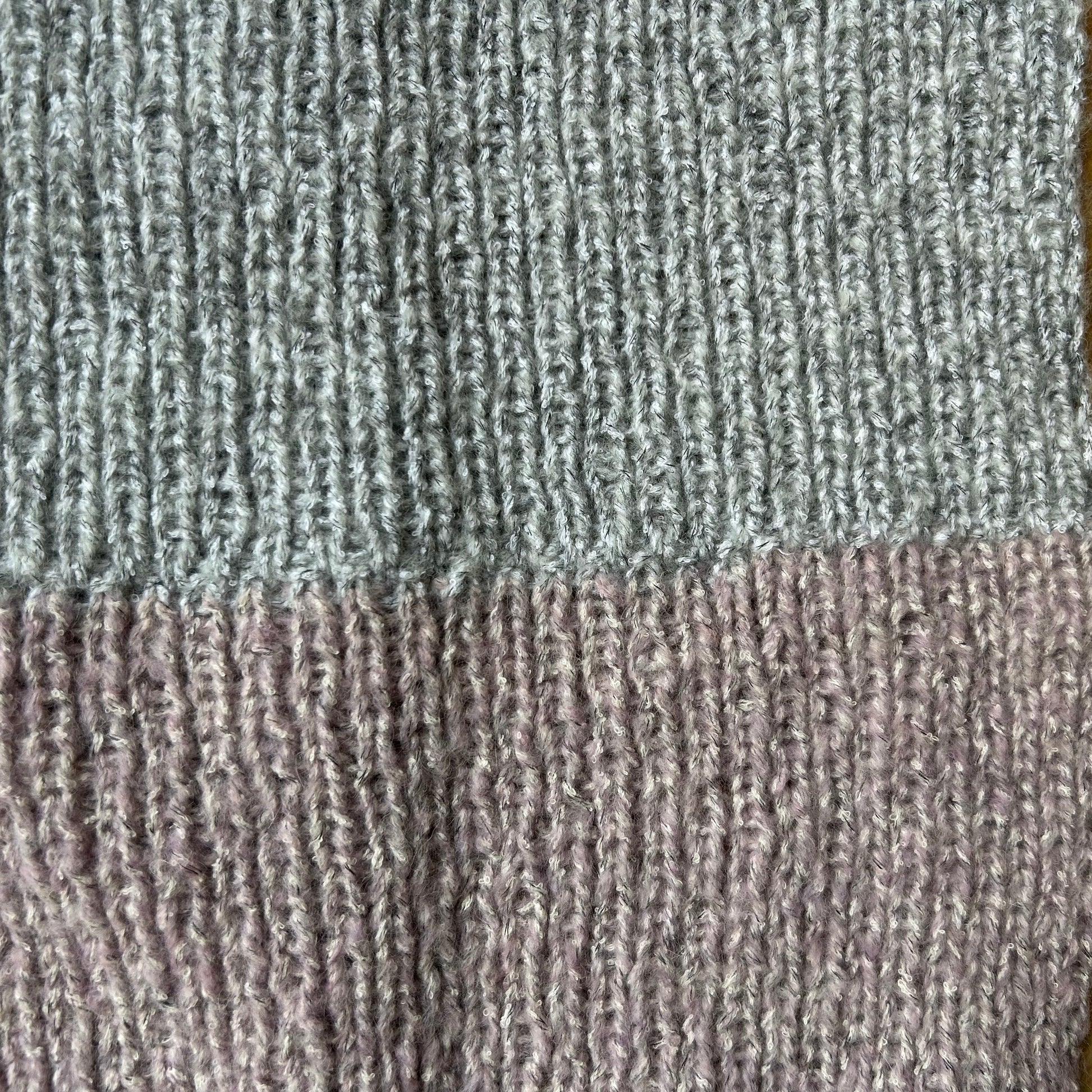 Roku darbs - no mīkstas dzijas rokām adīta - apjomīga izmēra pelēka šalle divos toņos, vienāda izmēra laukumos. Šalle neiestiepjot ~ 210x40 cm.