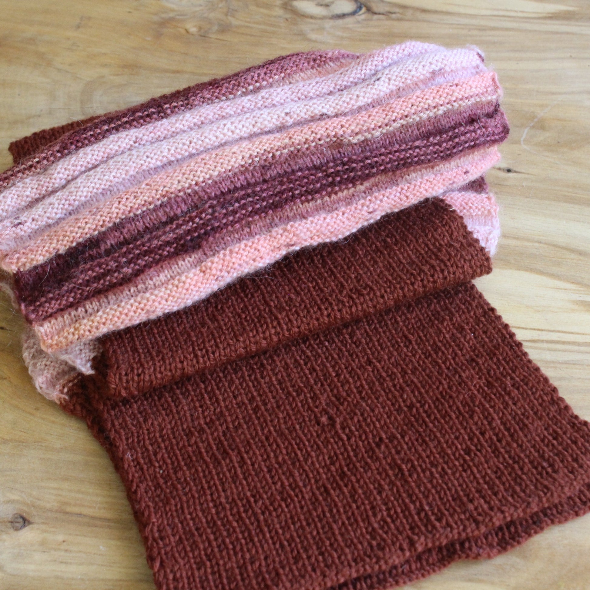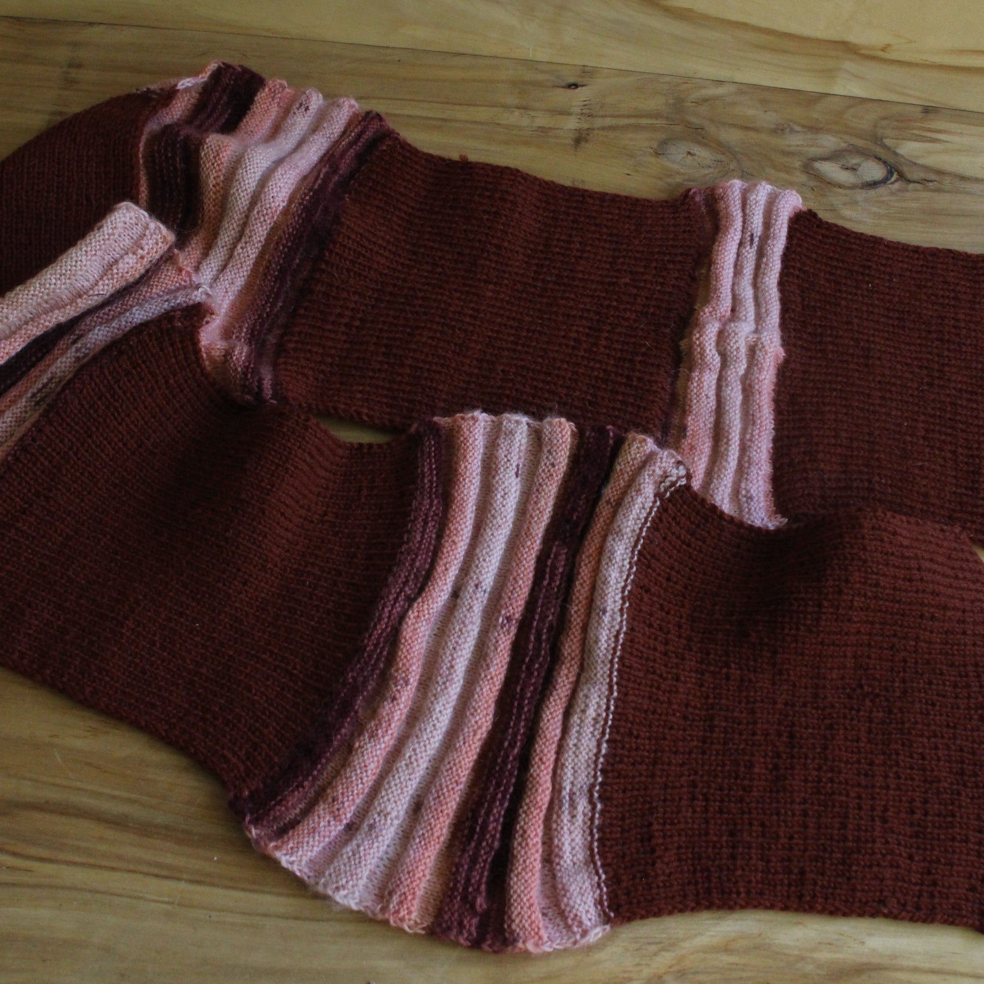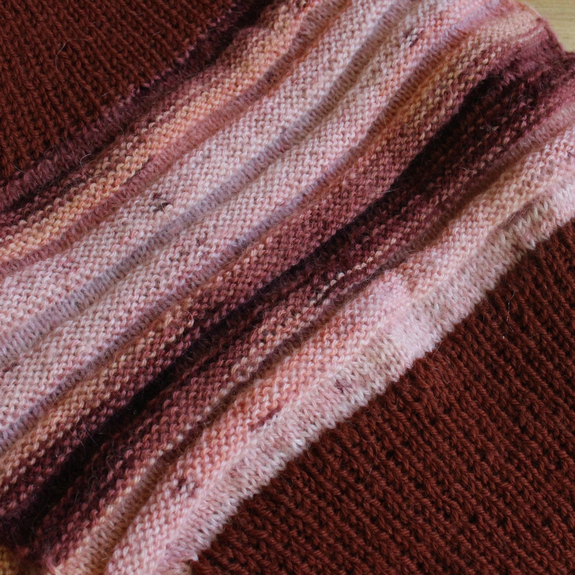 Roku darbs - no vidēji smalkas dzijas rokām adīta -brūna mohēras šalle ar ielaidumiem no melanža krāsainas dzijas brūnos toņos. dziju Šalle neiestiepjot ~ 180x25 cm.