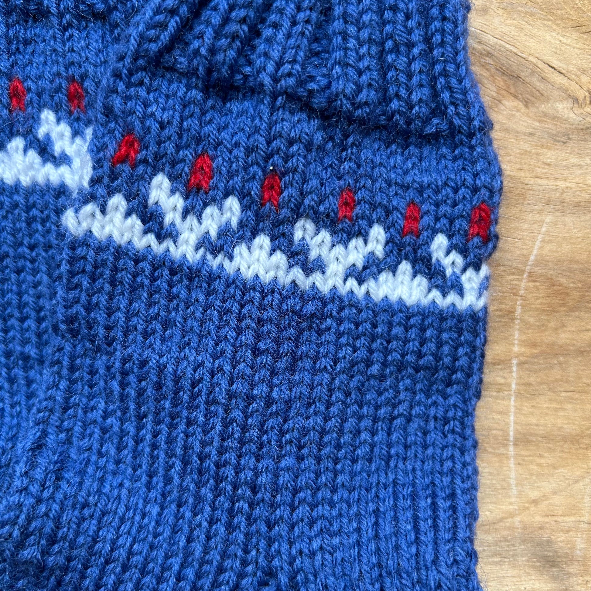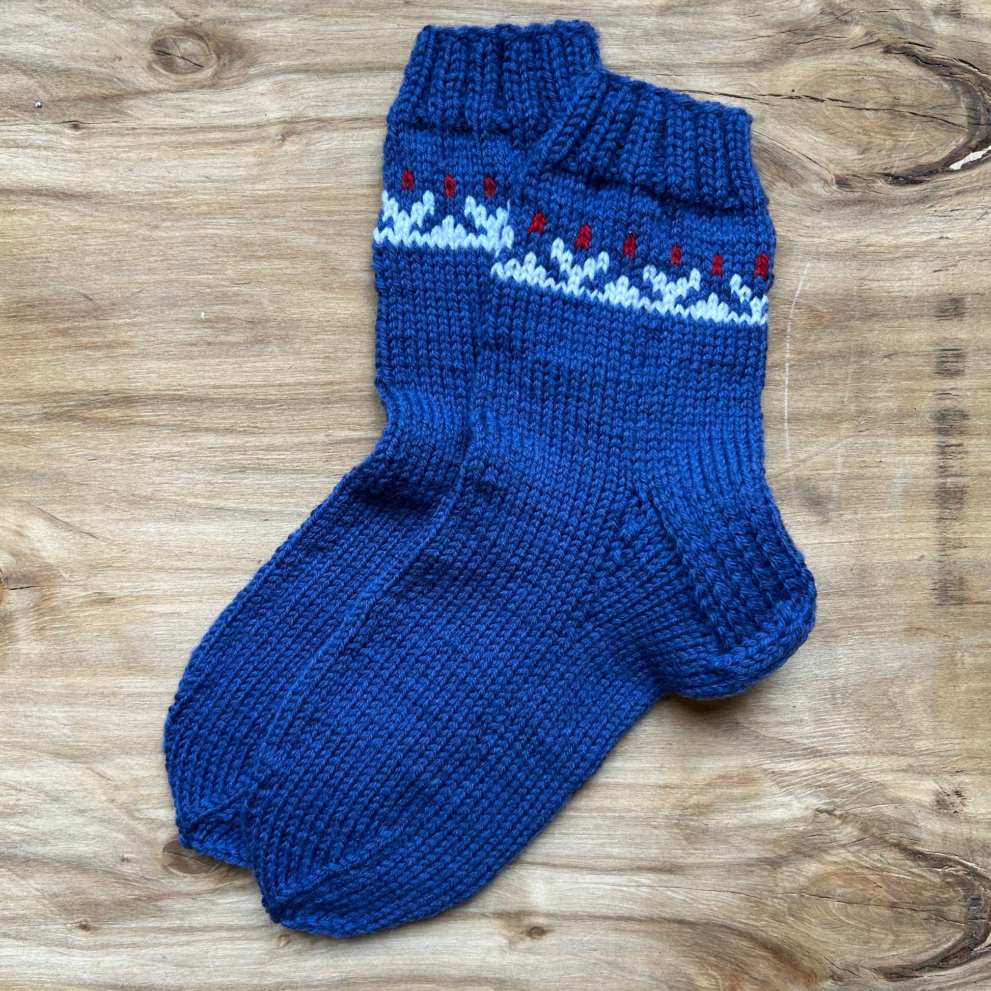 Rokām adītas vilnas zeķes zilā krāsā ar baltas un sarkanas krāsas ornamentu uz stulma no bērniem paredzētas dzijas. Stulma augstums 16 cm / adītās pēdas garums neiestiepjot 23 cm.