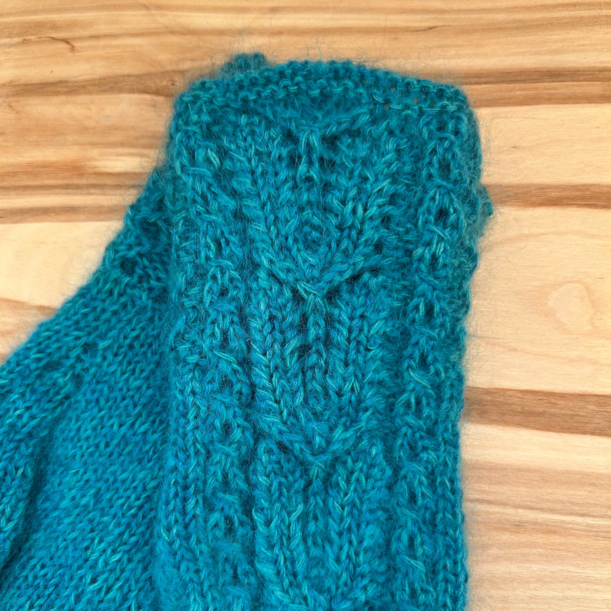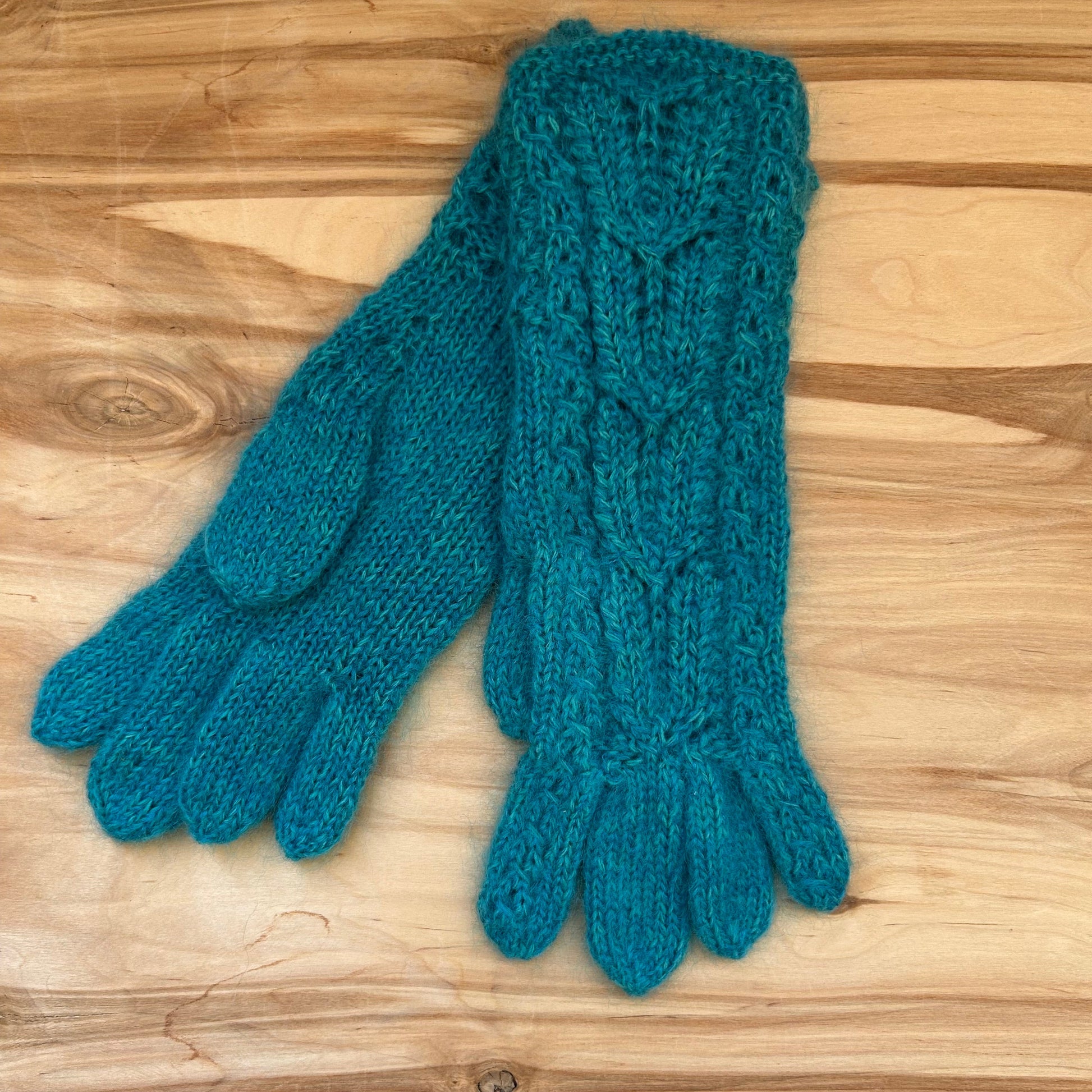 Rokām adīti pirkstaini cimdi tirkīzzilā krāsā ar dekoratīvu mežģīņraksta adījumu un pīni plaukstas virspusē un gludi adītu plaukstas apakšdaļu 30 x 10 cm (garums x platums) un atsevišķi ieadītiem pirkstiņiem.