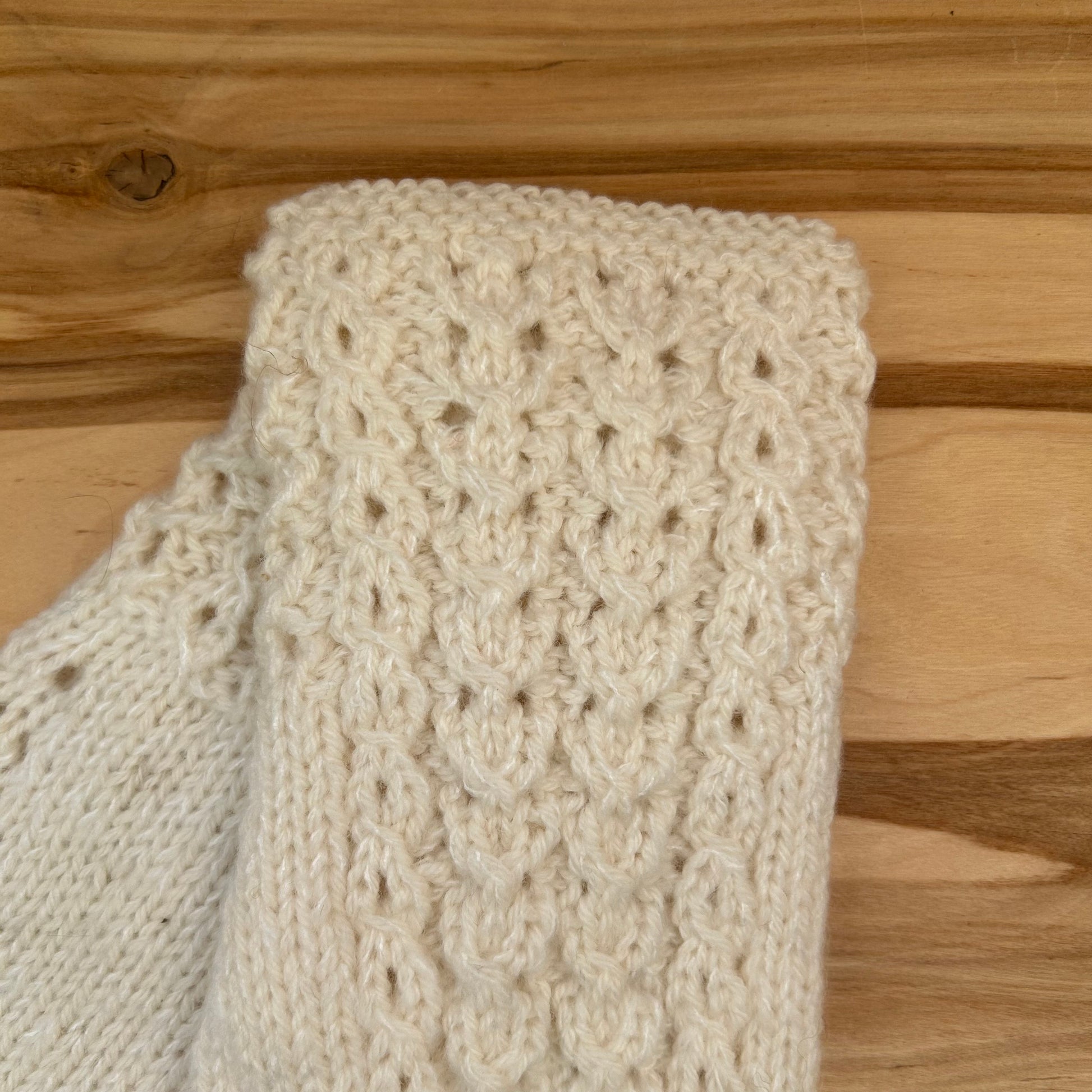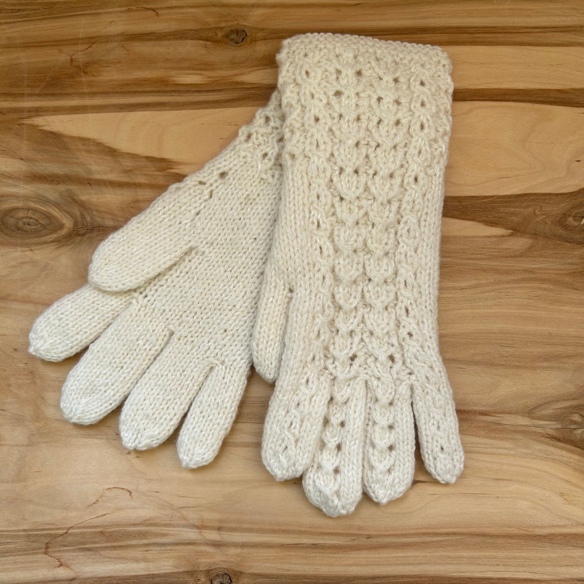 Rokām adīti pirkstaini cimdi baltā krāsā ar dekoratīvu mežģīņraksta adījumu plaukstas virspusē un gludi adītu plaukstas apakšdaļu 30 x 10 cm (garums x platums) un atsevišķi ieadītiem pirkstiņiem.
