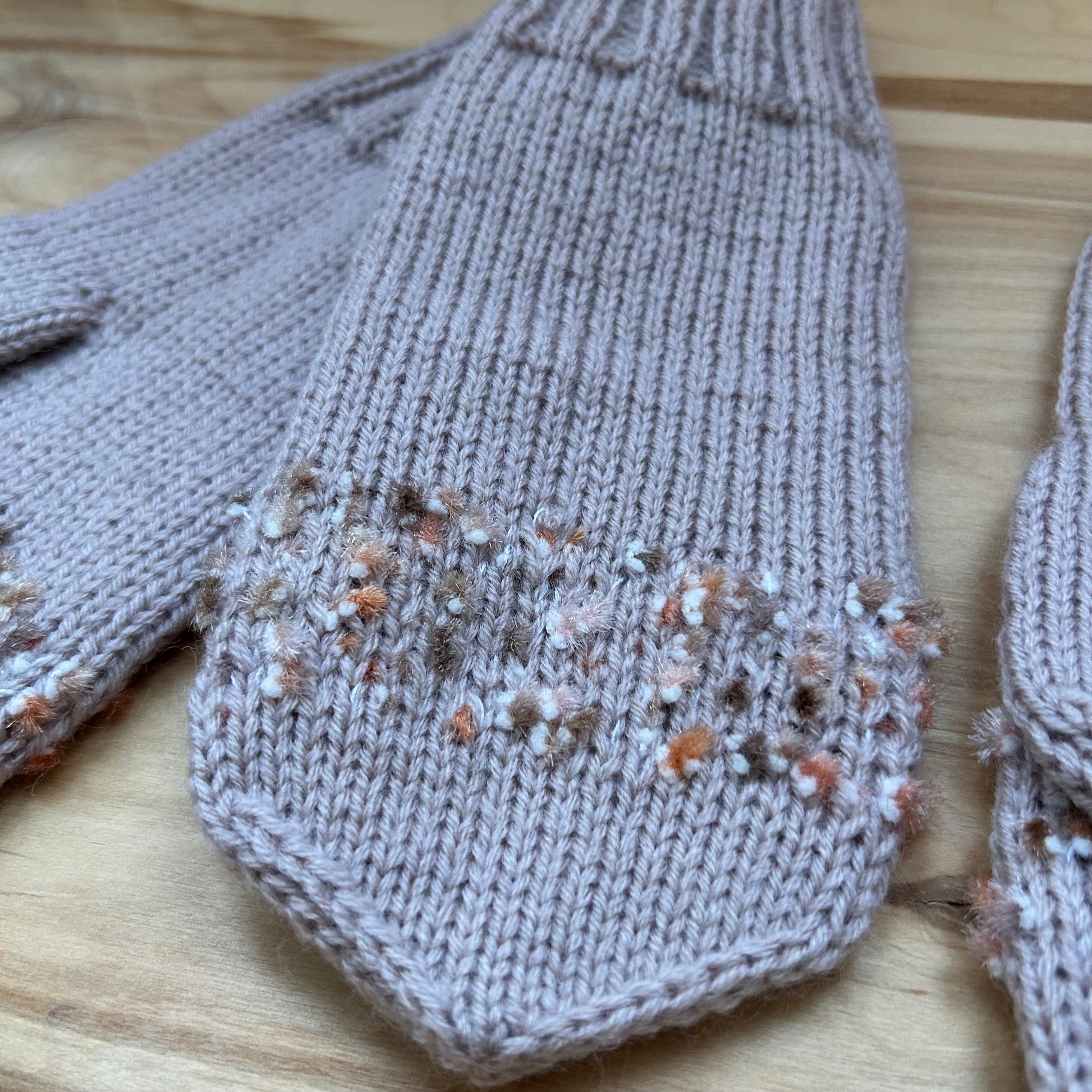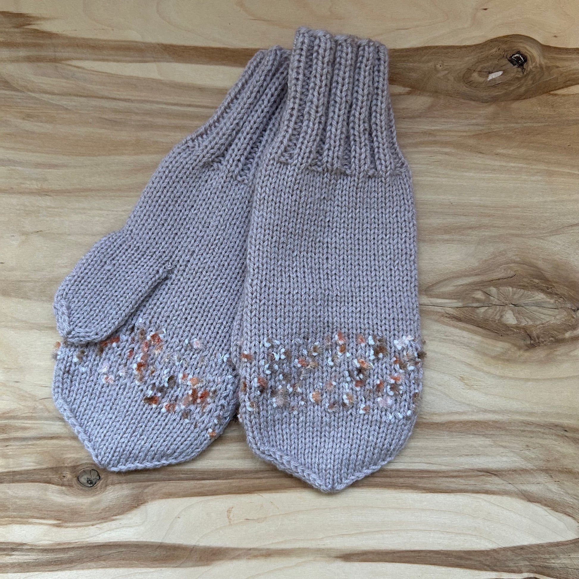 Rokām adīti dūraiņi bēšā krāsā ar dekoratīvas dzijas ielaidumu plaukstas daļā un gludi adītu plaukstas pārējo daļu 24x 10cm (garums x platums).