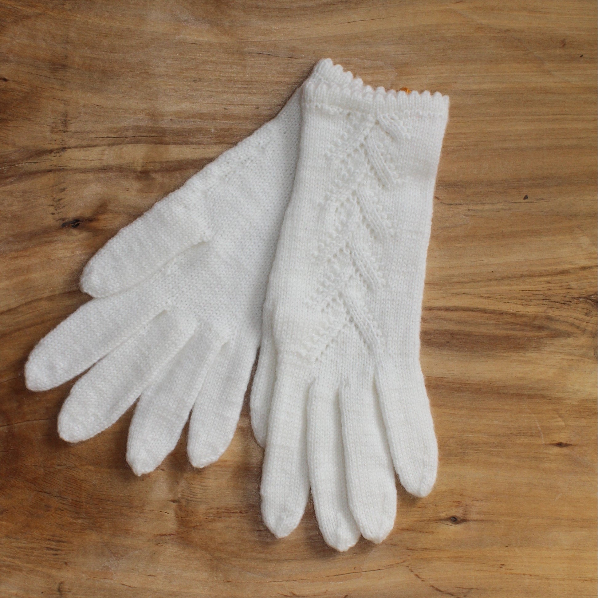 Rokām adīti balti pirkstaiņi no vilnas dzijas (superwash comfort 75% SW vilna, 25% poliamīds) ar dekoratīvu rombiņu raksta adījumu plaukstas virspusē 23 x 8 cm (garums x platums).
