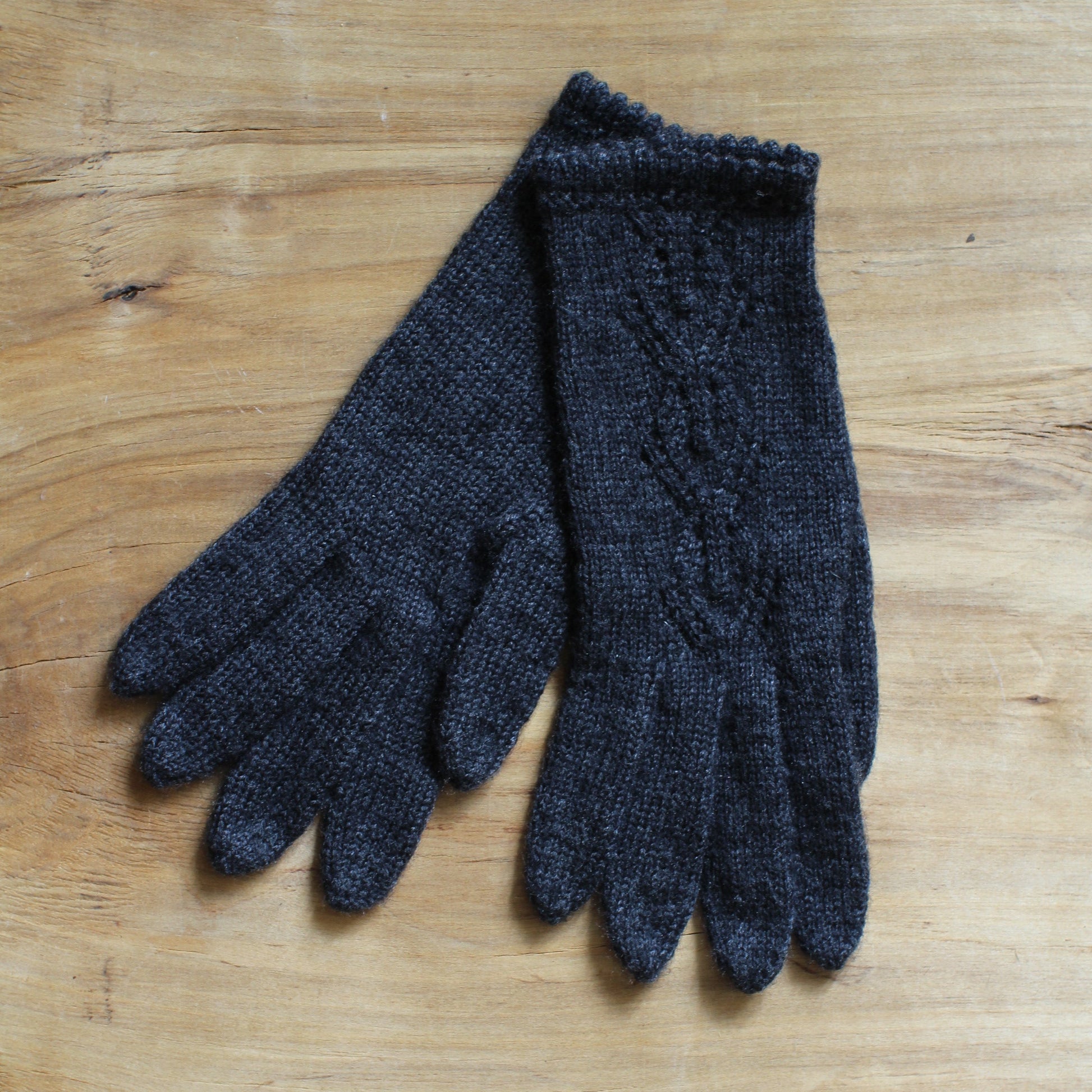 Rokām adīti tumši pelēki pirkstaiņi ar mežģīņu romba rakstu plaukstas virspusē (INVA 35)