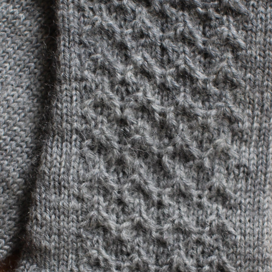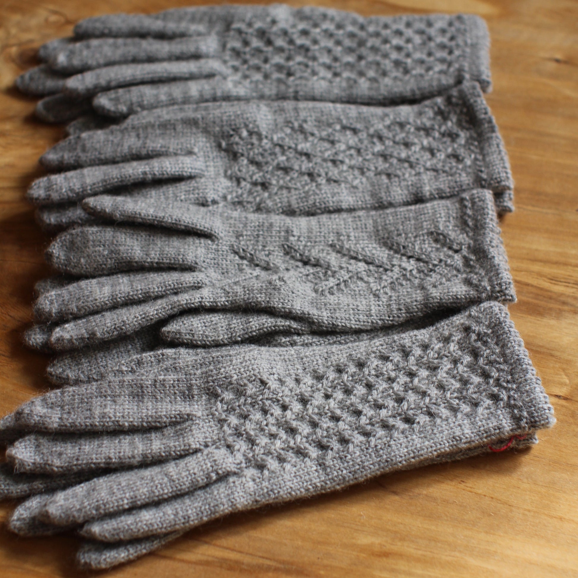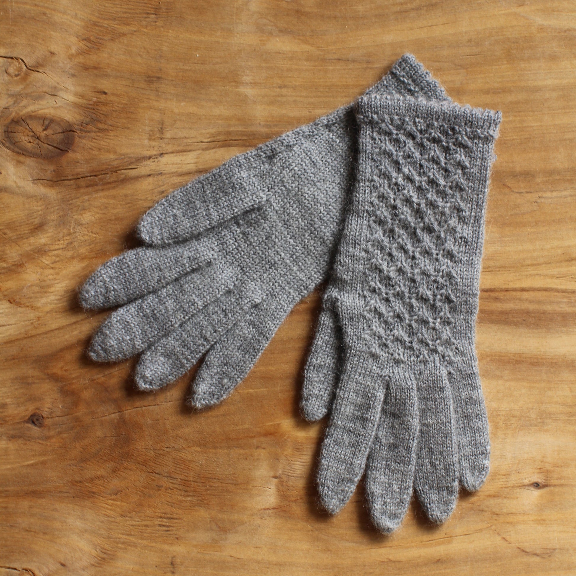 Rokām adīti gaiši pelēki pirkstaiņi no vilnas dzijas (superwash comfort 75% SW vilna, 25% poliamīds) ar dekoratīvu rombiņu raksta adījumu plaukstas virspusē 23 x 8 cm (garums x platums).