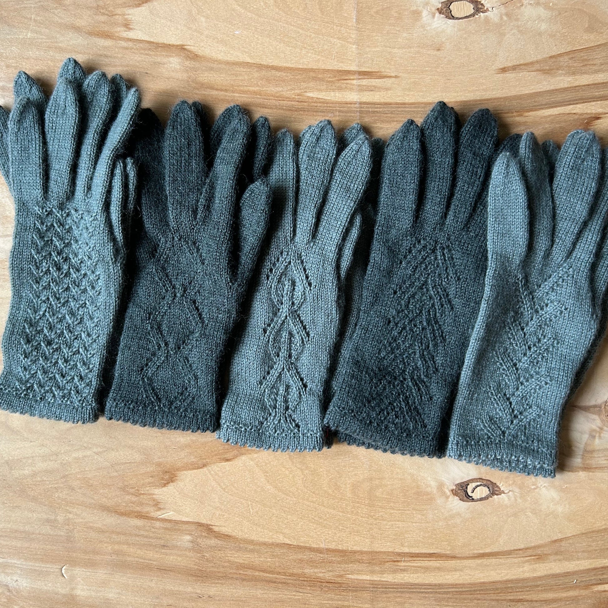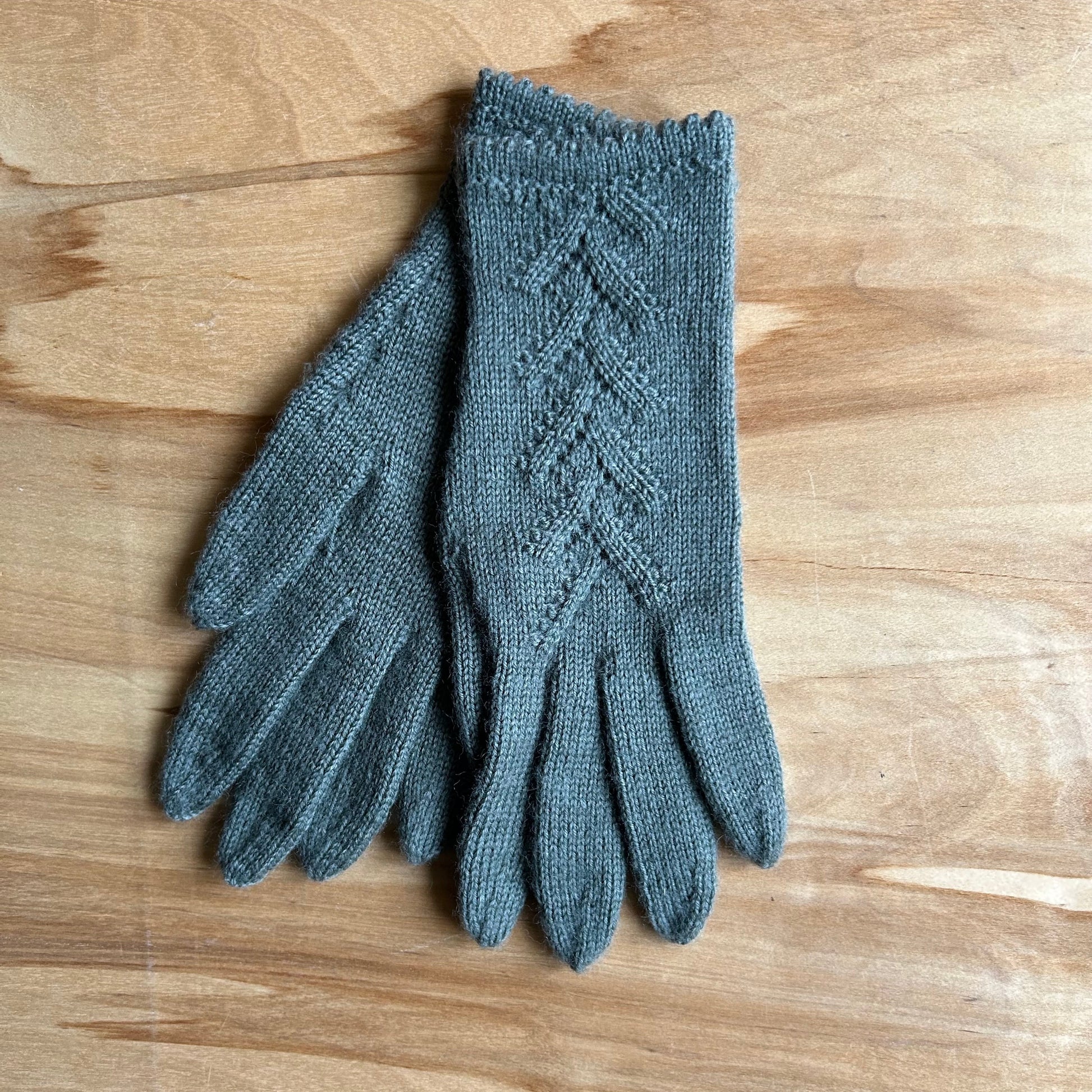 Rokām adīti gaiši pelēkzaļi pirkstaiņi no vilnas dzijas (superwash comfort 75% SW vilna, 25% poliamīds) ar dekoratīvu skujiņasraksta adījumu plaukstas virspusē 23 x 8 cm (garums x platums).