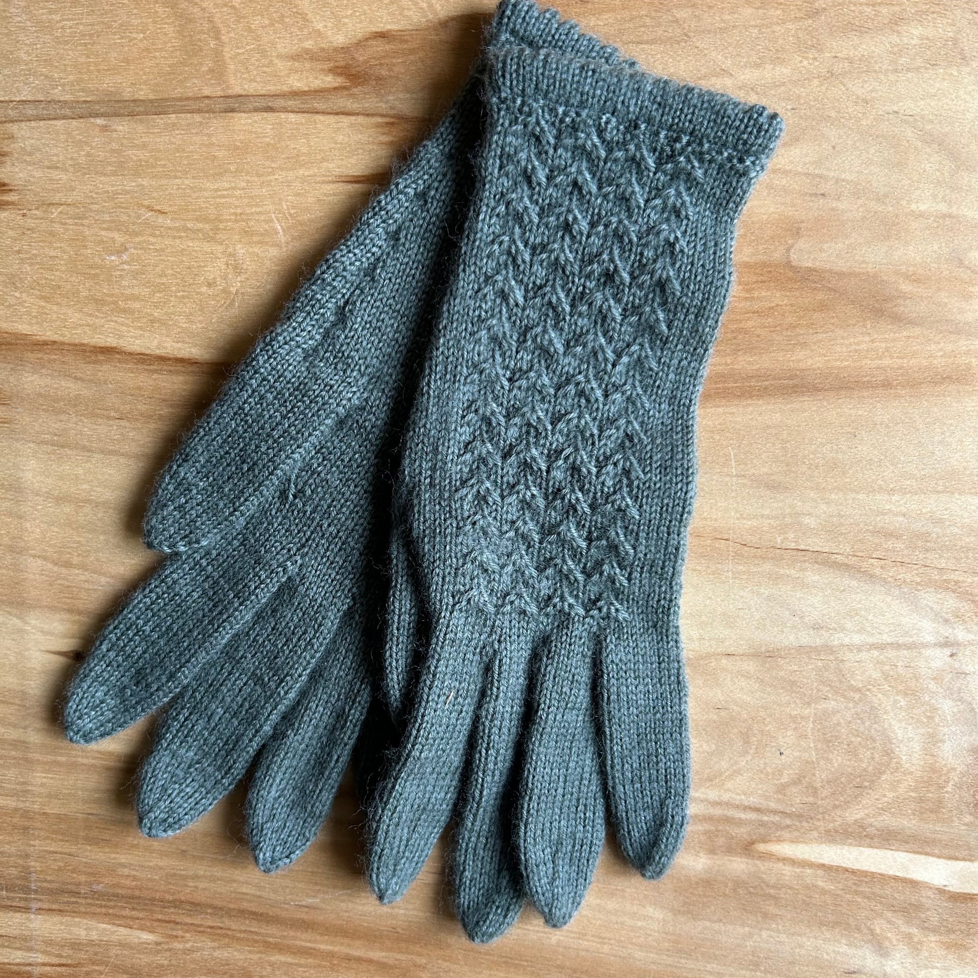 Rokām adīti gaiši pelēkzaļi pirkstaiņi no vilnas dzijas (superwash comfort 75% SW vilna, 25% poliamīds) ar dekoratīvu smalku skujiņas raksta adījumu plaukstas virspusē 23 x 8 cm (garums x platums).