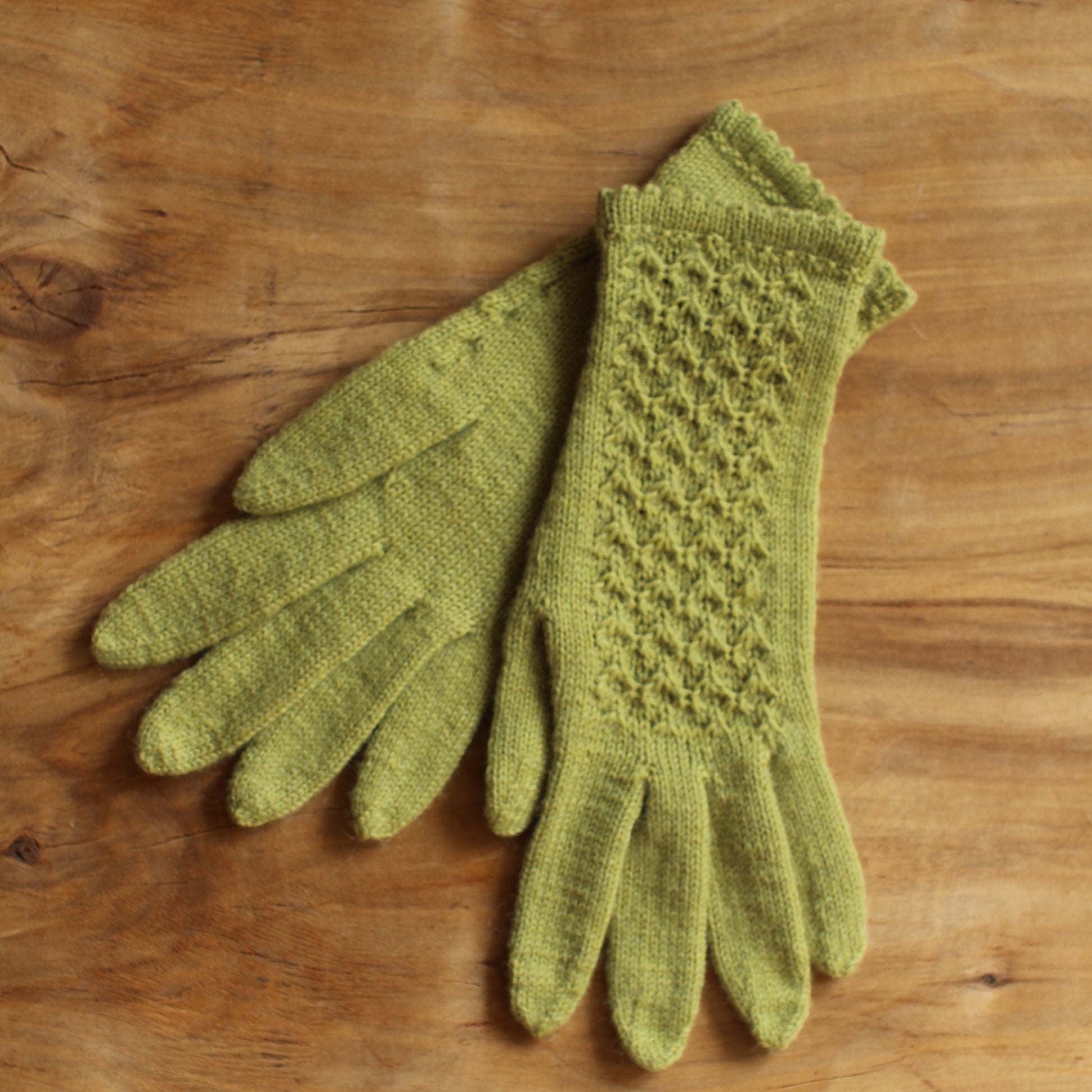 Rokām adīti dzeltenzaļi pirkstaiņi no vilnas dzijas (superwash comfort 75% SW vilna, 25% poliamīds) ar dekoratīvu rombiņu raksta adījumu plaukstas virspusē 23 x 8 cm (garums x platums).