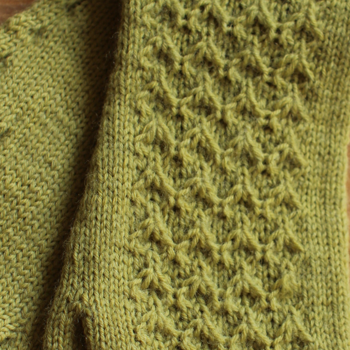 Rokām adīti dzeltenzaļi pirkstaiņi ar rombiņu rakstu plaukstas virspusē (INVA 47)